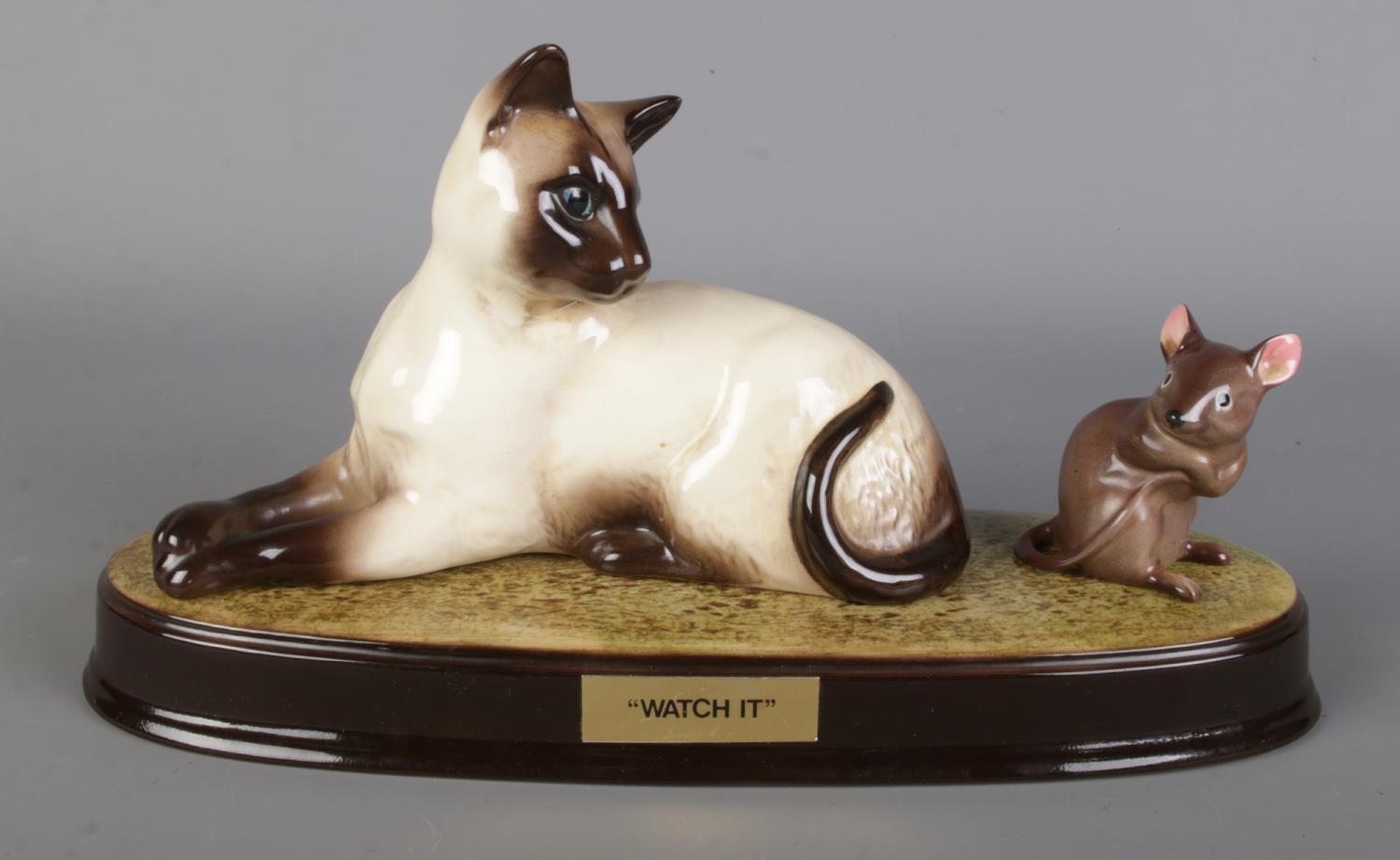 A Beswick laying Siamese cat and mouse on Beswick stand 'Watch It'.