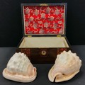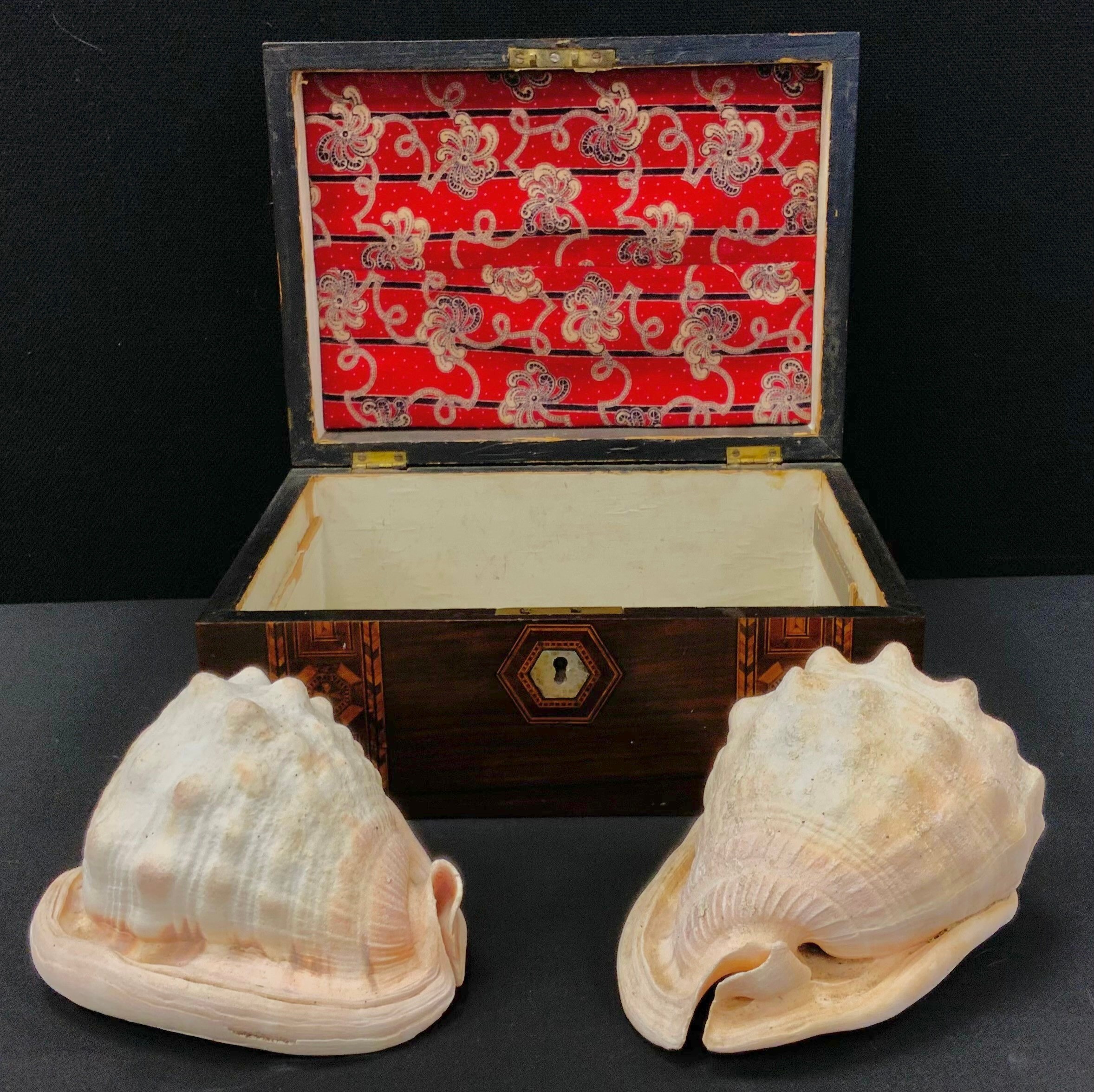 A Victorian walnut Tunbridge ware work box, vacant mother of pearl hexagonal cartouche, c.1870; conchs shells and coral specimen