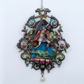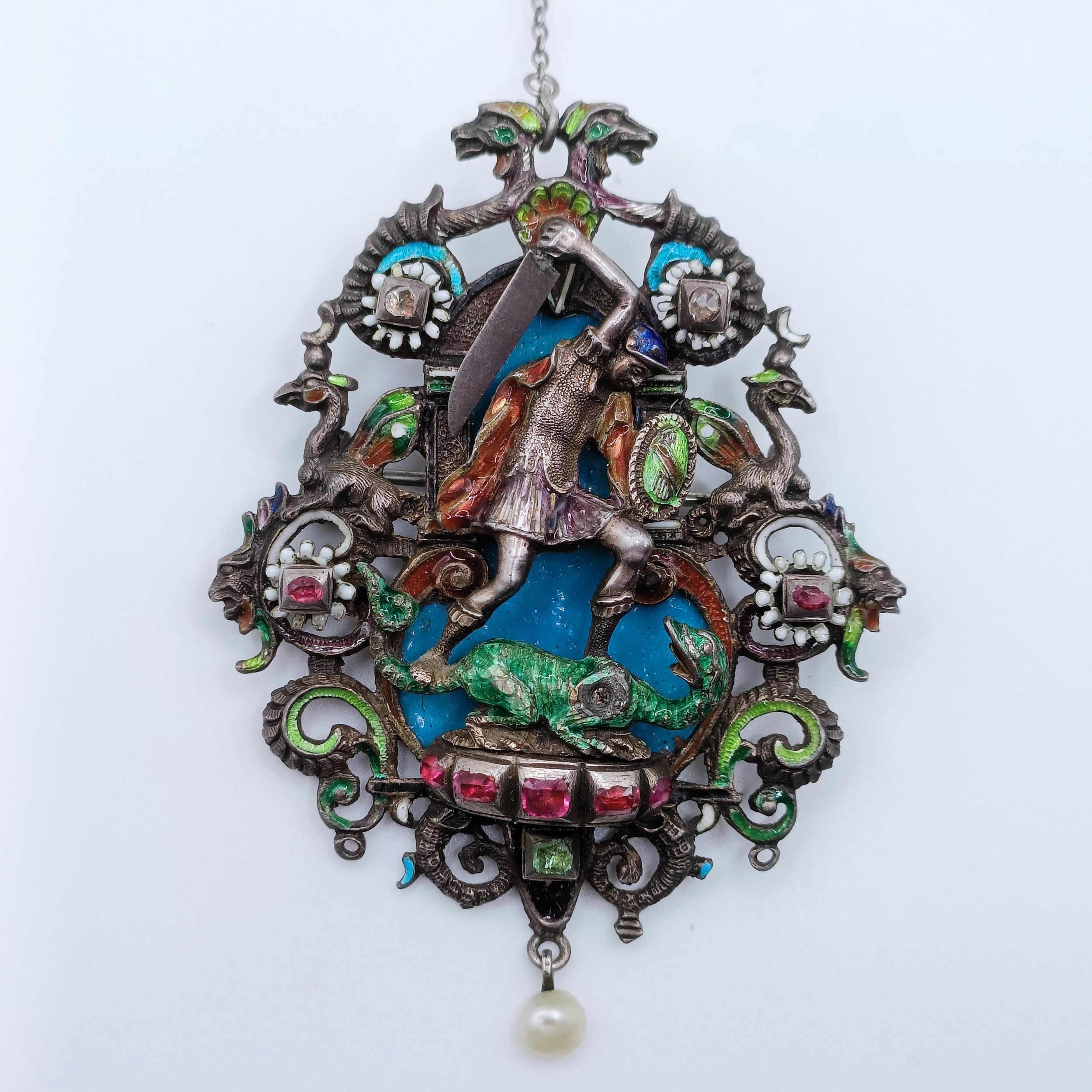 An Austro-Hungarian silver coloured metal, enamel and jewelled brooch, decorated a knight slaying a dragon, 35.8 g all in