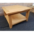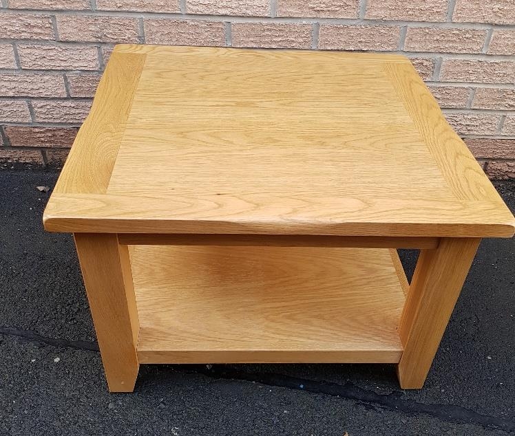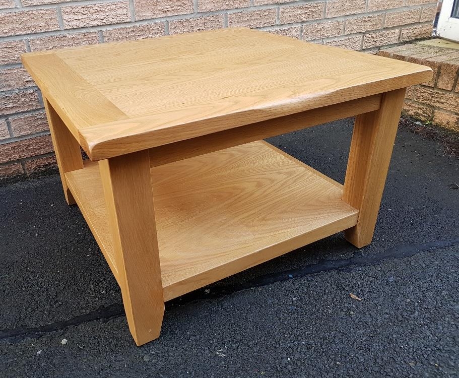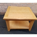 Modern Solid Light Oak Coffee Table with shelf underneath. Measures 27 inches x 27 inches