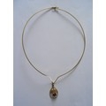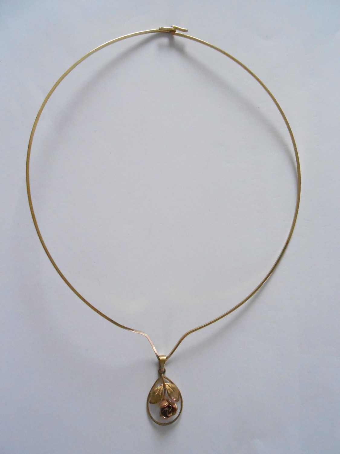 A 9ct. gold pendant of oval form with rose to the centre on a 9ct. gold shaped collar form necklace