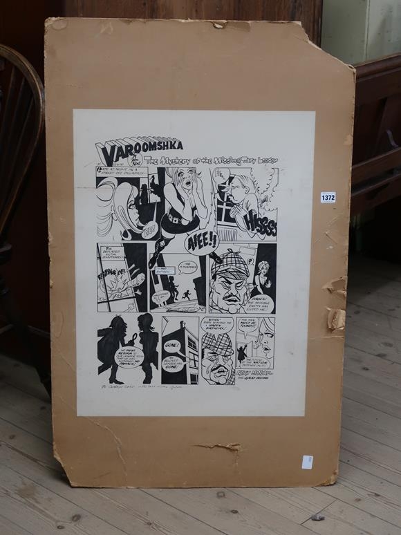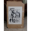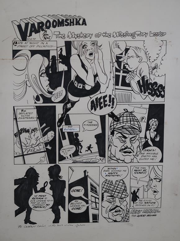 FRAMED B&W SATYRICAL CARTOON SKETCH BY JOHN KENT, THE MYSTERY OF THE MISSING TORY LEADER, 66CM X 47CM