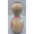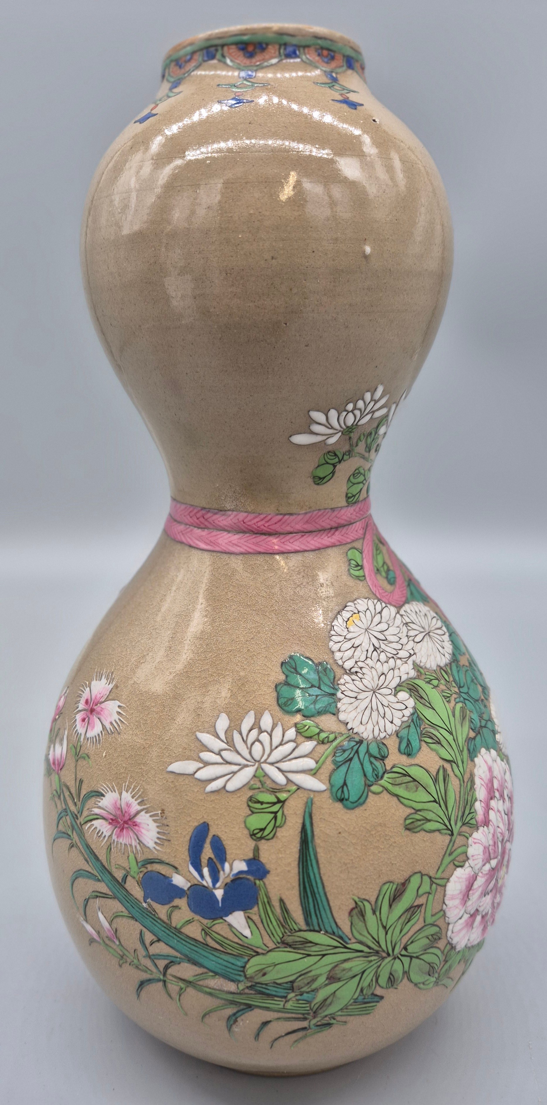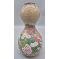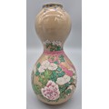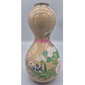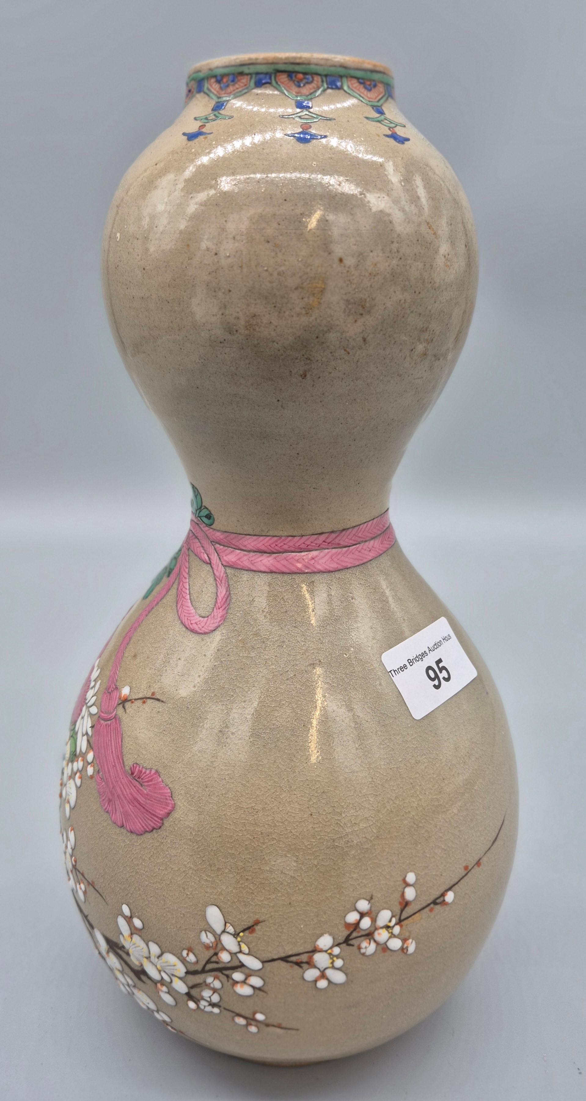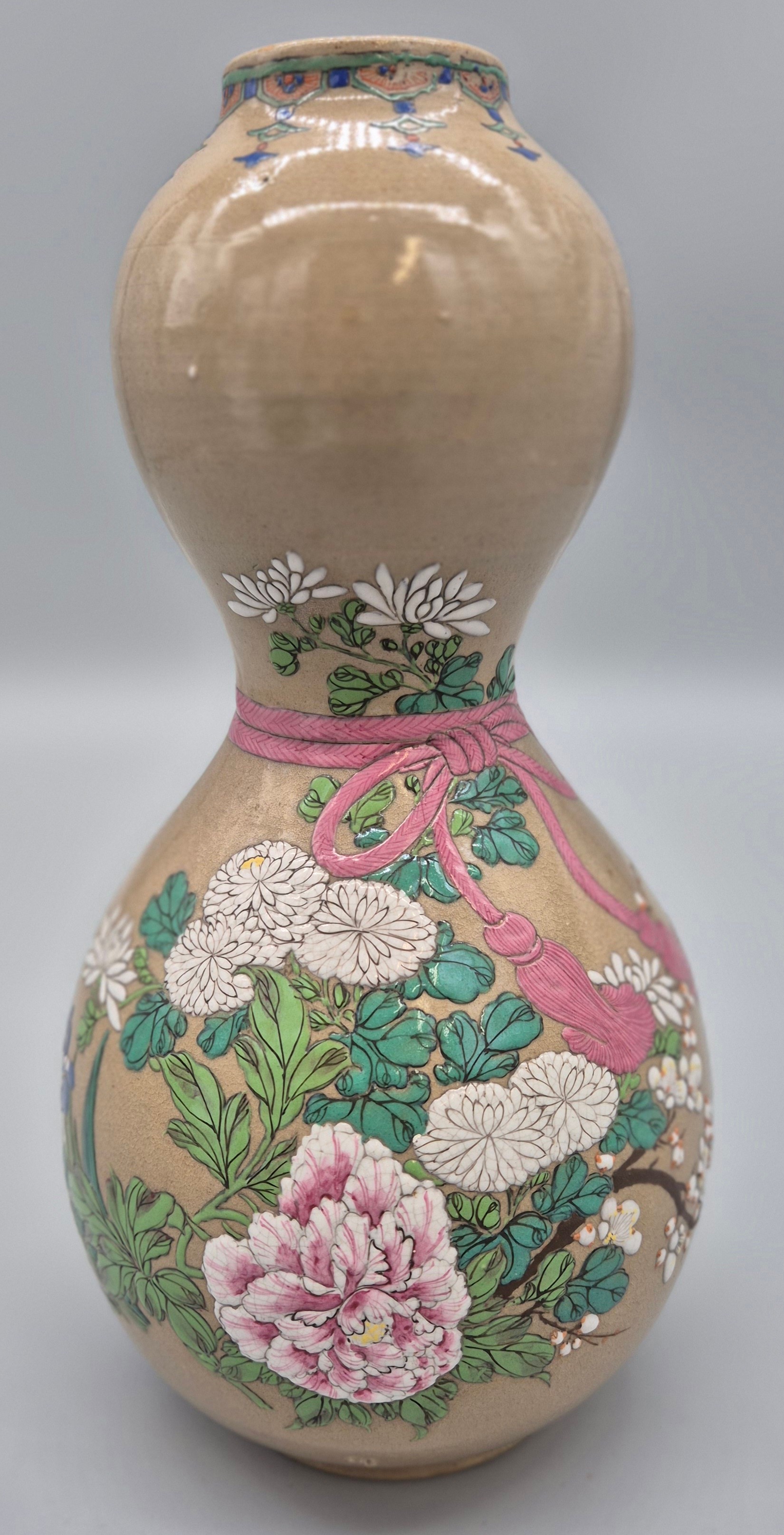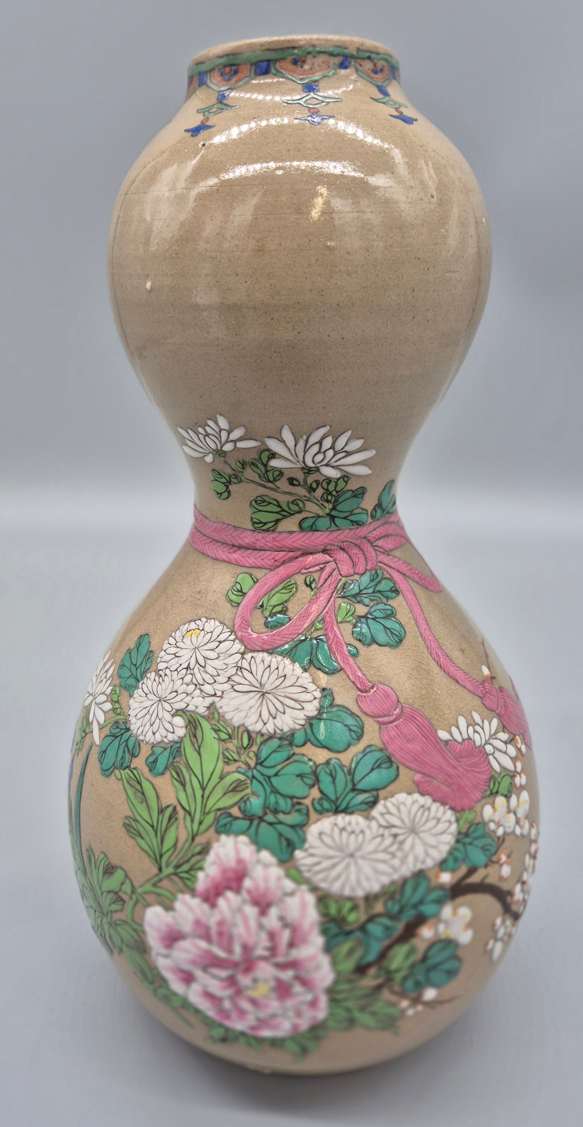 19th century Japanese Meiji period Gourd vase. Enamel painted raised relief flower design and pink cord tied around the vase and finished with a bow. Intricate design to the rim. [30.5cm high]