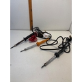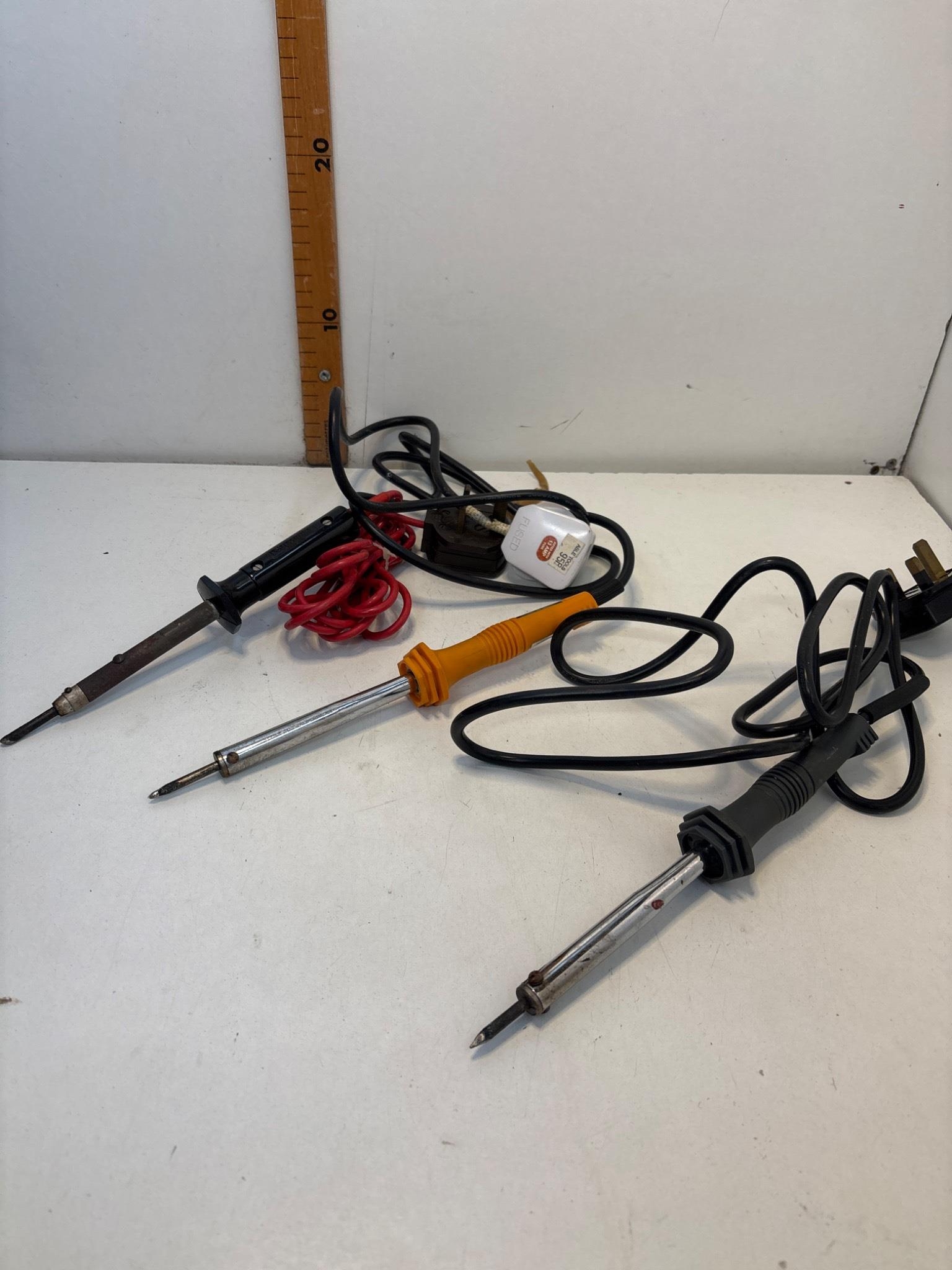 Three soldering irons with various handles and plugs, appearing used but in functional condition.