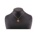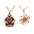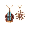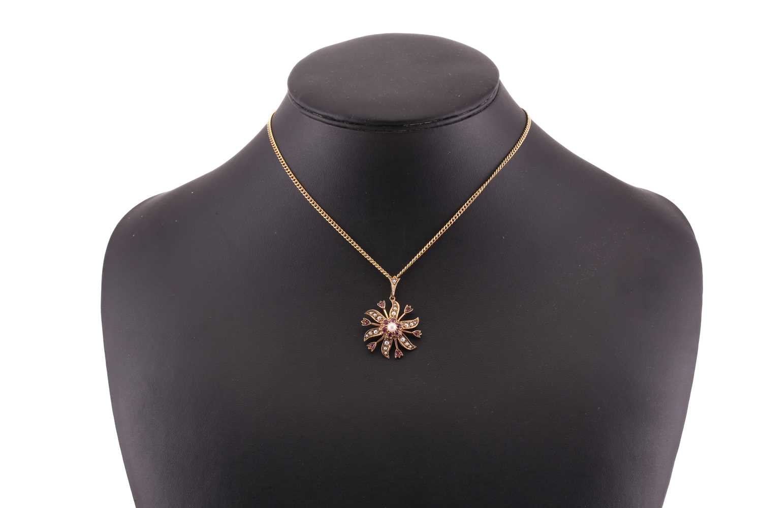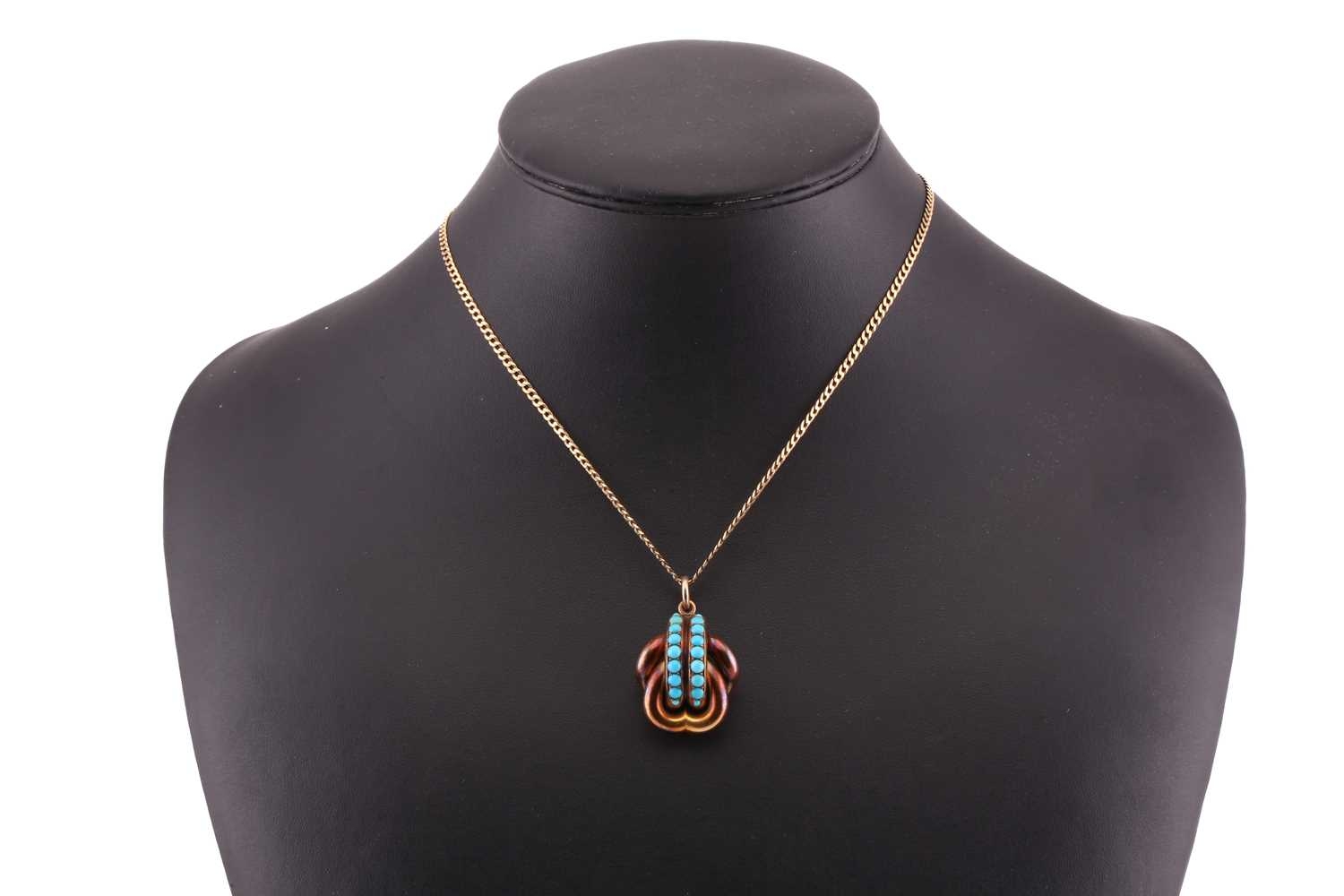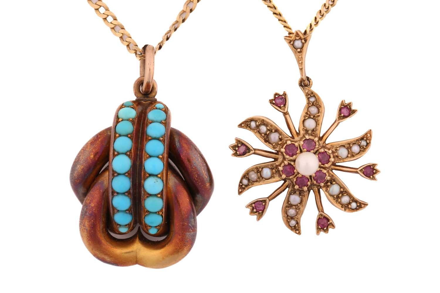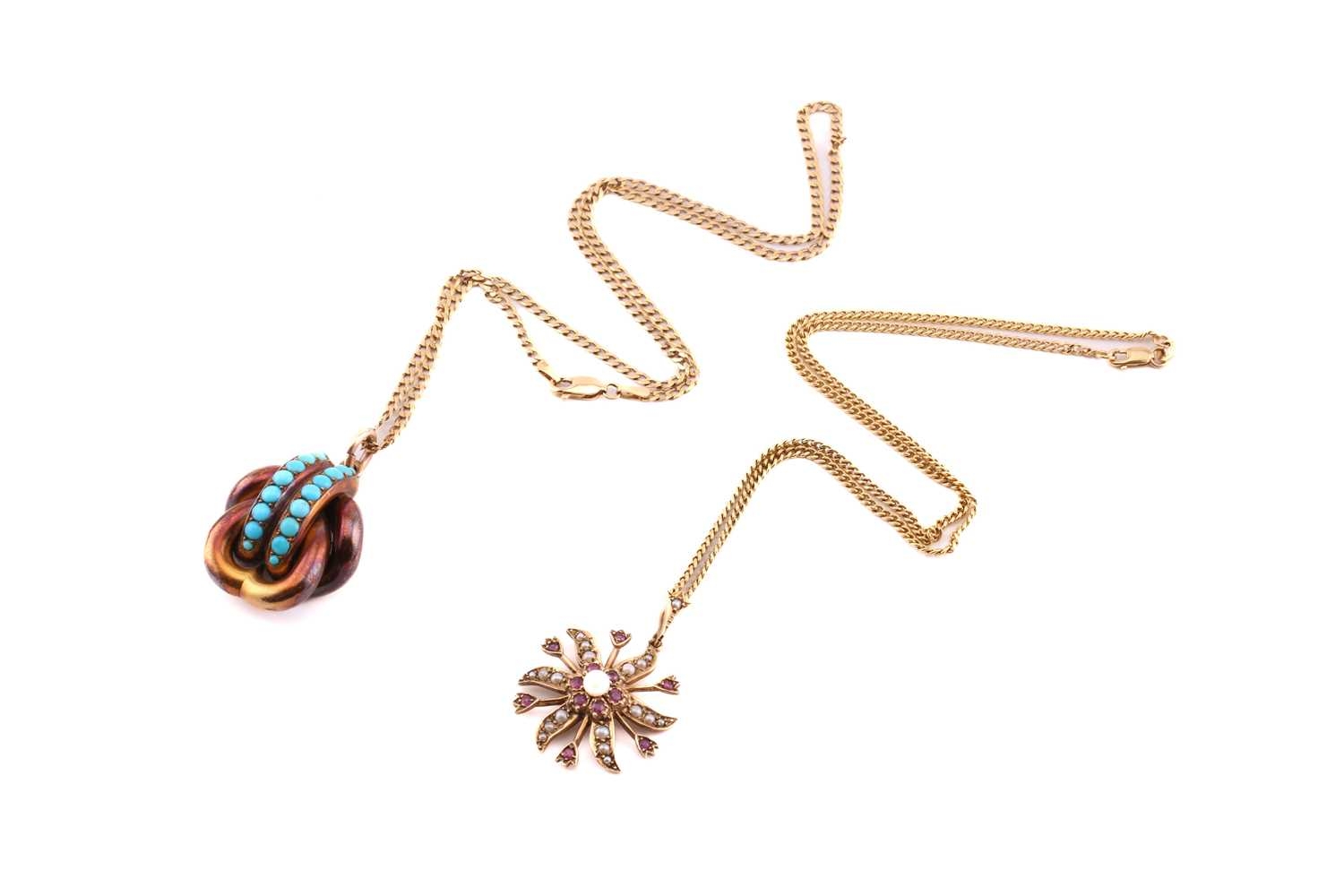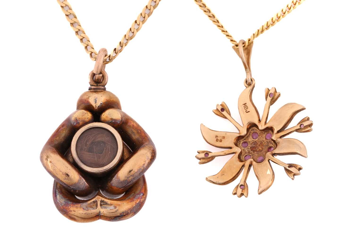 Two gem-set pendants on chain; to include a floral pendant with seed pearls and rubellite accents, on a 9ct gold mount and a stylised bail, connected to a curb chain, London hallmarked as '375' and maker's mark 'HBJ', dated 1983, pendant measures 3.8 cm including bail, chain measures 41.0 cm; A Etruscan-style pendant with turquoise cabochons, a glazed locket contains strands of hair on the reverse, connected to a curb chain, chain marked '9kt', pendant drop length measures 4.0 cm including bail, chain measures 46.0 cm; Total weight of items 26.3 grams (2).