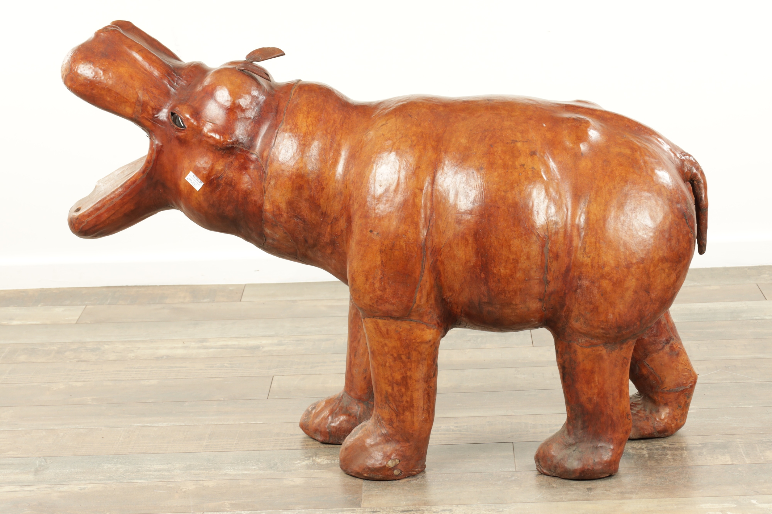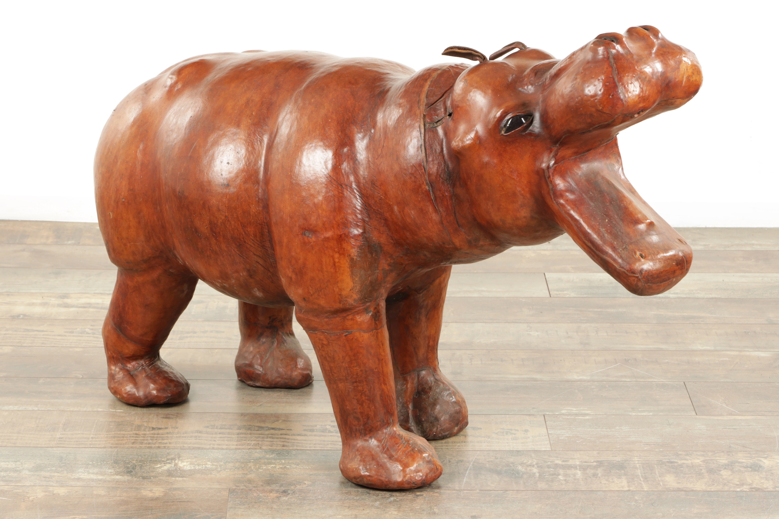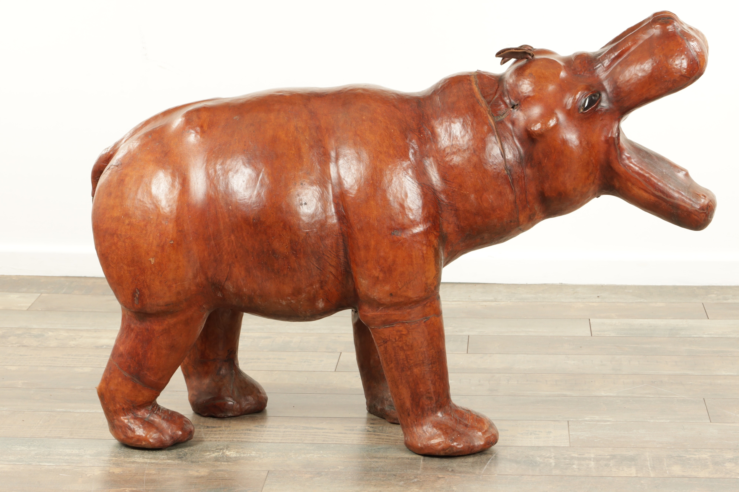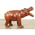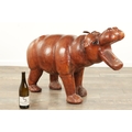 A LARGE VINTAGE LEATHER BOUND SCULPTURE OF A HIPPOPOTAMUS in the manner of Liberty having glass eyes (93cm wide 64cm high )