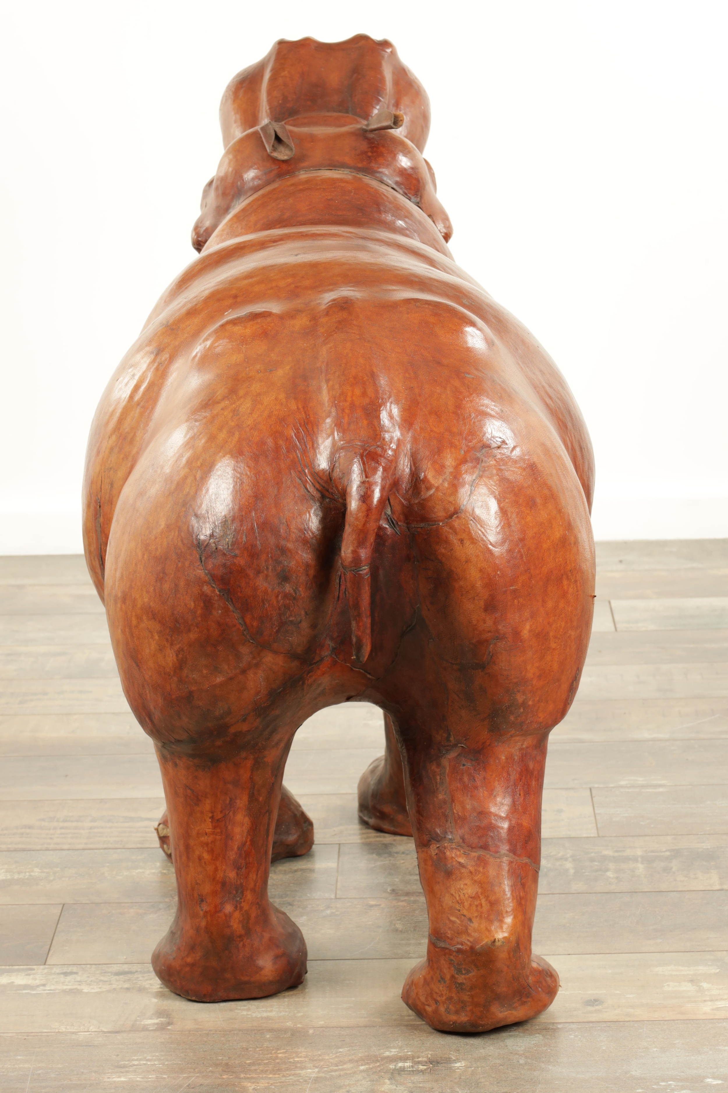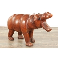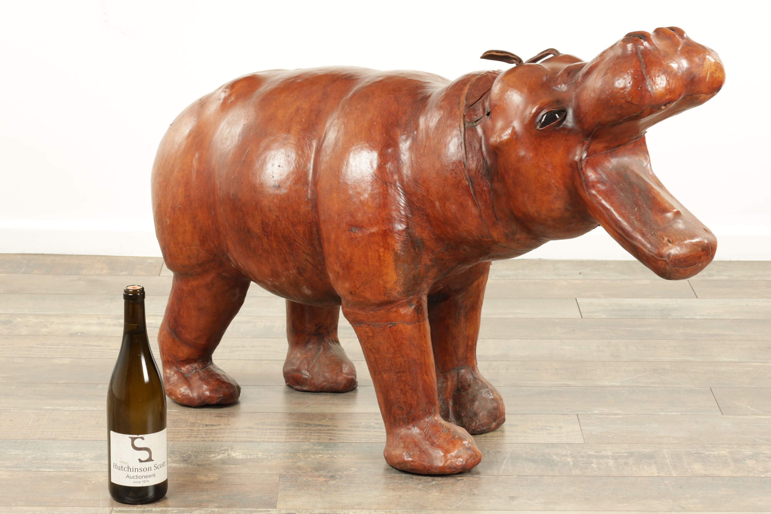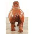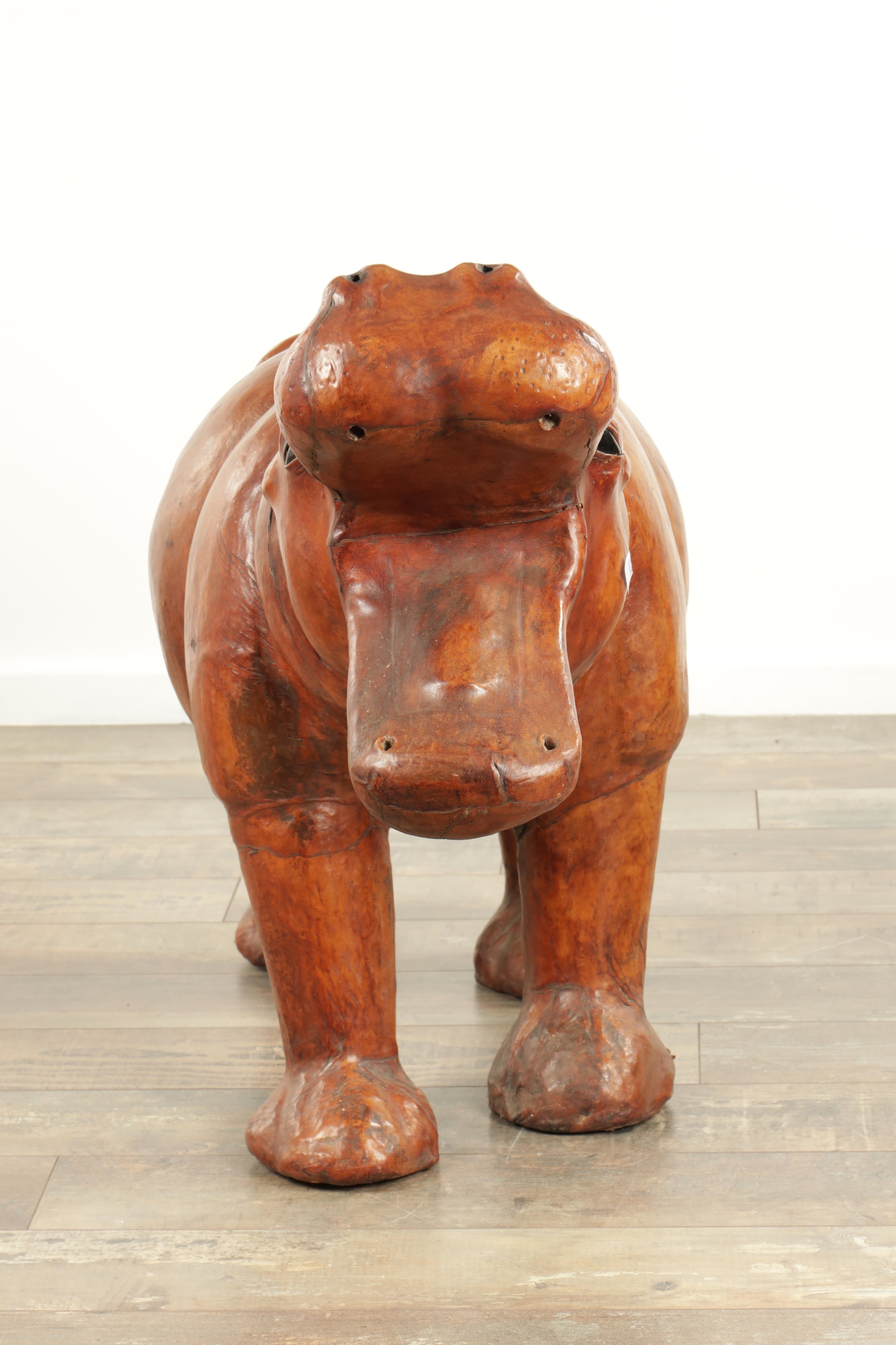 A LARGE VINTAGE LEATHER BOUND SCULPTURE OF A HIPPOPOTAMUS in the manner of Liberty having glass eyes (93cm wide 64cm high )