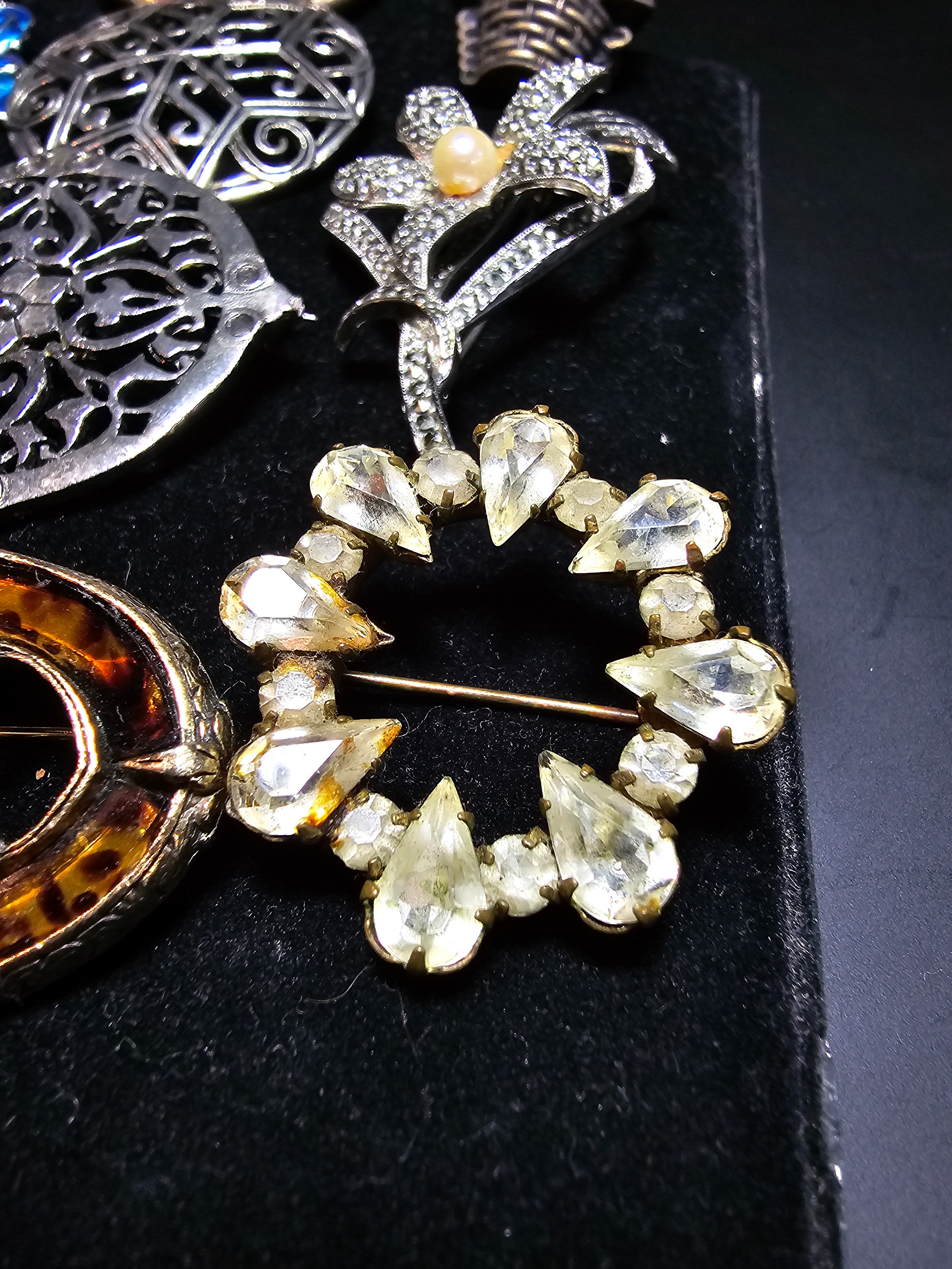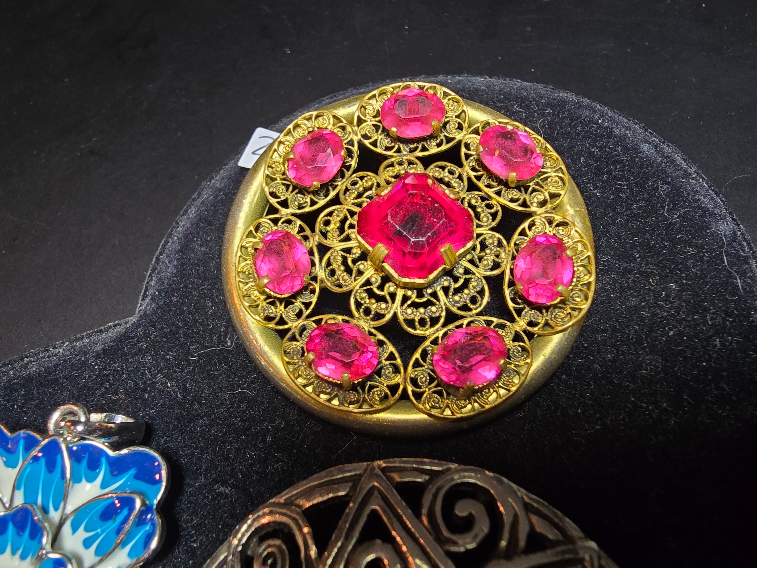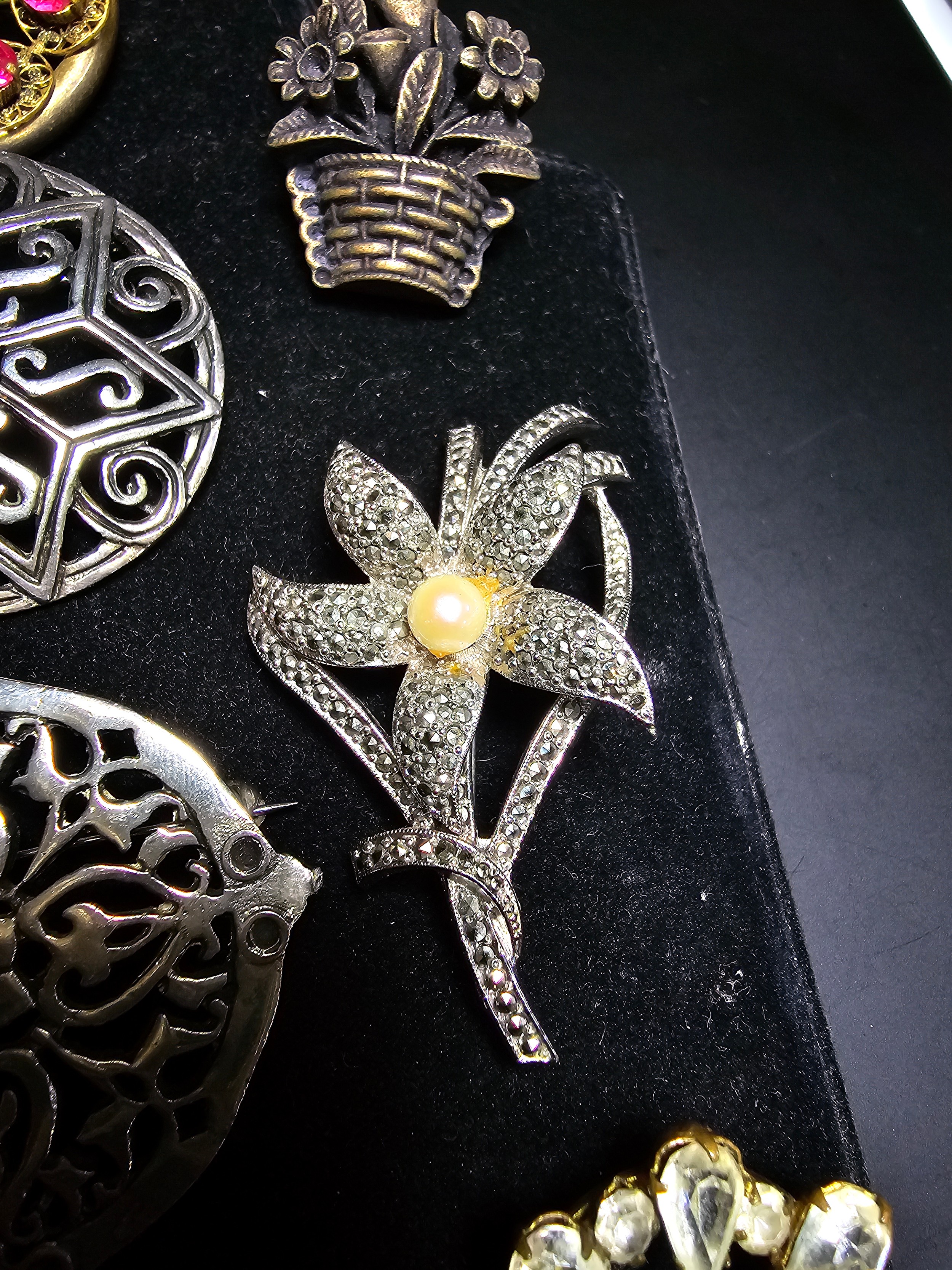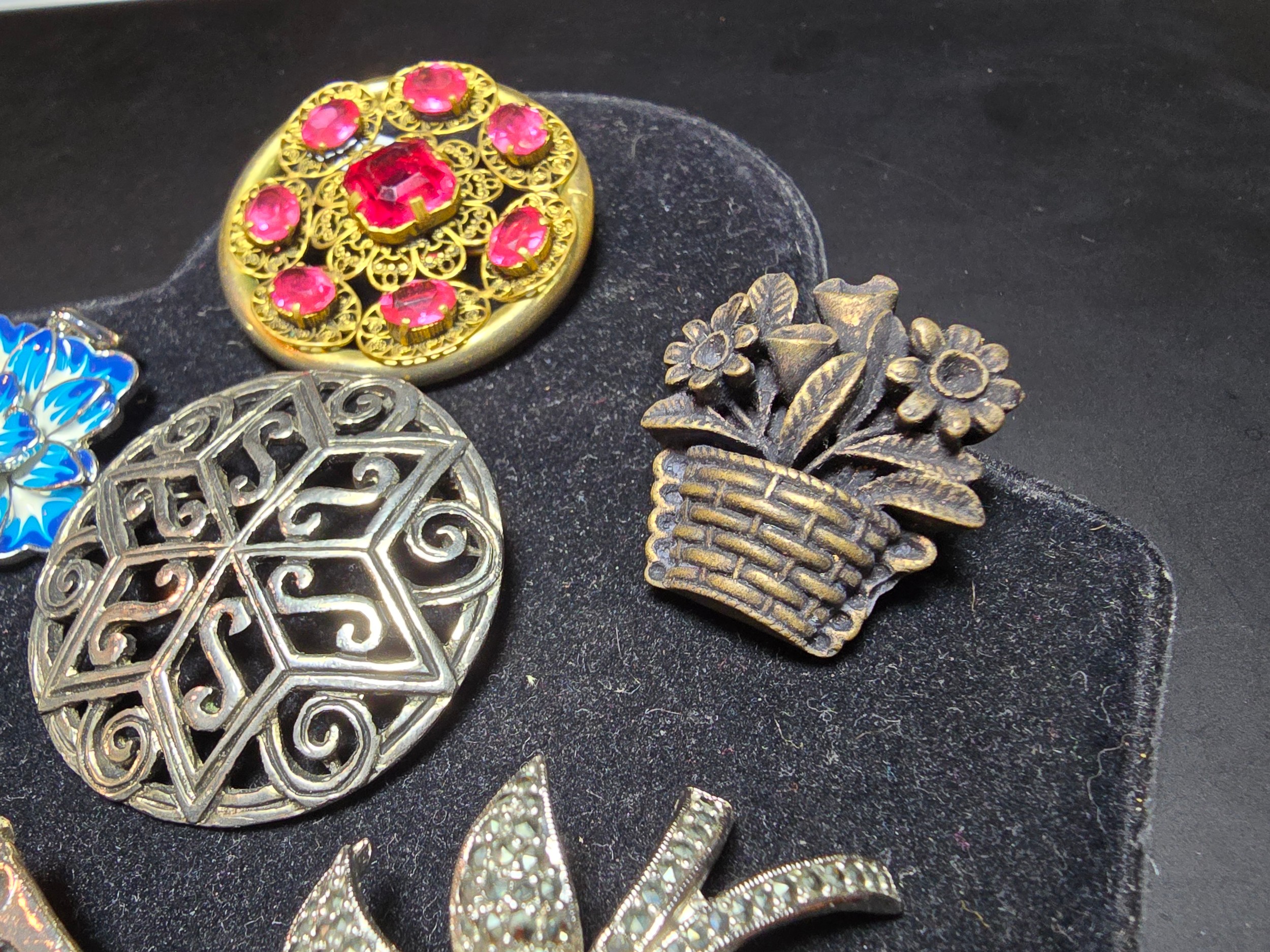 A suite of 11x various pretty vintage brooches to include a gilt filigree red jewelled brooch, an ornate flower brooch, an enamel blue flower pendant, etc. Display board is not included!
