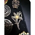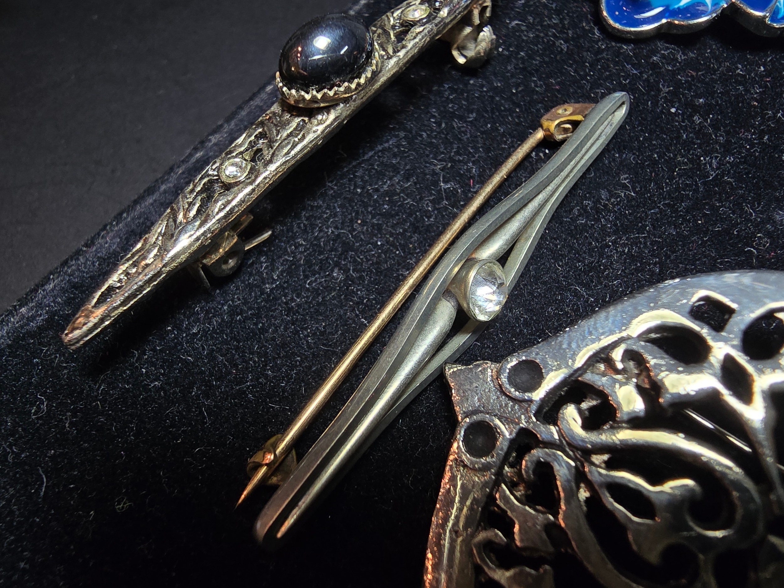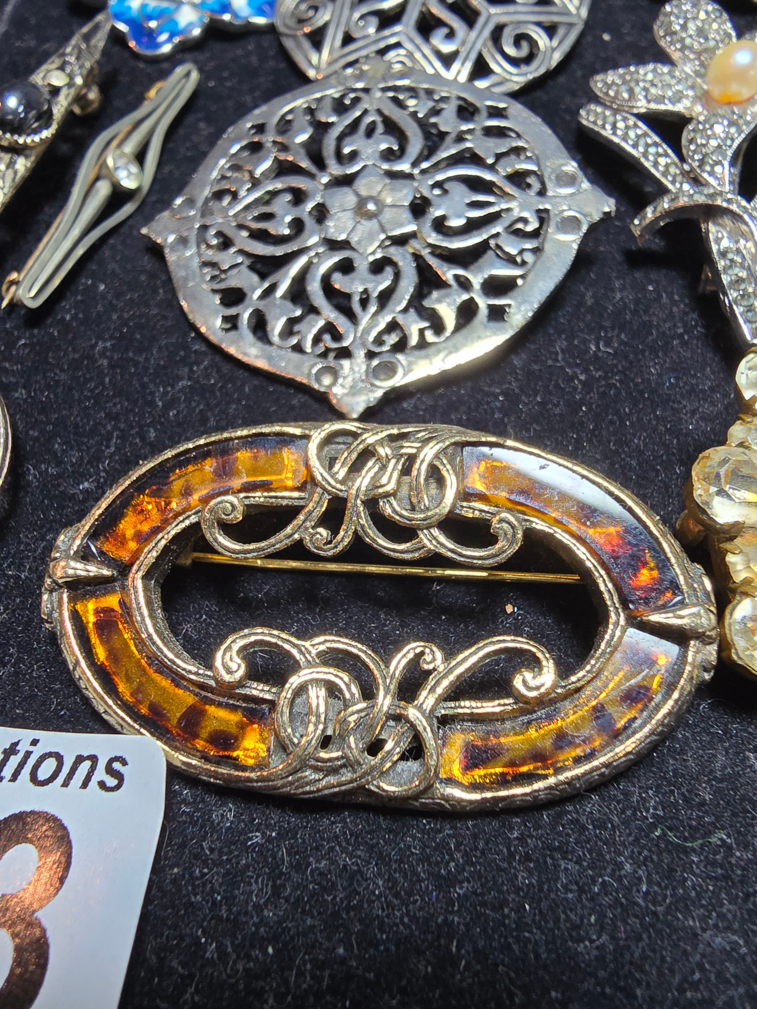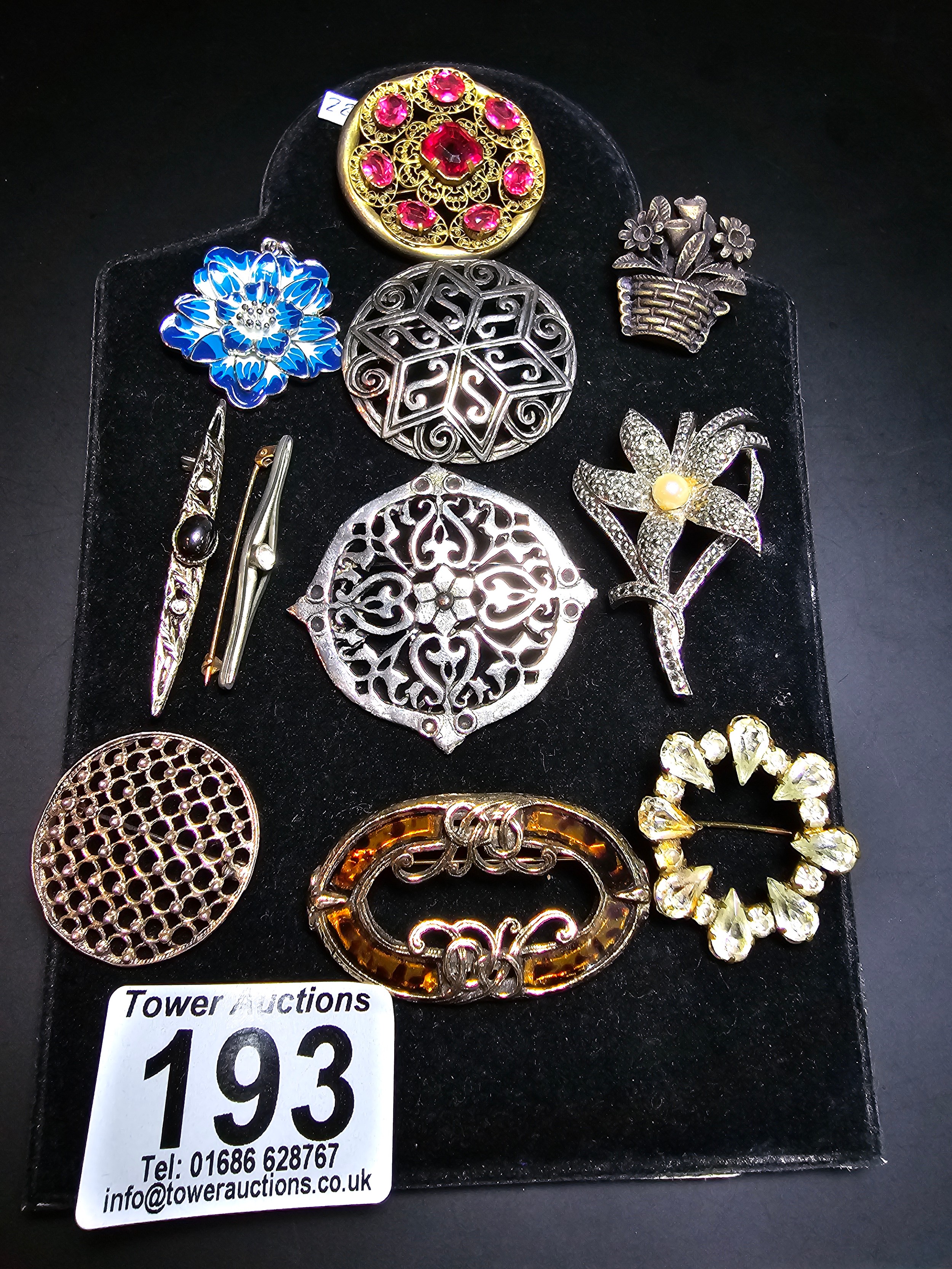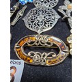 A suite of 11x various pretty vintage brooches to include a gilt filigree red jewelled brooch, an ornate flower brooch, an enamel blue flower pendant, etc. Display board is not included!