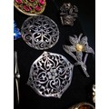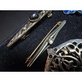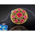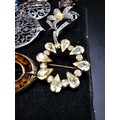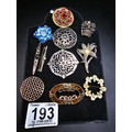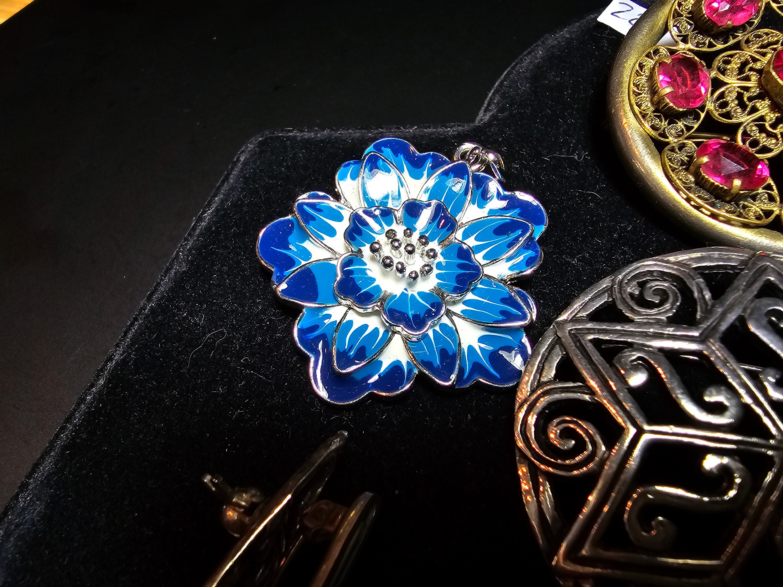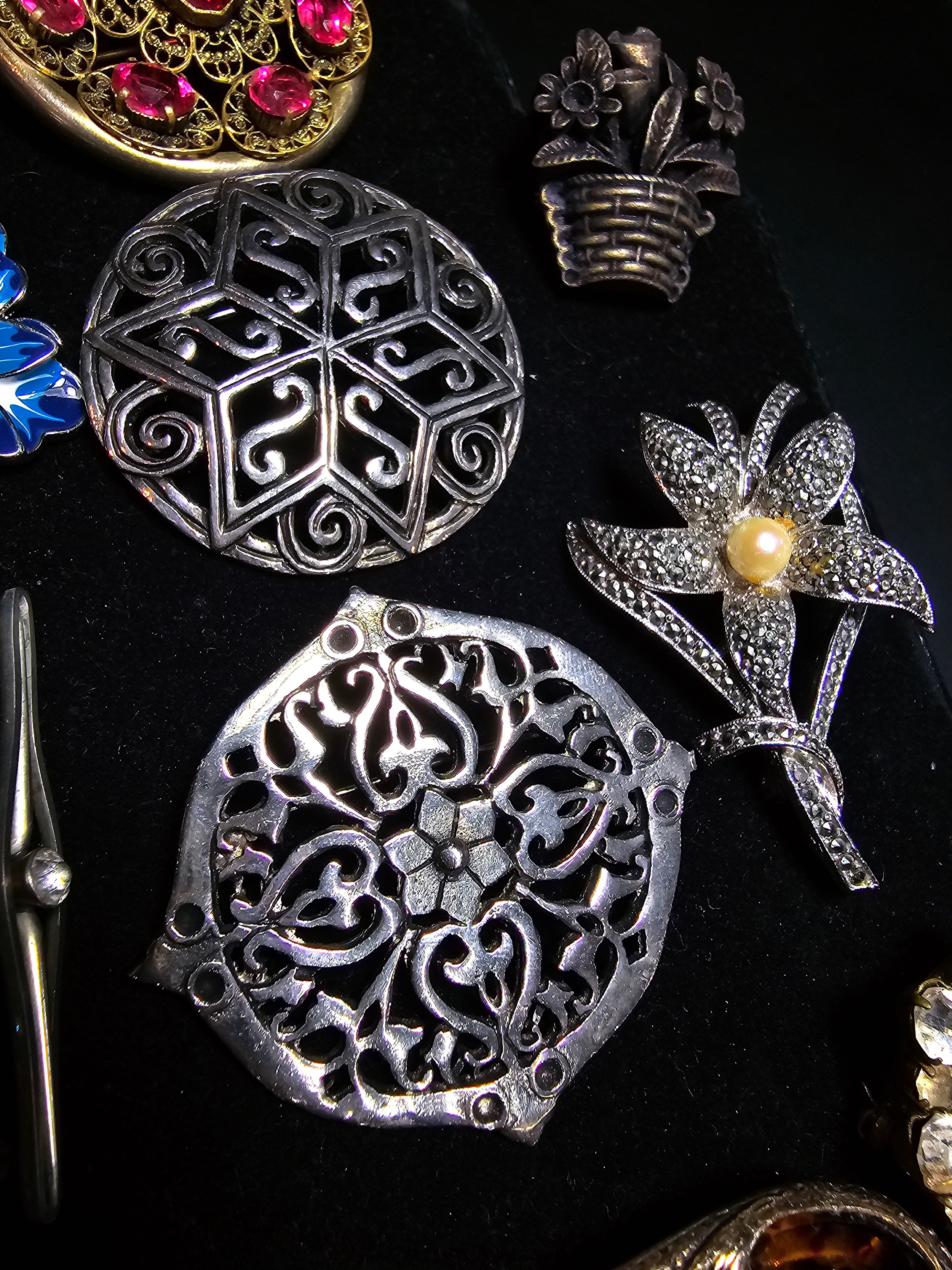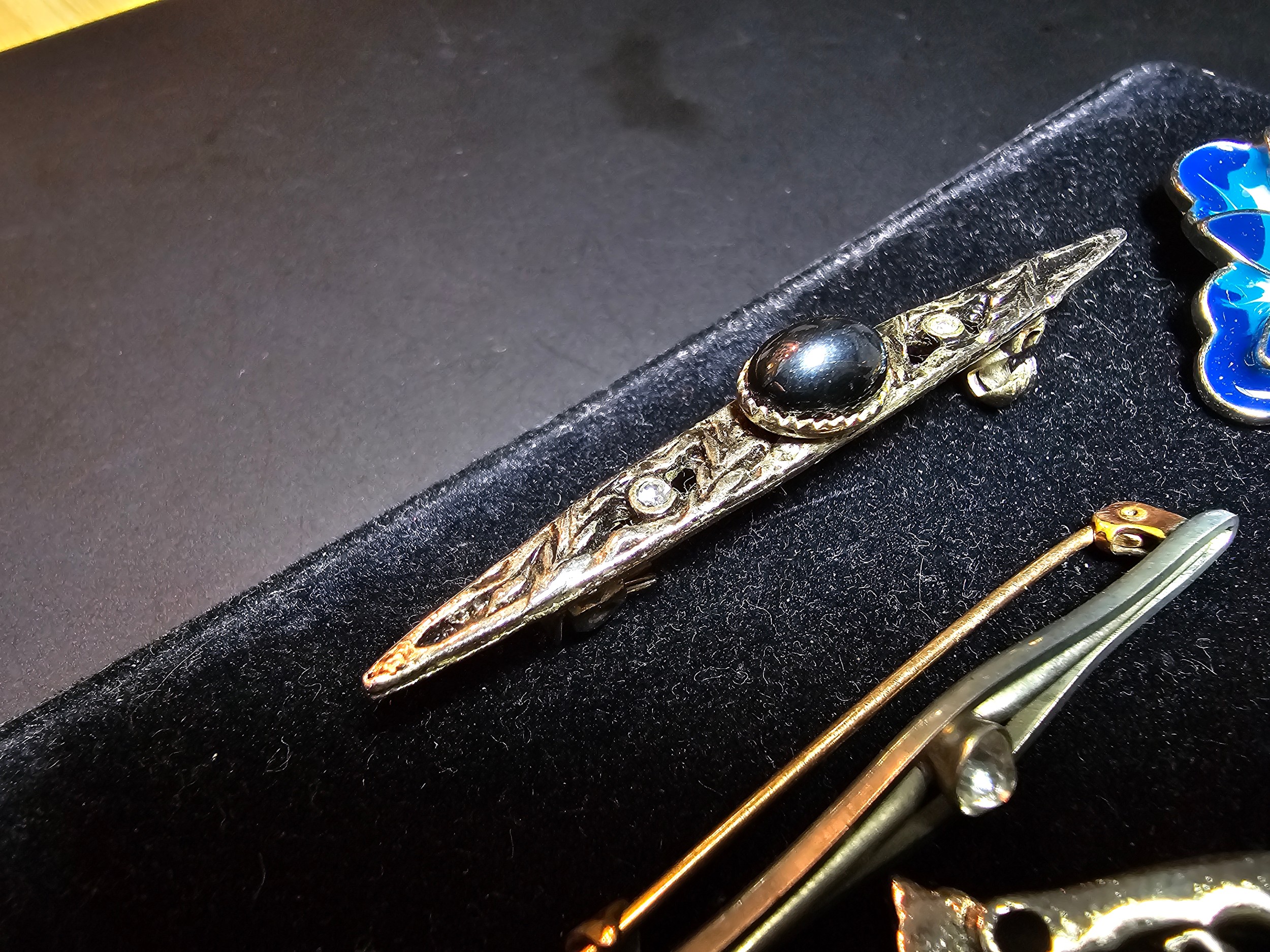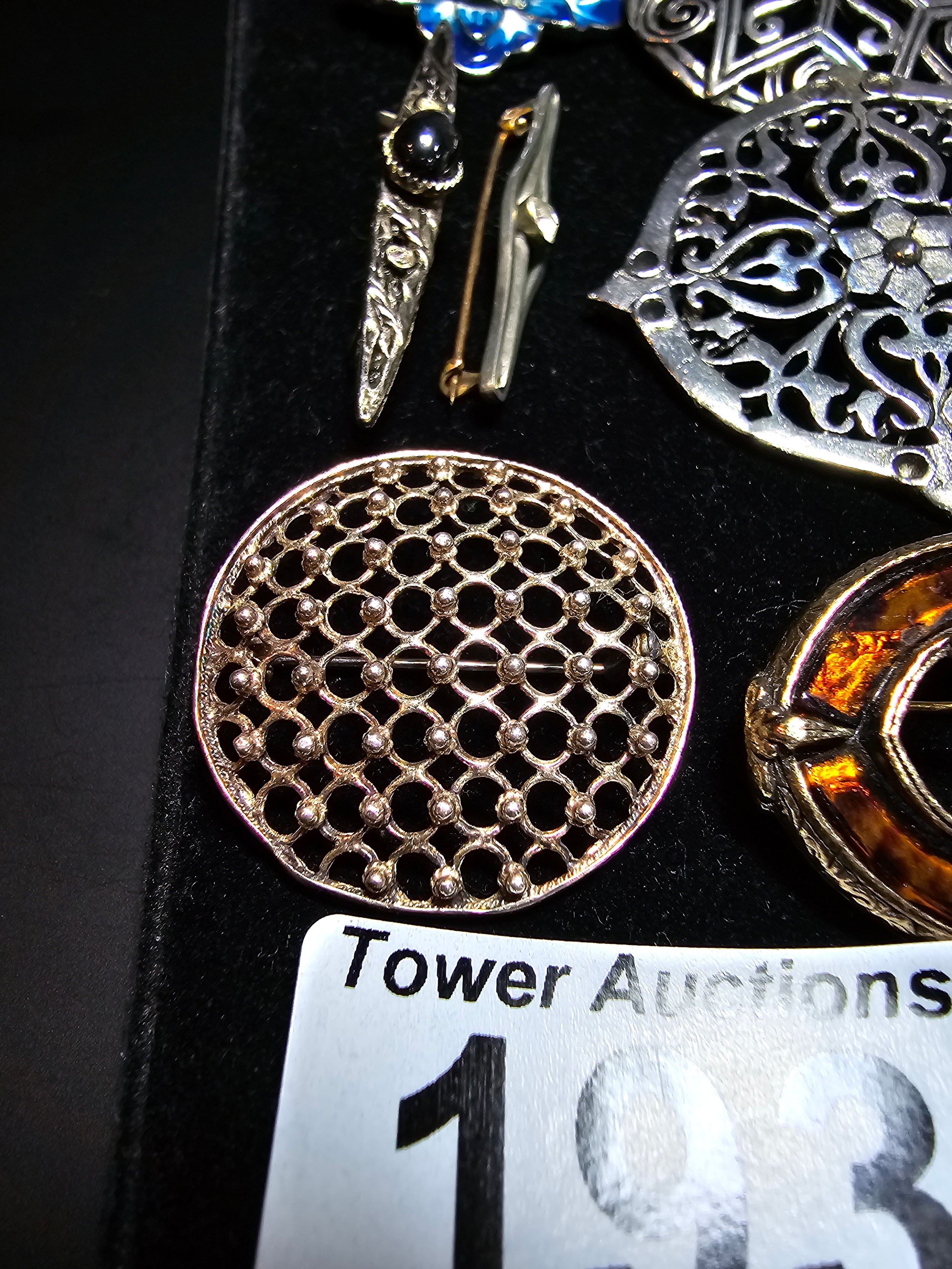A suite of 11x various pretty vintage brooches to include a gilt filigree red jewelled brooch, an ornate flower brooch, an enamel blue flower pendant, etc. Display board is not included!