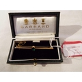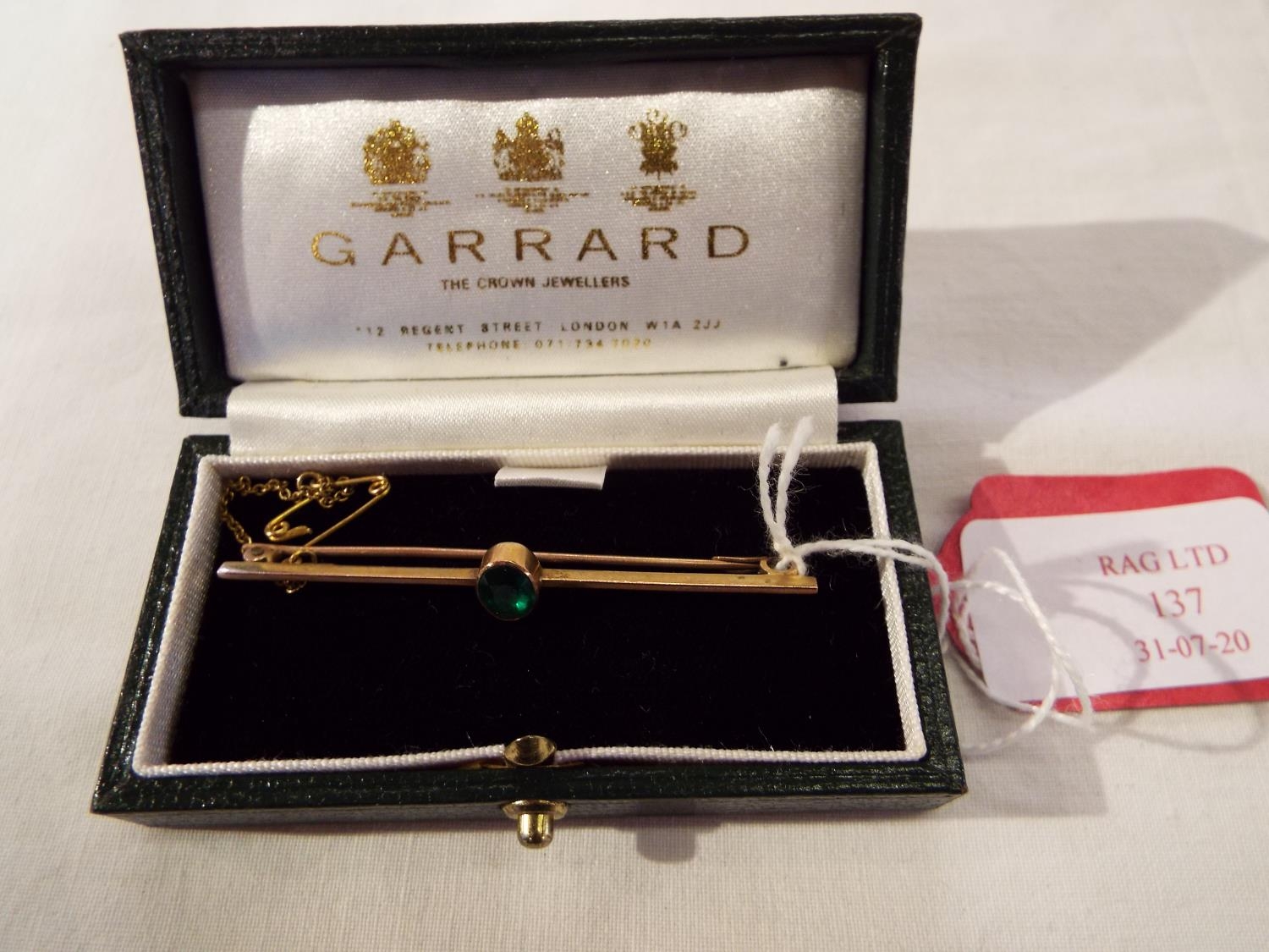 A 9ct gold bar brooch inset with central emerald housed in a Garrard of London box