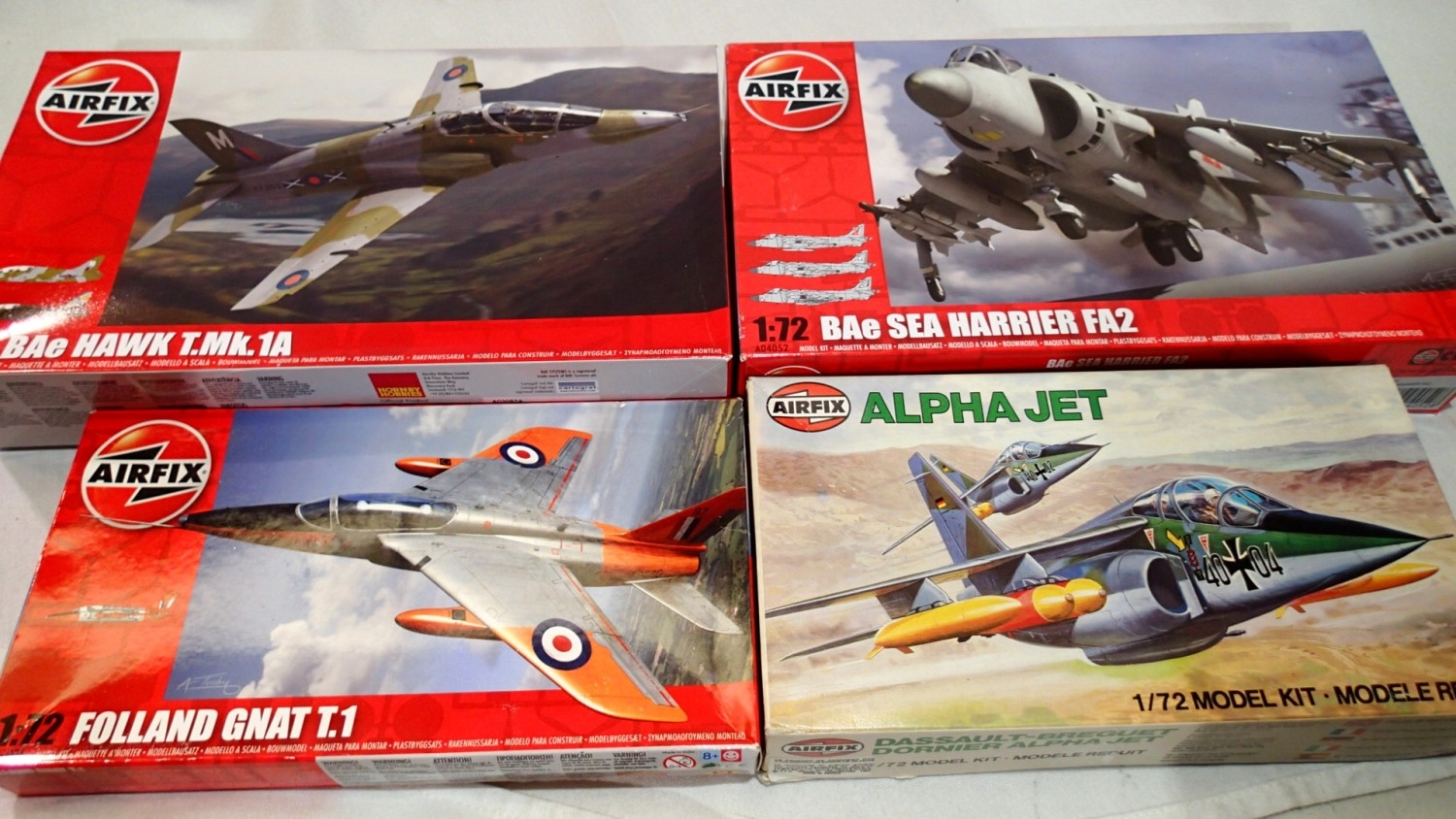 Four Airfix 1/72 scale jet aircraft kits, including 'Sea Harrier', unchecked, boxes with wear. UK P&P Group 2 (£24+VAT for the first lot and £5+VAT for subsequent lots)
