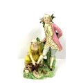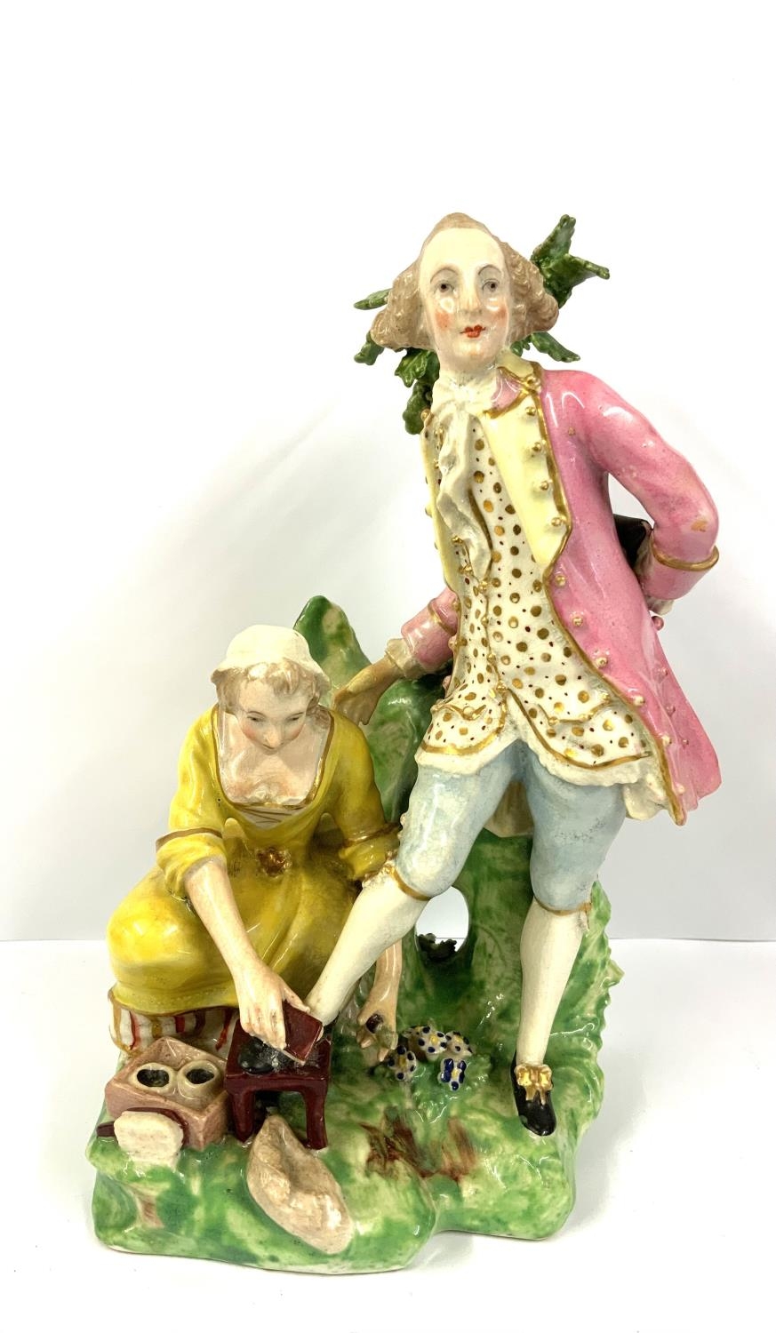 A Bloor Derby group figure of a shoeblack modelled as a girl polishing the shoes of a gentleman, 17cm, marked No.81, c.1820. (D) NO RESERVE