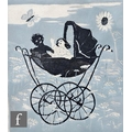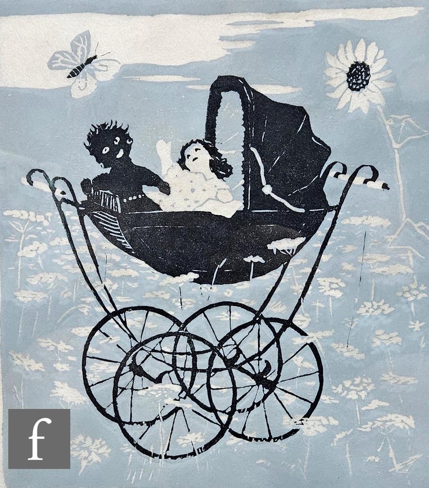Einar Rosen (1910-1998) - A woodblock print depicting two dolls in a pram to a garden setting, numbered 72/220, signed to the margin, 23cm x 29cm, framed.