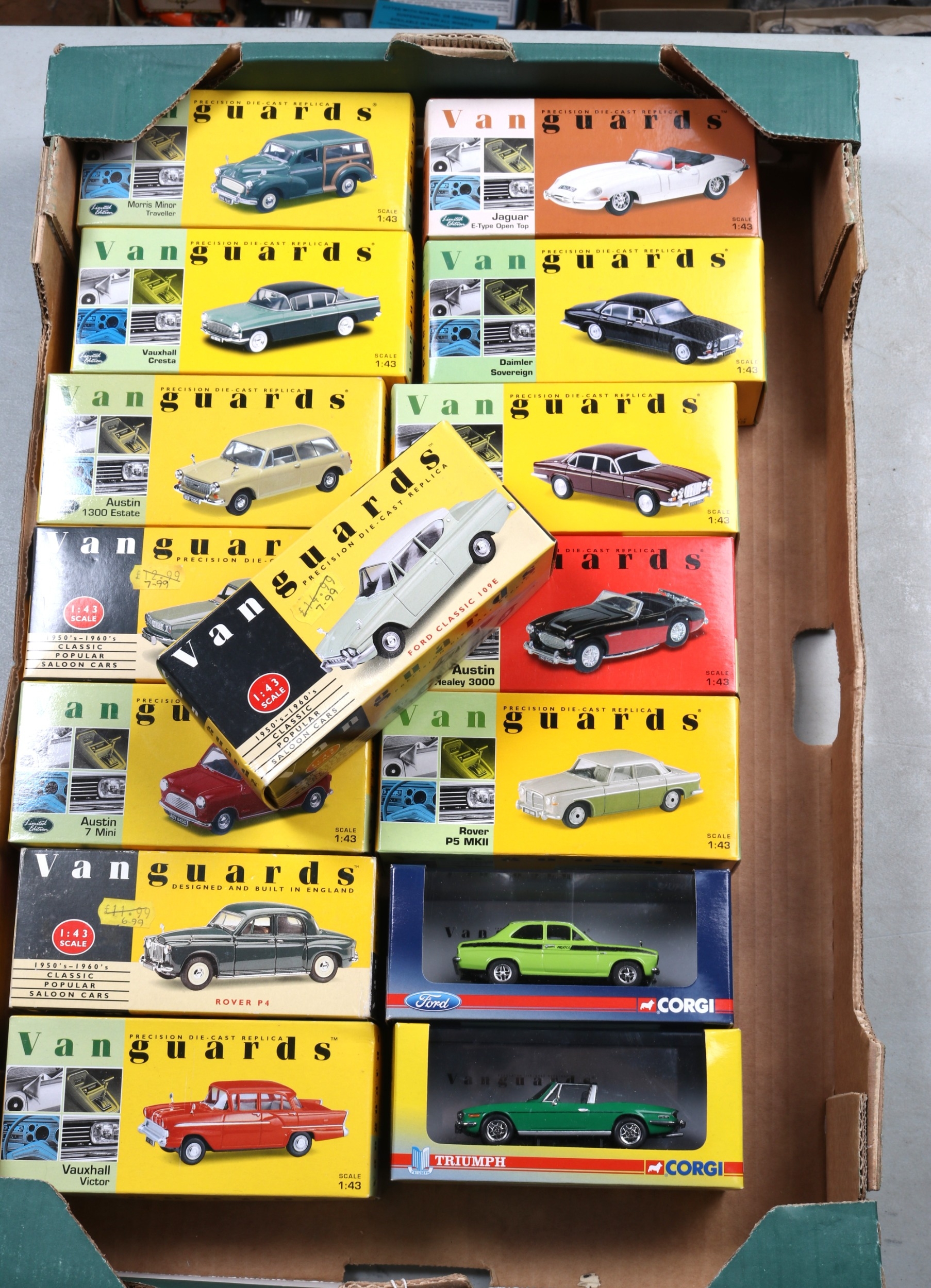 15 Vanguards. Triumph Stag, Ford Escort Mexico, Austin 7 Mini, Rover P5 Mk2, Austin Healey 3000, Jaguar XJ6 Series 1, Daimler Sovereign, Jaguar E Type Open Top, Vauxhall Cresta, Austin 1300 Estate, Rover 2000, Ford Classic 109E, Rover P4 and a Vauxhall Victor. All boxed. Contents VGC. £70-100