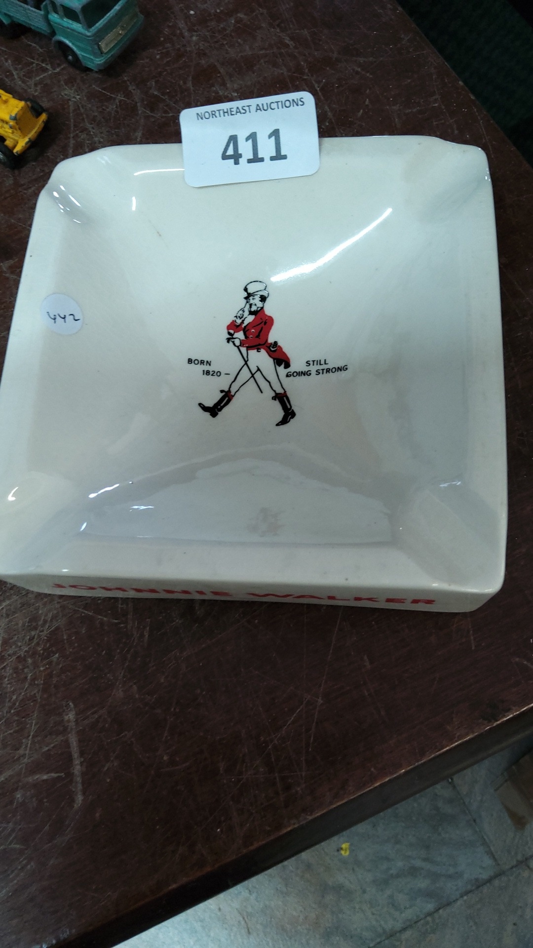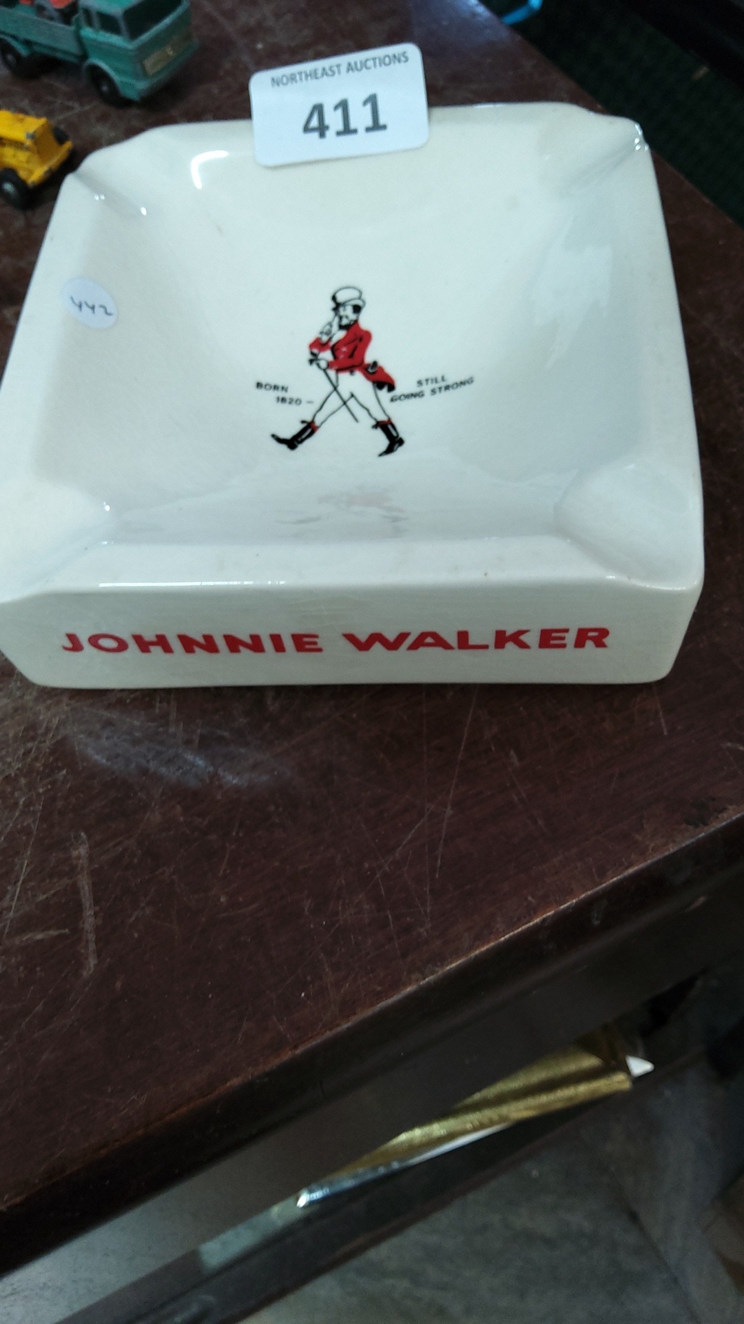 Johnnie Walker advertising ceramic ashtray of square form with rounded corners, printed with the Striding Man motif and the legend “Born 1820—Still going strong”, the exterior side lettered “JOHNNIE WALKER” in red.