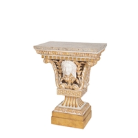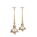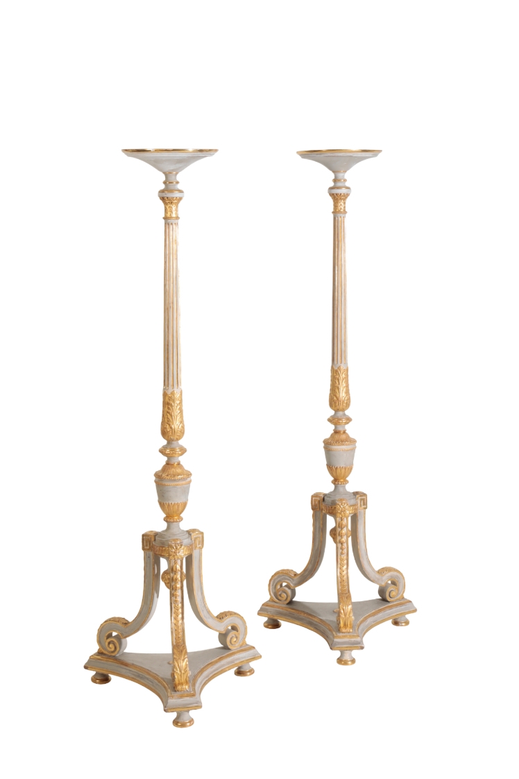 A PAIR OF CARVED AND PARCEL GILTWOOD TORCHERES IN LOUIS XVI TASTE,, second half 20th century, the circular tops on tapering and fluted shafts with knopped, waisted, urn and acanthus mouldings, each on three splayed legs with recessed bellflower and guilloche detail, to scrolled feet, on triform bases, each with three turned feet, 165cm high x 57cm wide (at base)