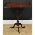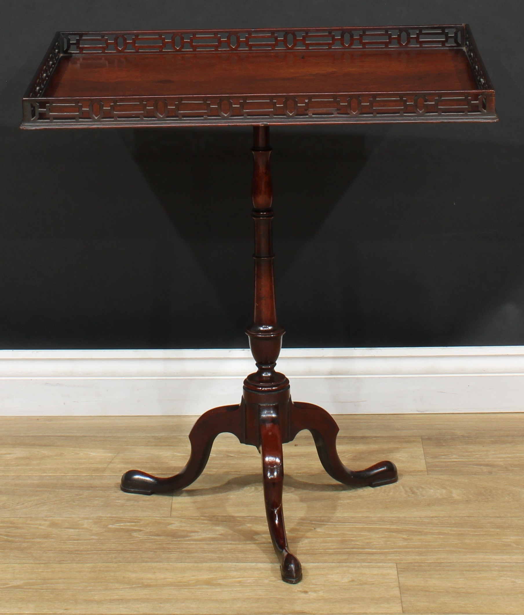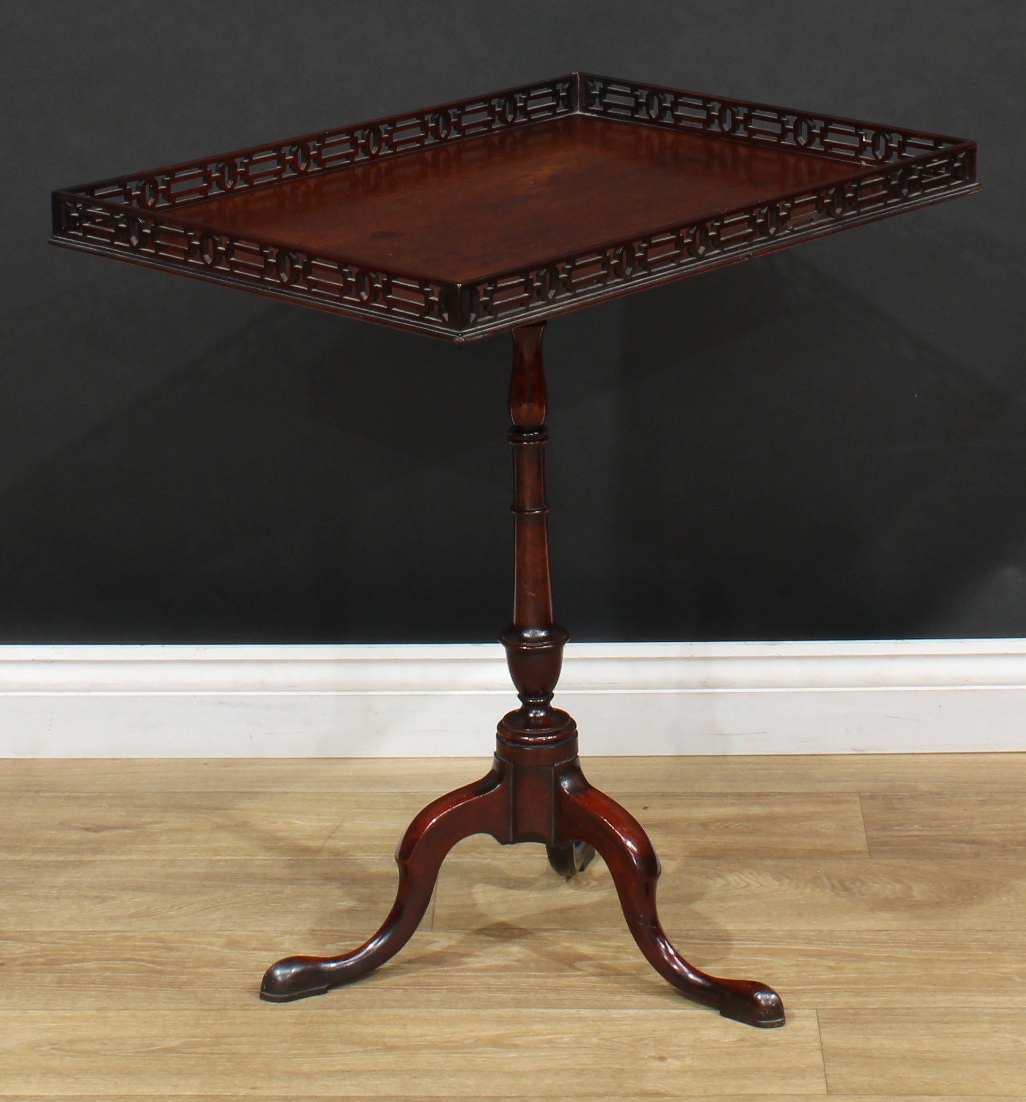 A Chinese Chippendale Revival mahogany 'tray-top' occasional table, fixed rectangular top with pierced gallery, turned column, cabriole legs, pointed pad feet, 70cm high, 65.5cm wide, 47cm deep