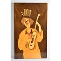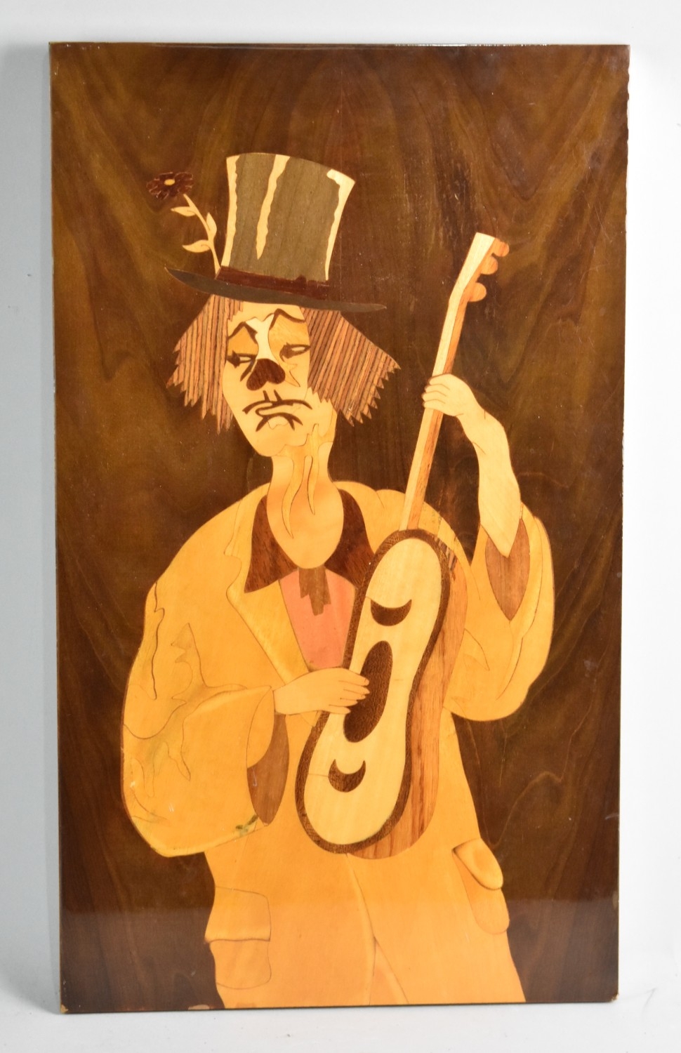 An Italian Inlaid Panel Depicting Clown with Guitar by Gargiulo, Sorrento, 49x29cms