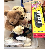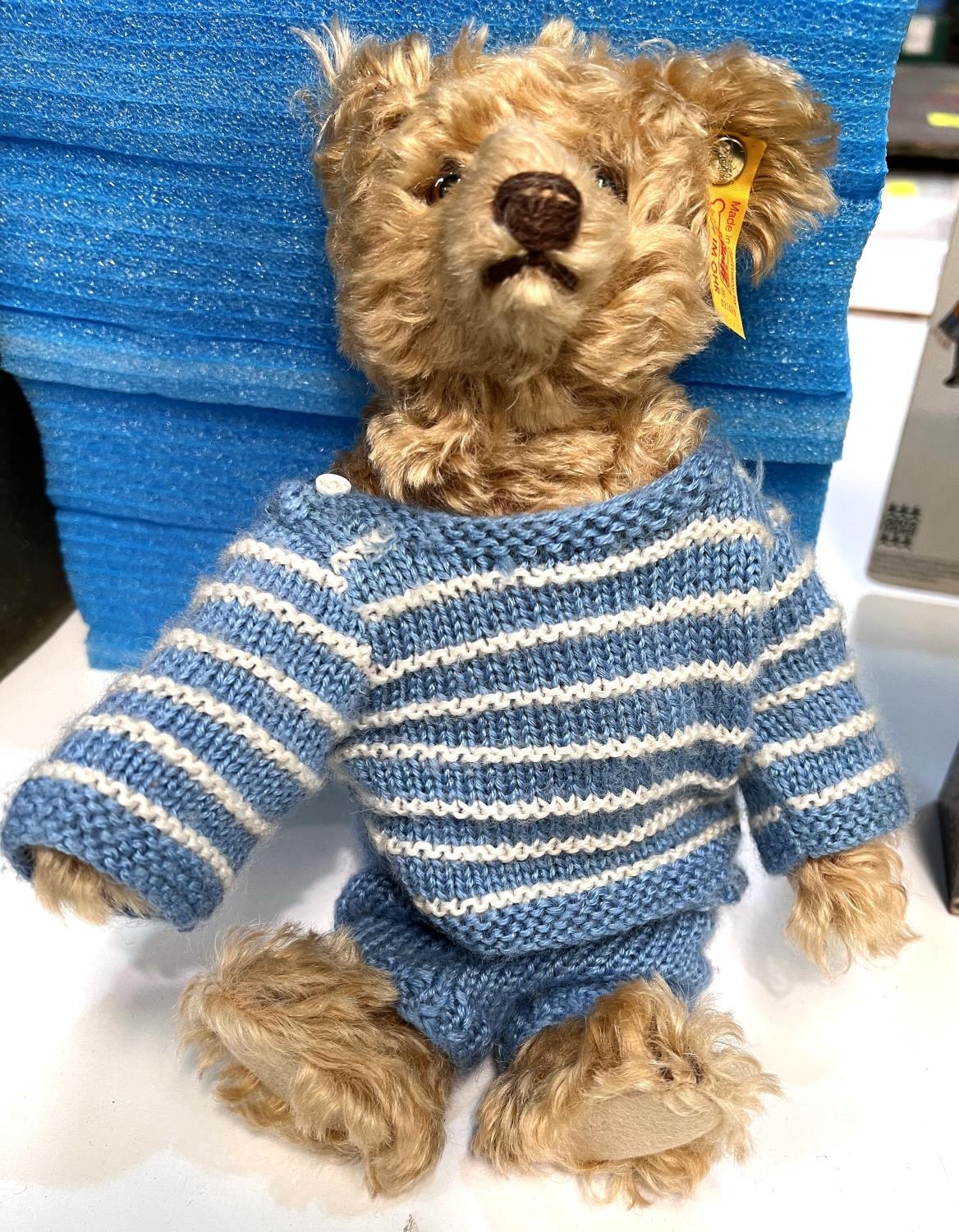A modern Steiff Teddy Bear with blue striped jumper, button to ear