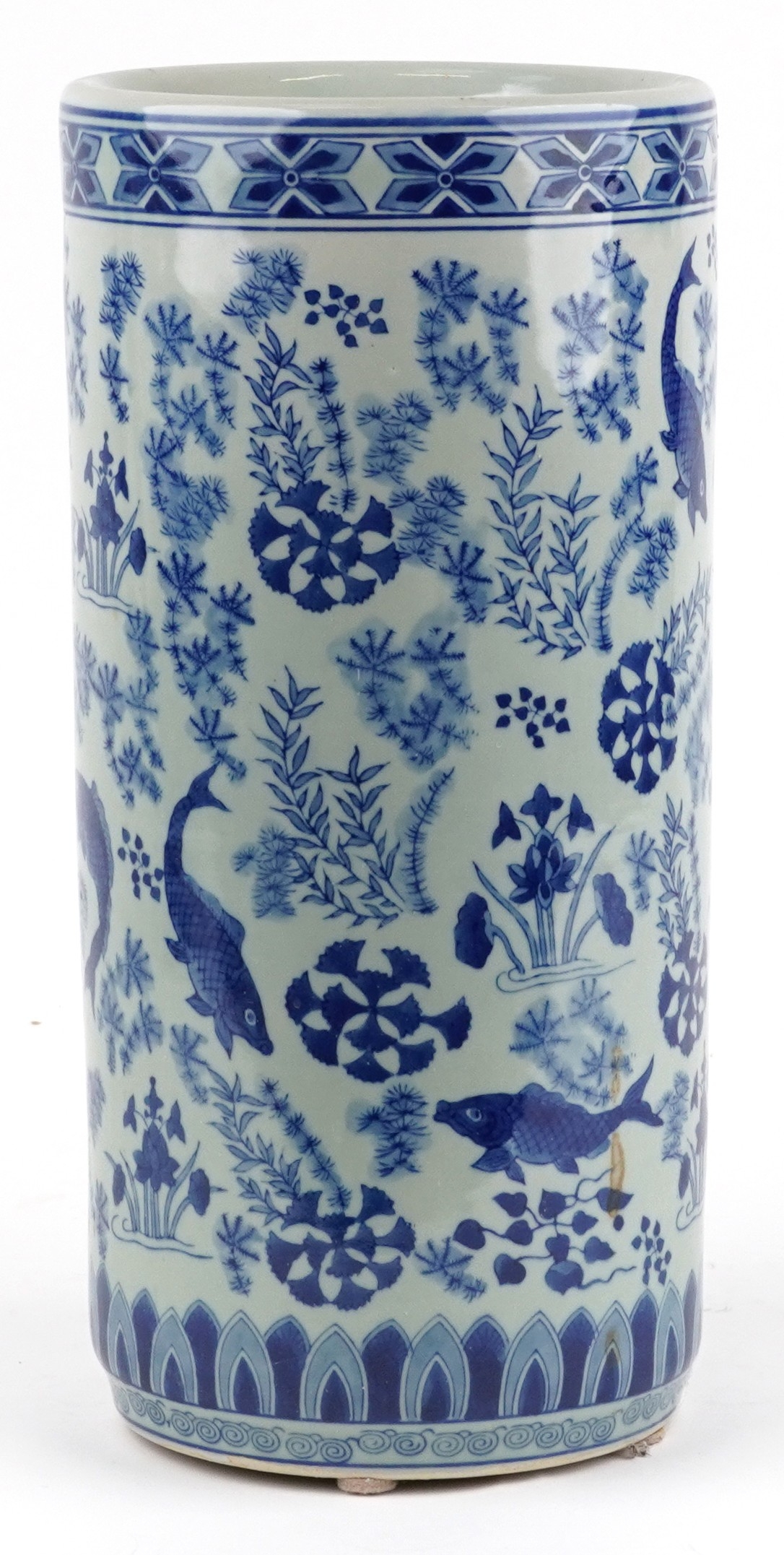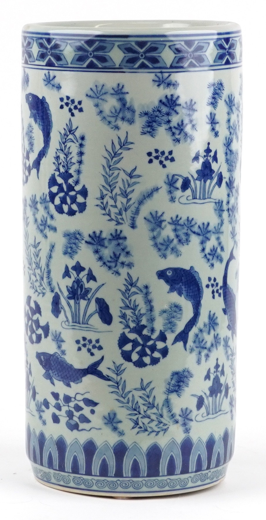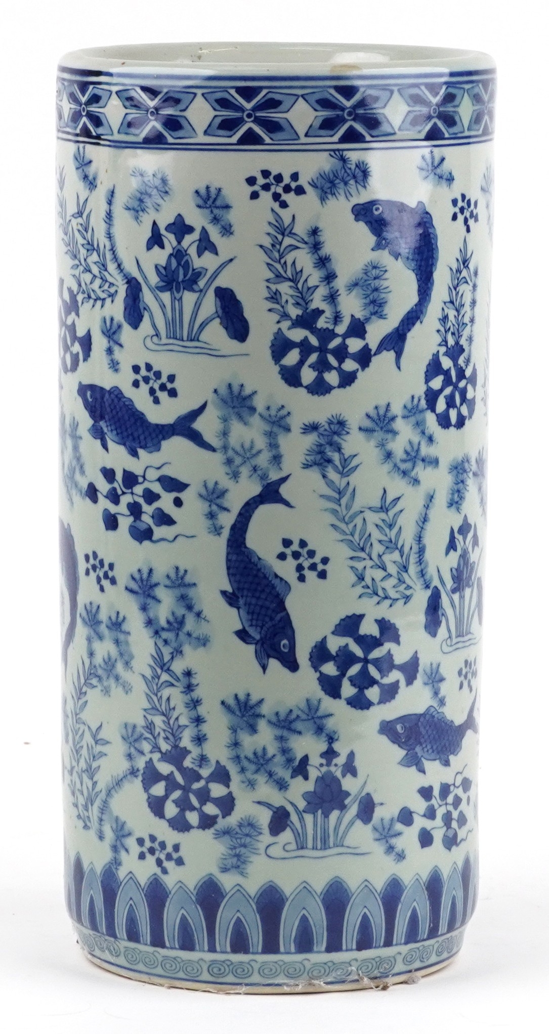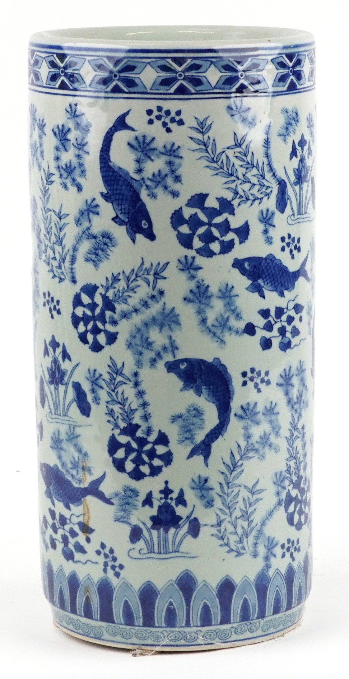 A Chinese cylindrical blue and white porcelain stick stand, modern, decorated with carp, bearing four character marks to the base, 47cm high.