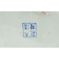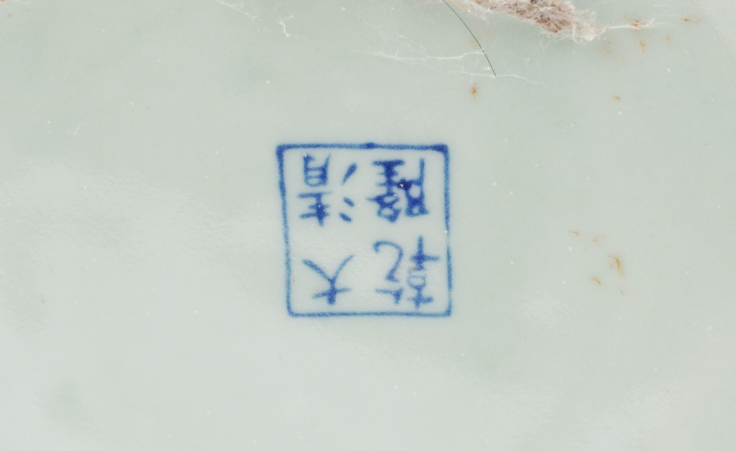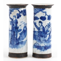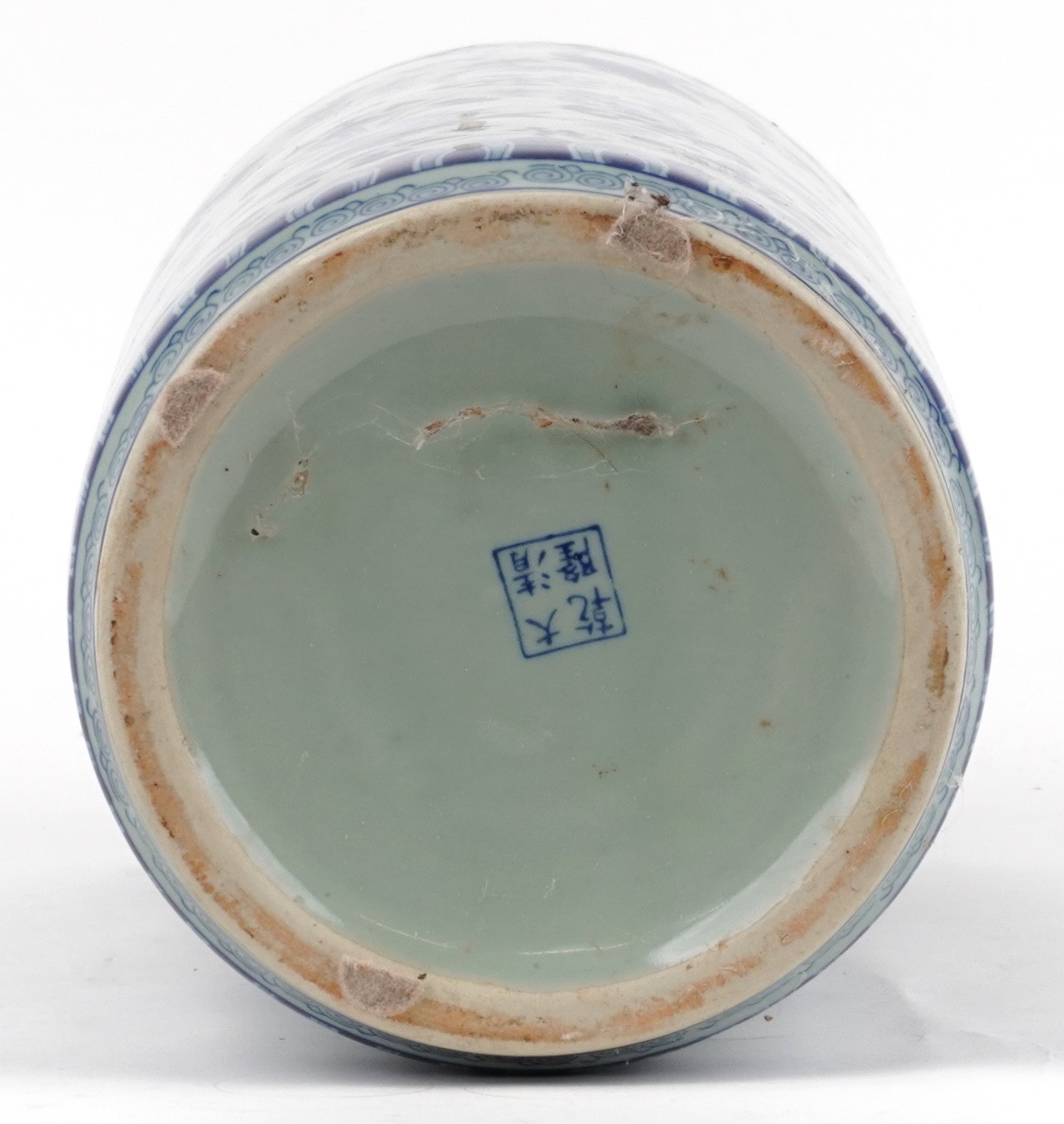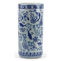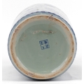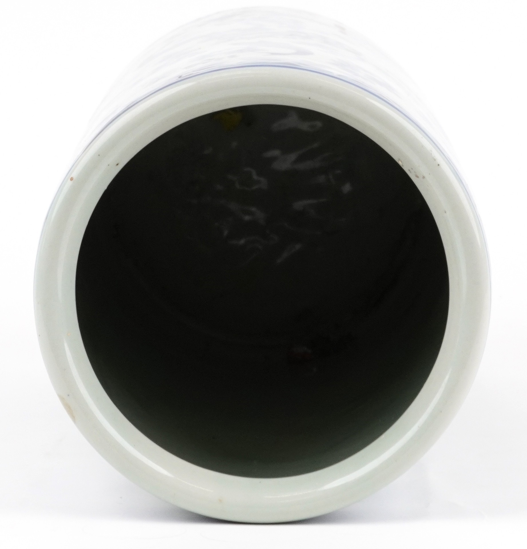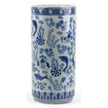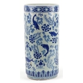 A Chinese cylindrical blue and white porcelain stick stand, modern, decorated with carp, bearing four character marks to the base, 47cm high.