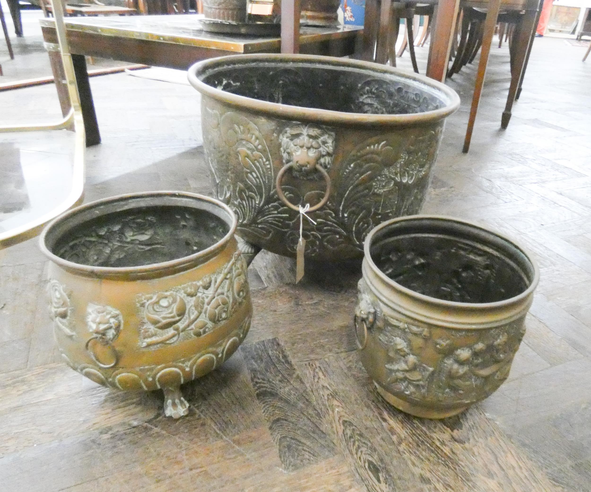 A large circular embossed brass log bin or plant holder and two brass embossed jardinières