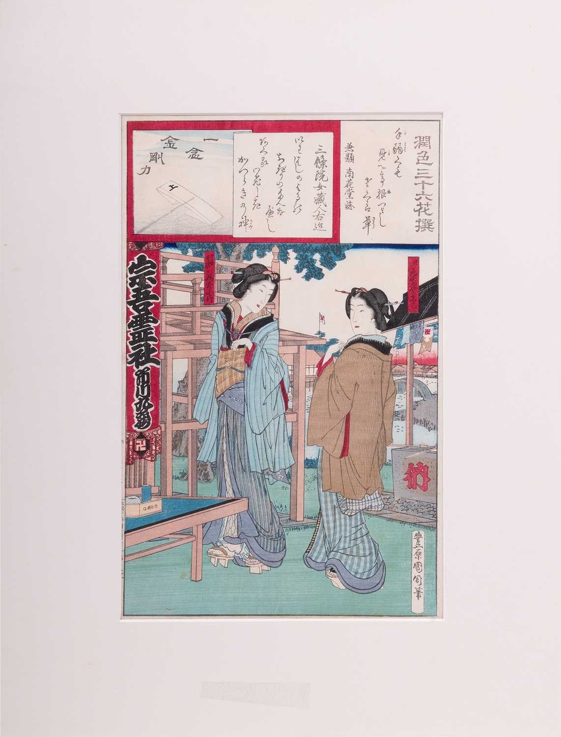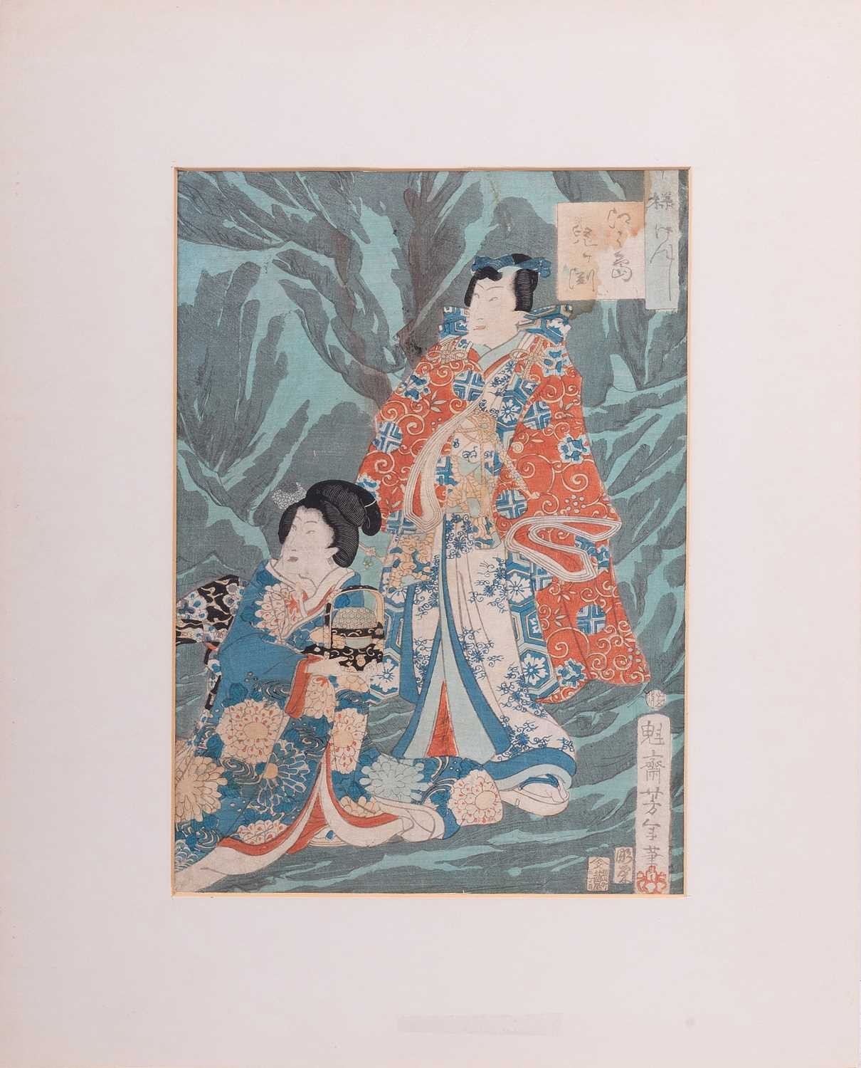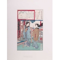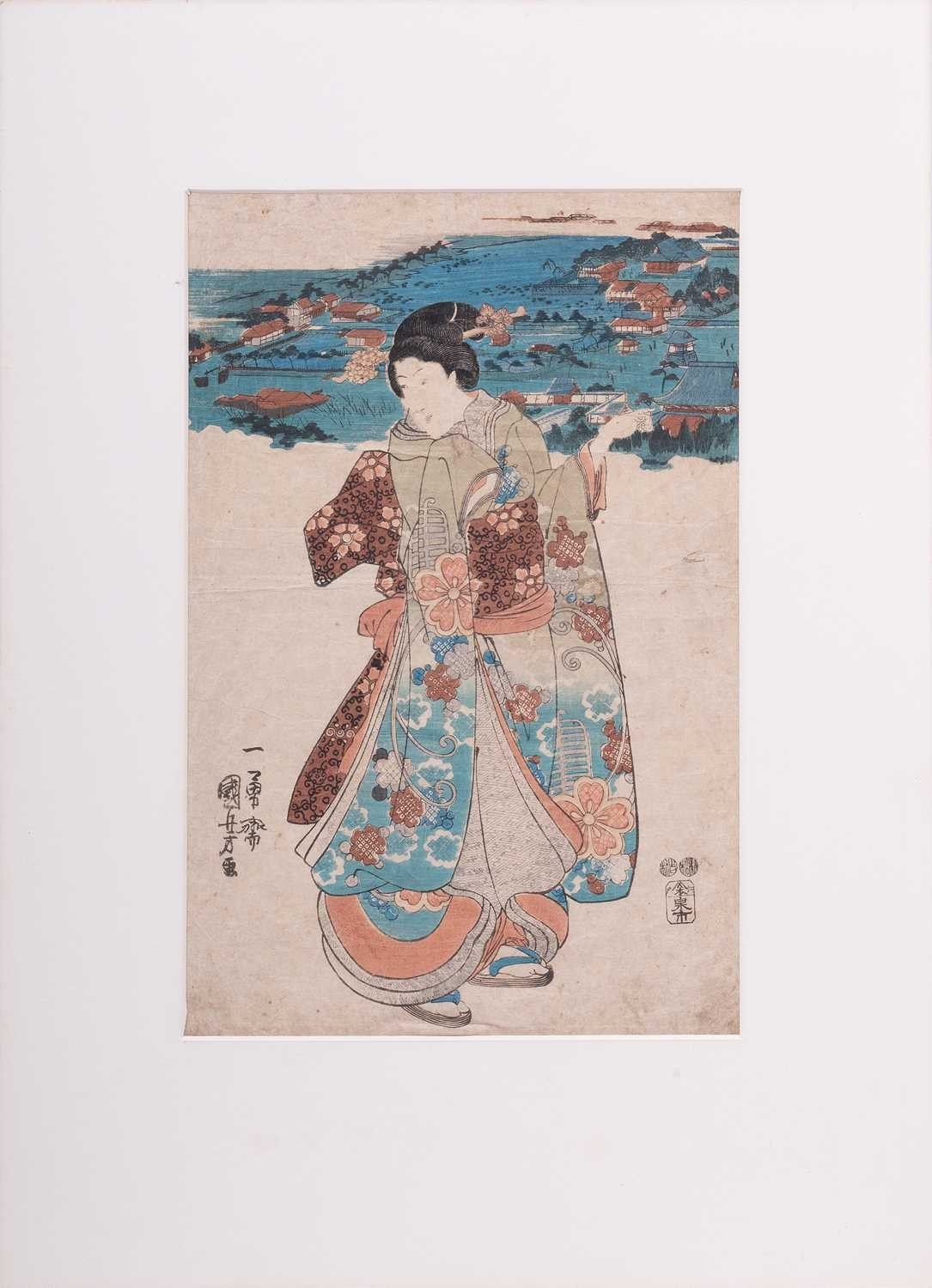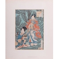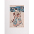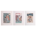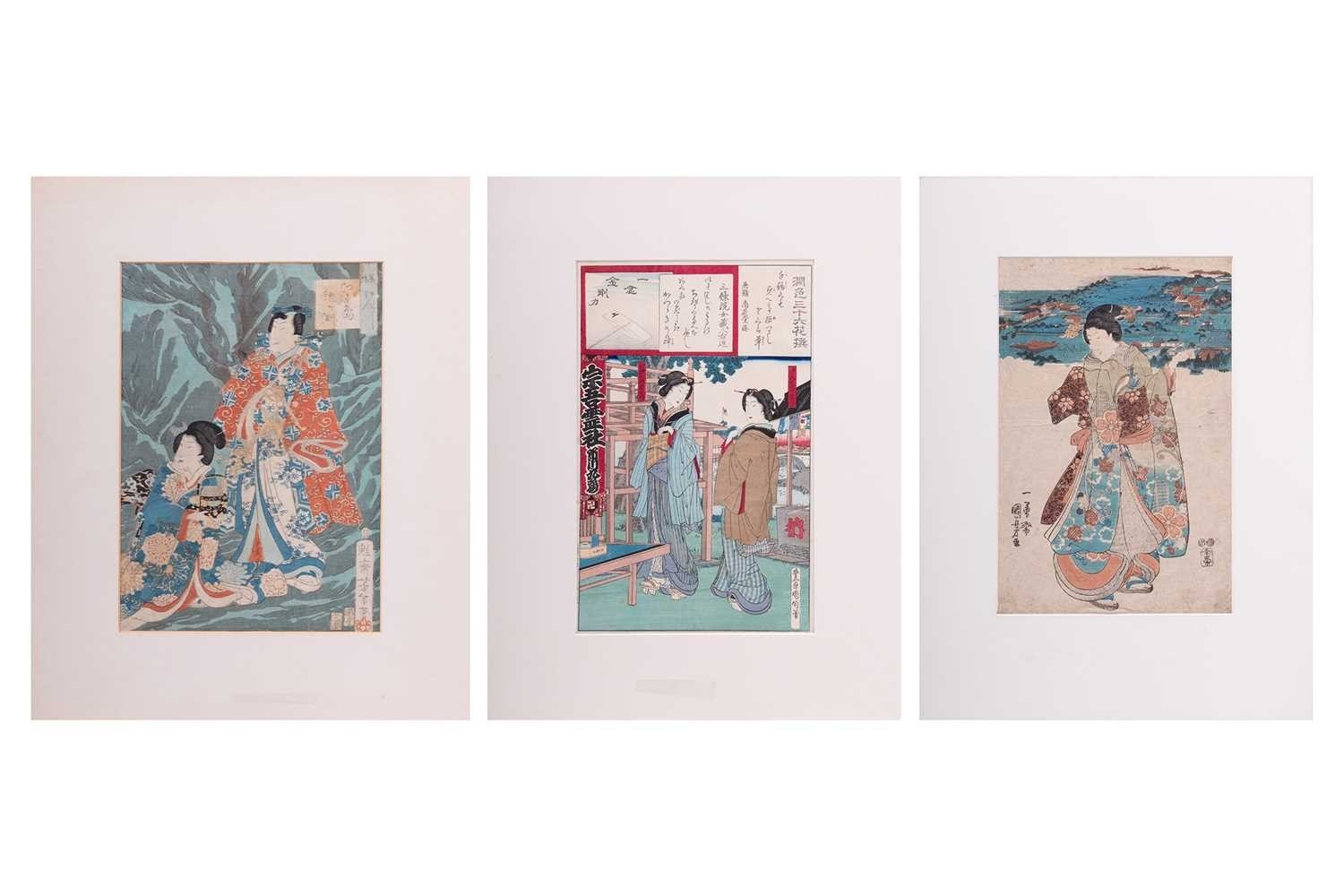After Toyohara Kunichika (1835 - 1900), Visiting a Shrine from 'Thirty-six Enchanting Flowers' (1881), ukiyo-e Japanese print, 34 x 22.5 cm, mounted (unframed), 51 x 41 cm; After Utagawa Unisade, Price Genji and a courtesan, ukiyo-e Japanese print, 34 x 24 cm, mounted (unframed), 51 x 40 cm; and another Japanese print of a lady pointing towards a landscape, 35 x 23 cm, moutned (unframed) 53 x 39.5 cm (3)