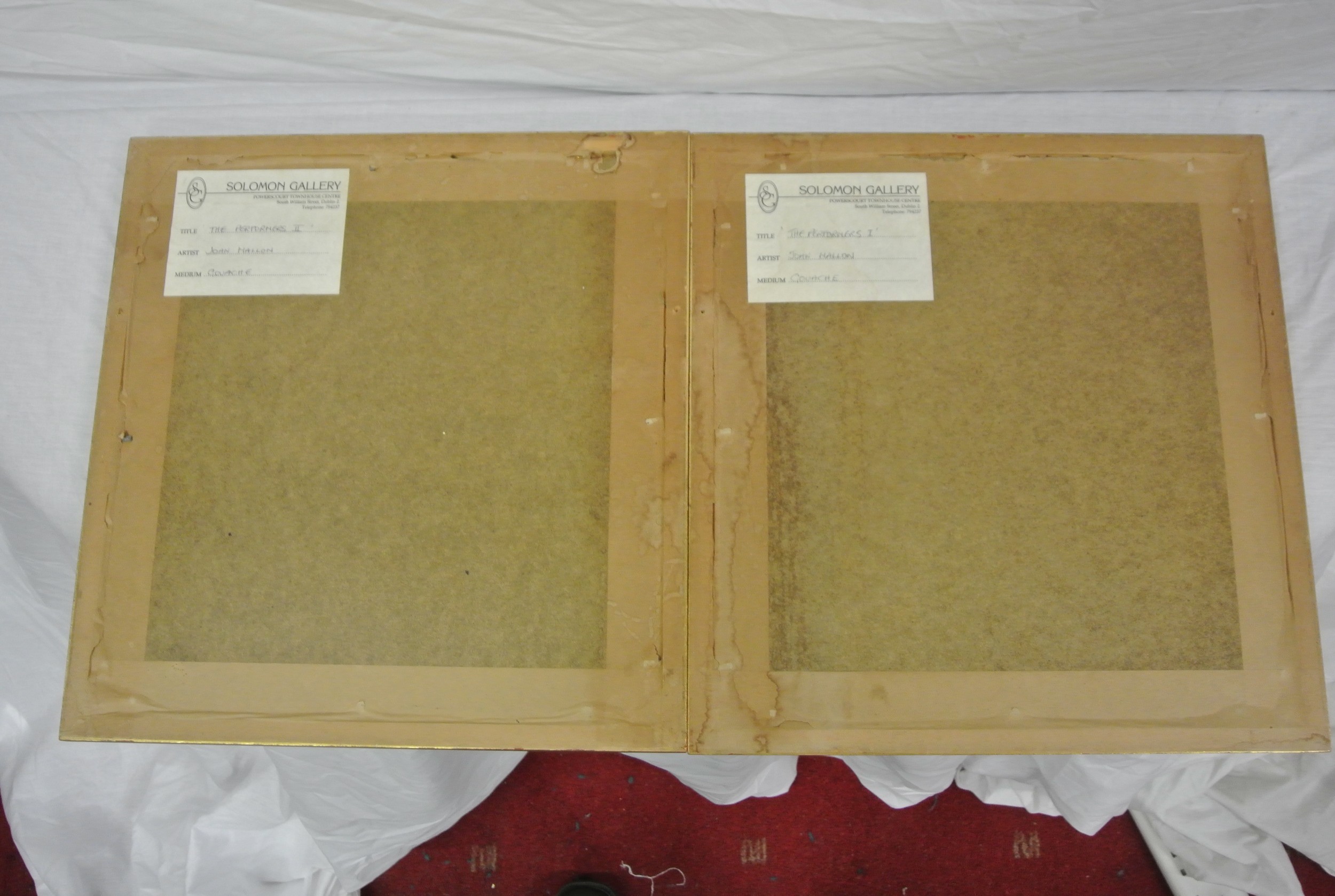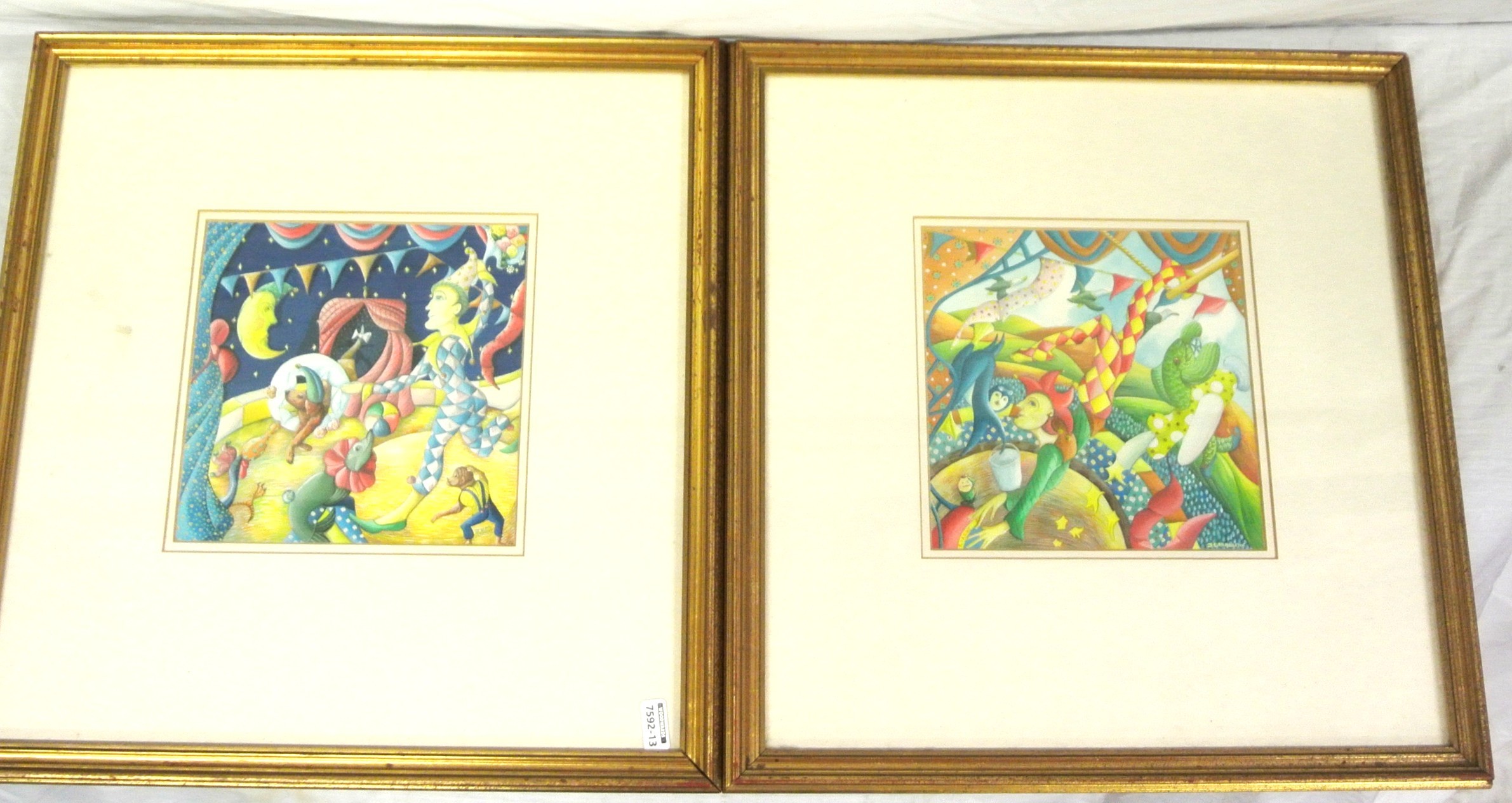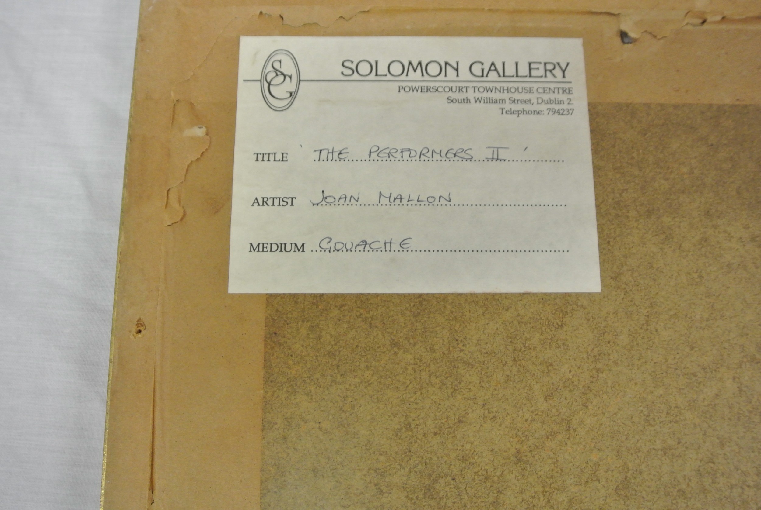 Joan Mallon 'The Performers I & II' a pair of watercolours, 18x18cm each, signed & initialled, Solomon Gallery labels verso