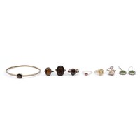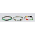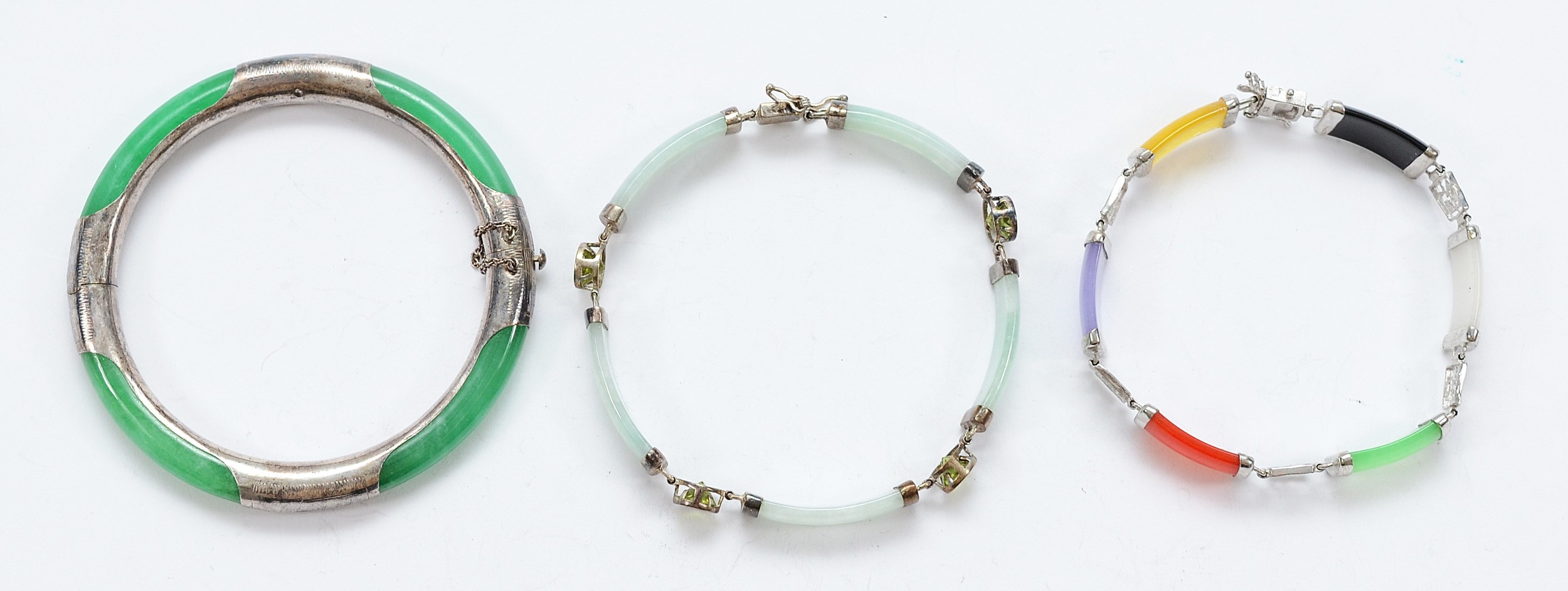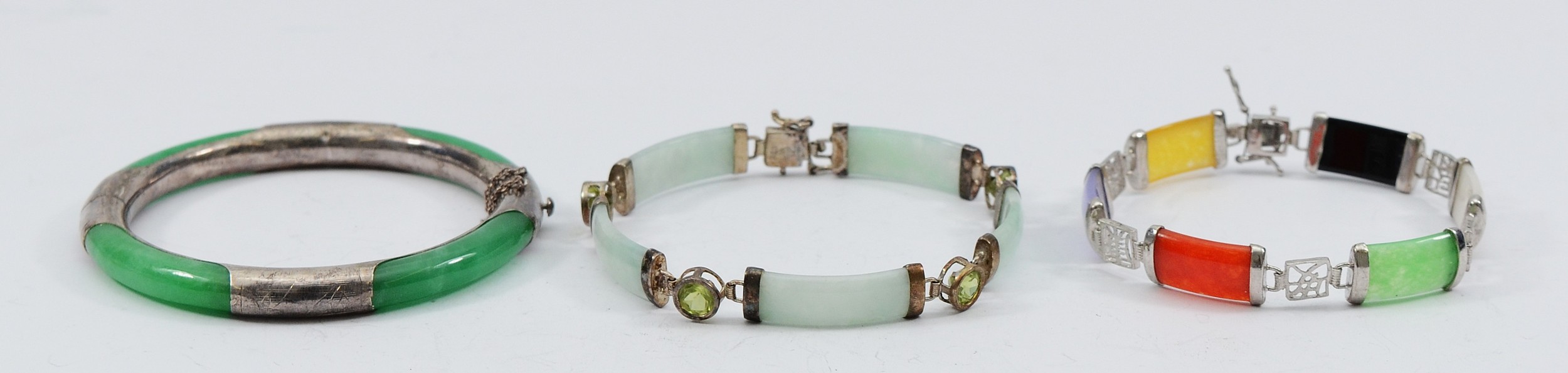 Two 925 silver jade and gemset bracelets, 18-19cm, with a 925 silver hinged bangle, 45g