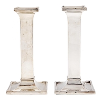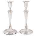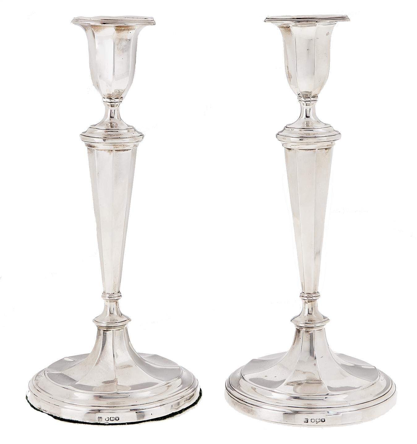 A pair of George VI silver candlesticks, in neo classical style, nozzles, 25cm h, by Northern Goldsmiths Co, Sheffield 1939, loaded