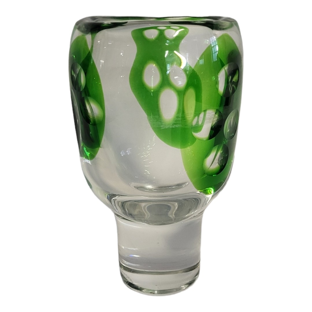 Hand thrown pedestal art glass vase, moulded and cut with three panels of geometric circles within green glazes, acid etched signature ‘Lindstrandt Kosta 4267’ to base.
