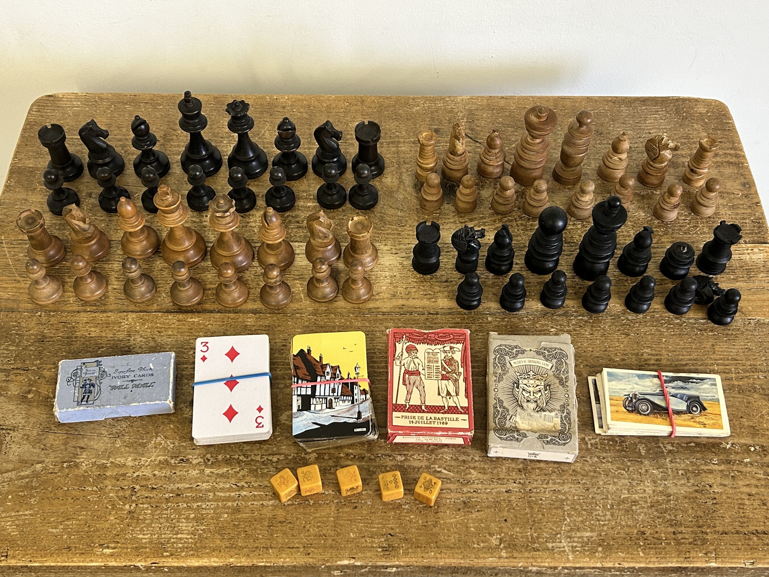 Two vintage wood sets of chess pieces (one set has a pawn missing and an as found knight) together with vintage playing cards etc