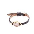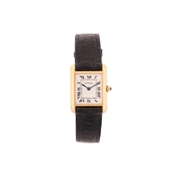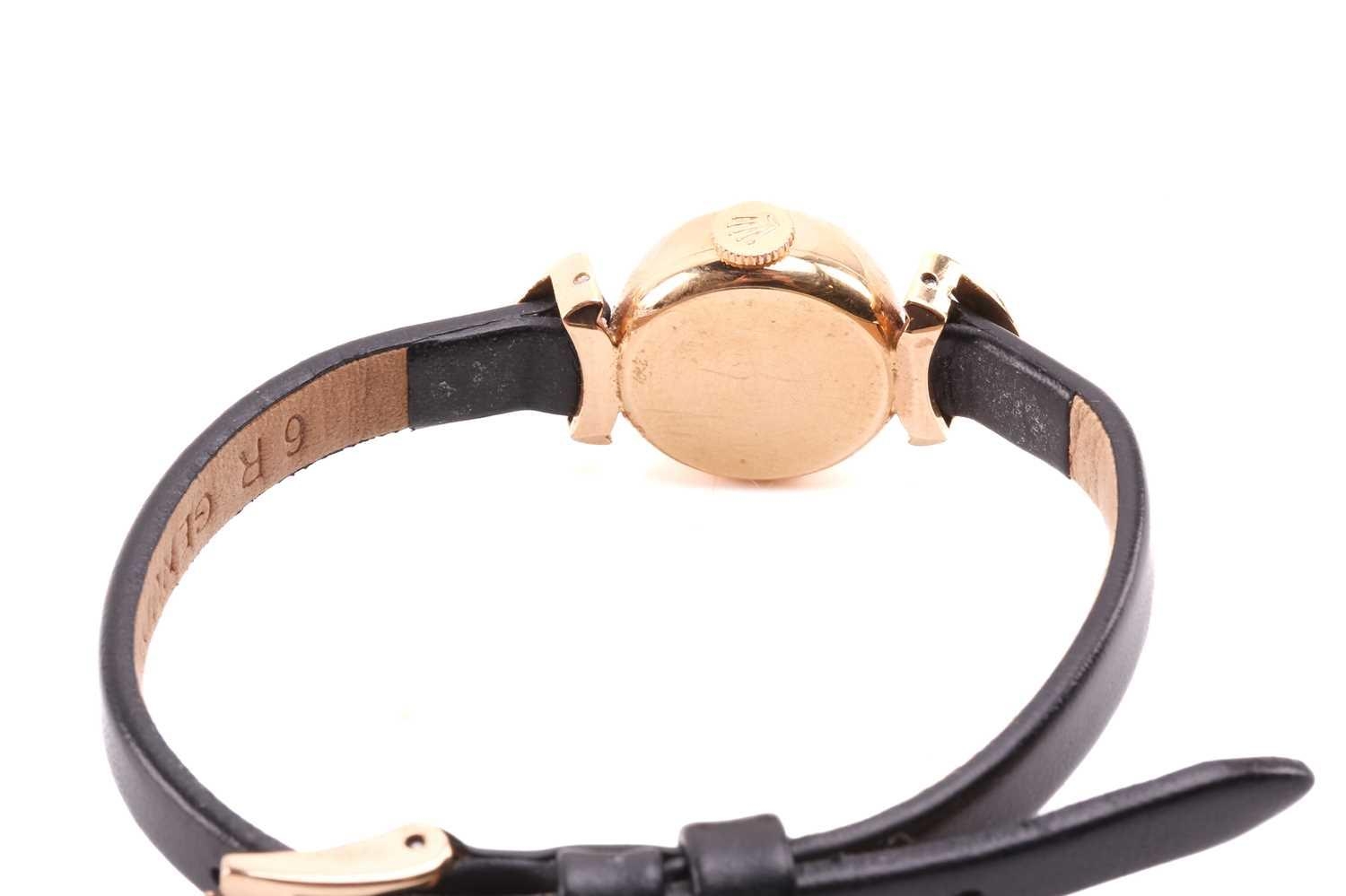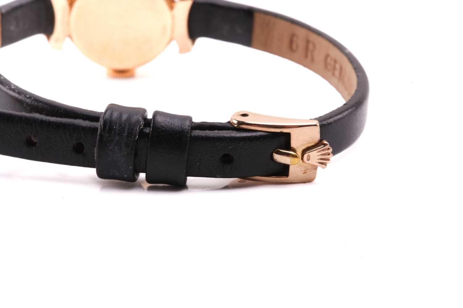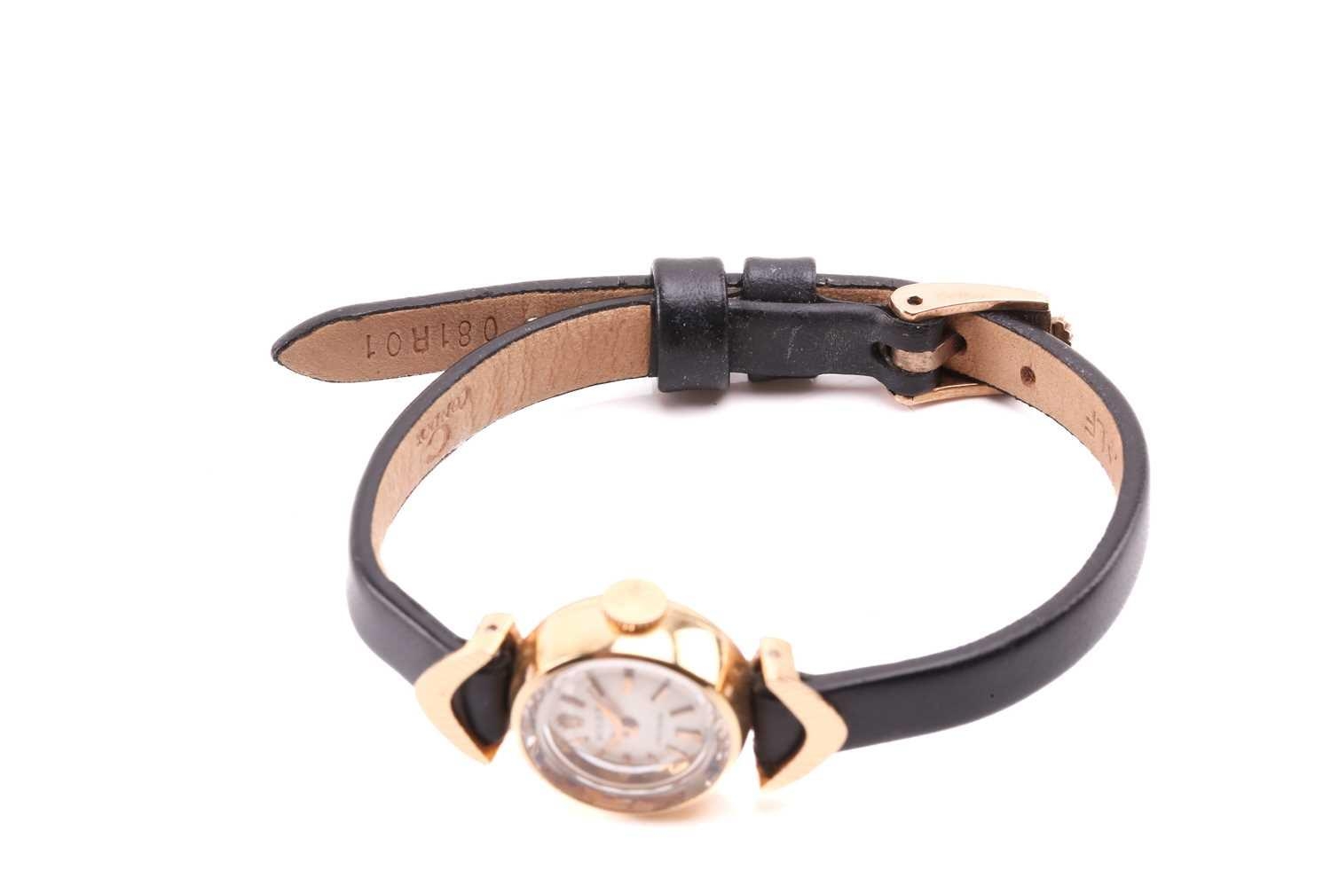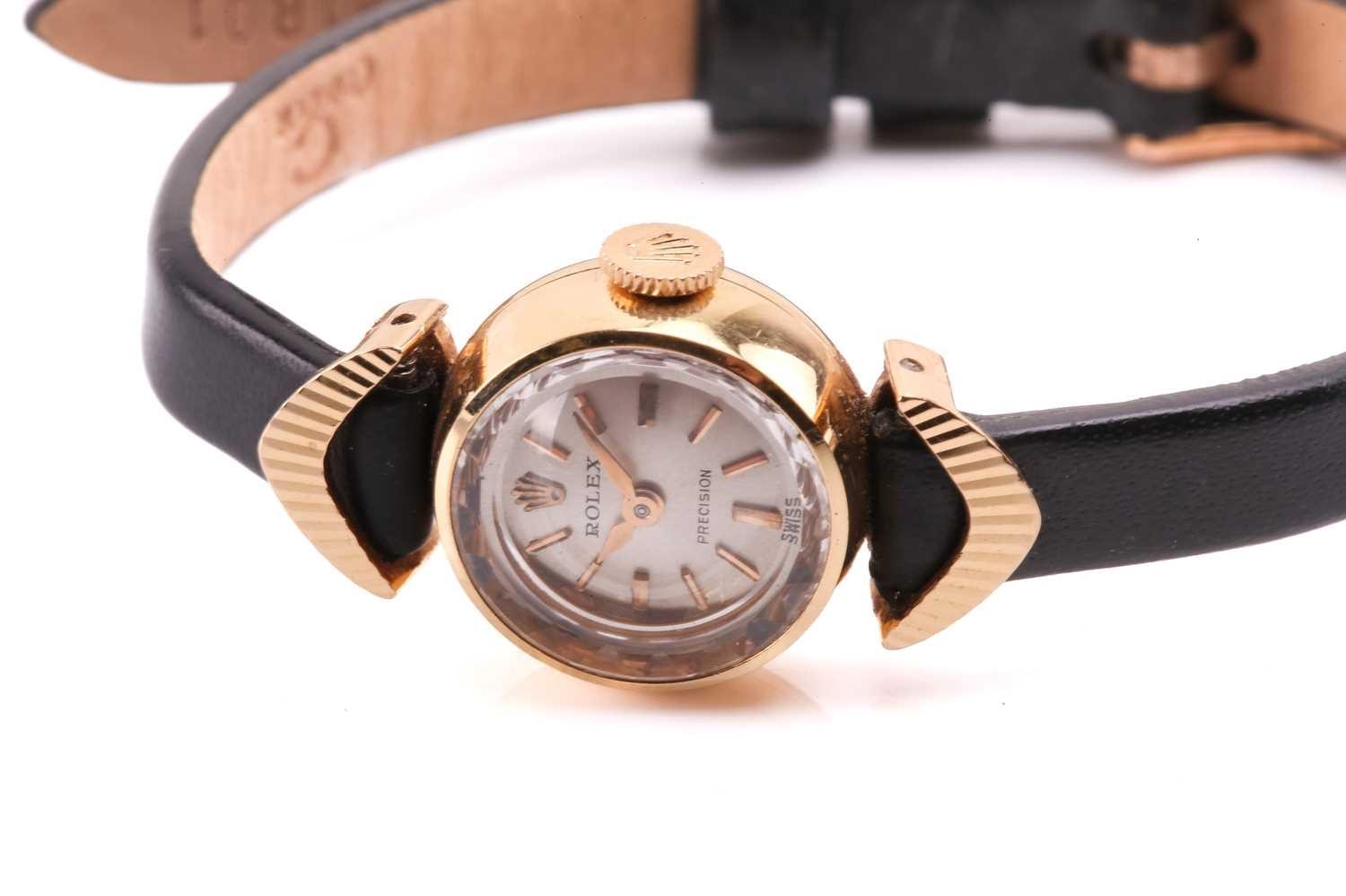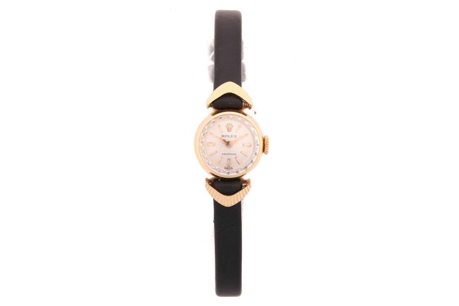A Rolex Precision yellow metal manual wind ladies wristwatch, the silvered textured dial having batton indices with signature Rolex crown at 12 o'clock, the case being stamped to one side and having Rolex crown stamped to caseback, on black leather strap having Rolex clasp stamped to reverse, 15cm, total weight 10.6g. The watch appears to be in good working order, no long-term tests have been performed and accuracy cannot be guaranteed, a full service is advised on all watches and pocket watches once purchased. Surface scratches & wear consistent with age The online condition report may not mention mechanical replacements or imperfections to the movement, case, dial, pendulum, separate base(s) or dome. Watches with water-resistant cases may have been opened to examine movements, but no warranties are given regarding their water resistance. It is also important to note that we cannot guarantee the authenticity or originality of individual components, such as wheels, hands, crowns, crystals, screws, bracelets, and wrist bands, since subsequent repairs and restoration may have changed the original components. Also, we cannot guarantee the authenticity or originality of any engraving or re-engraving on watch cases, case backs, bracelets, straps or internal movements.