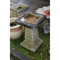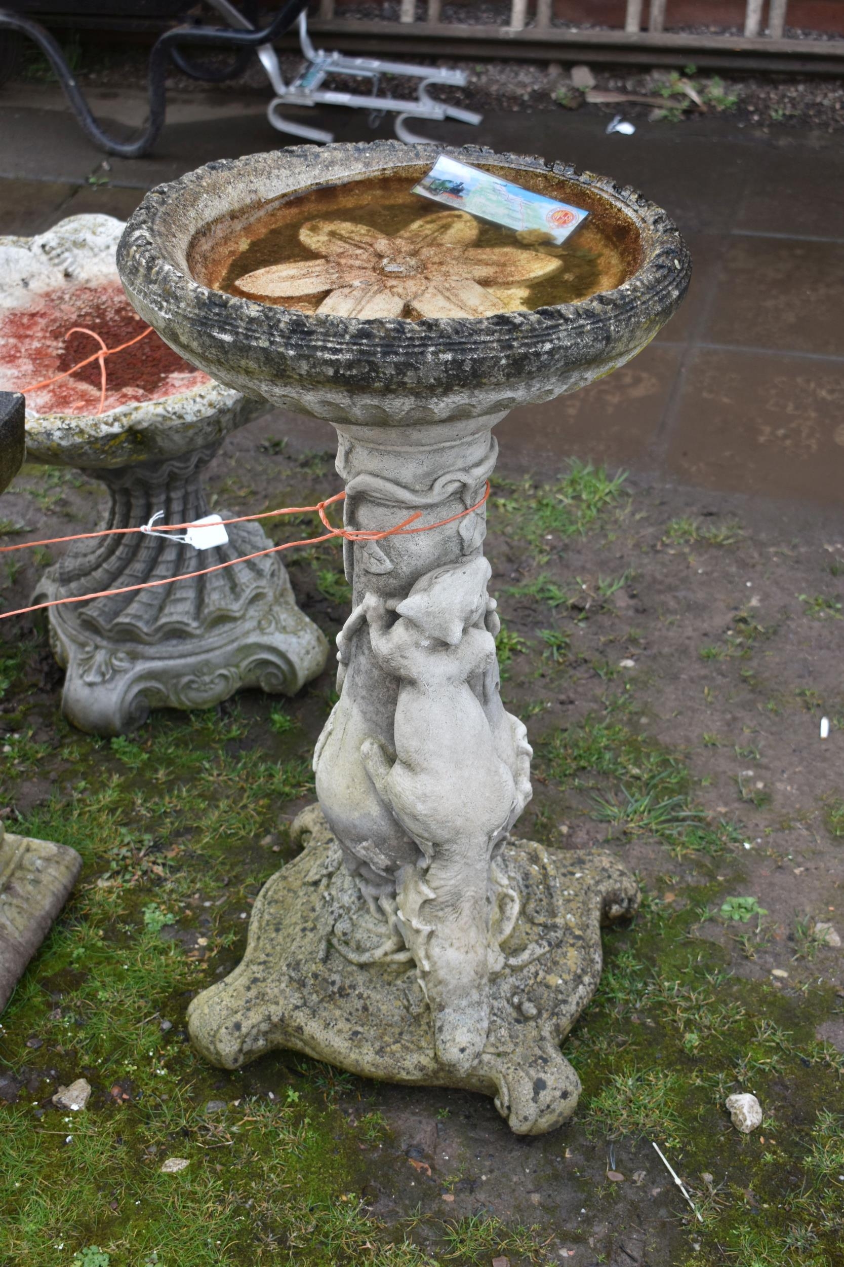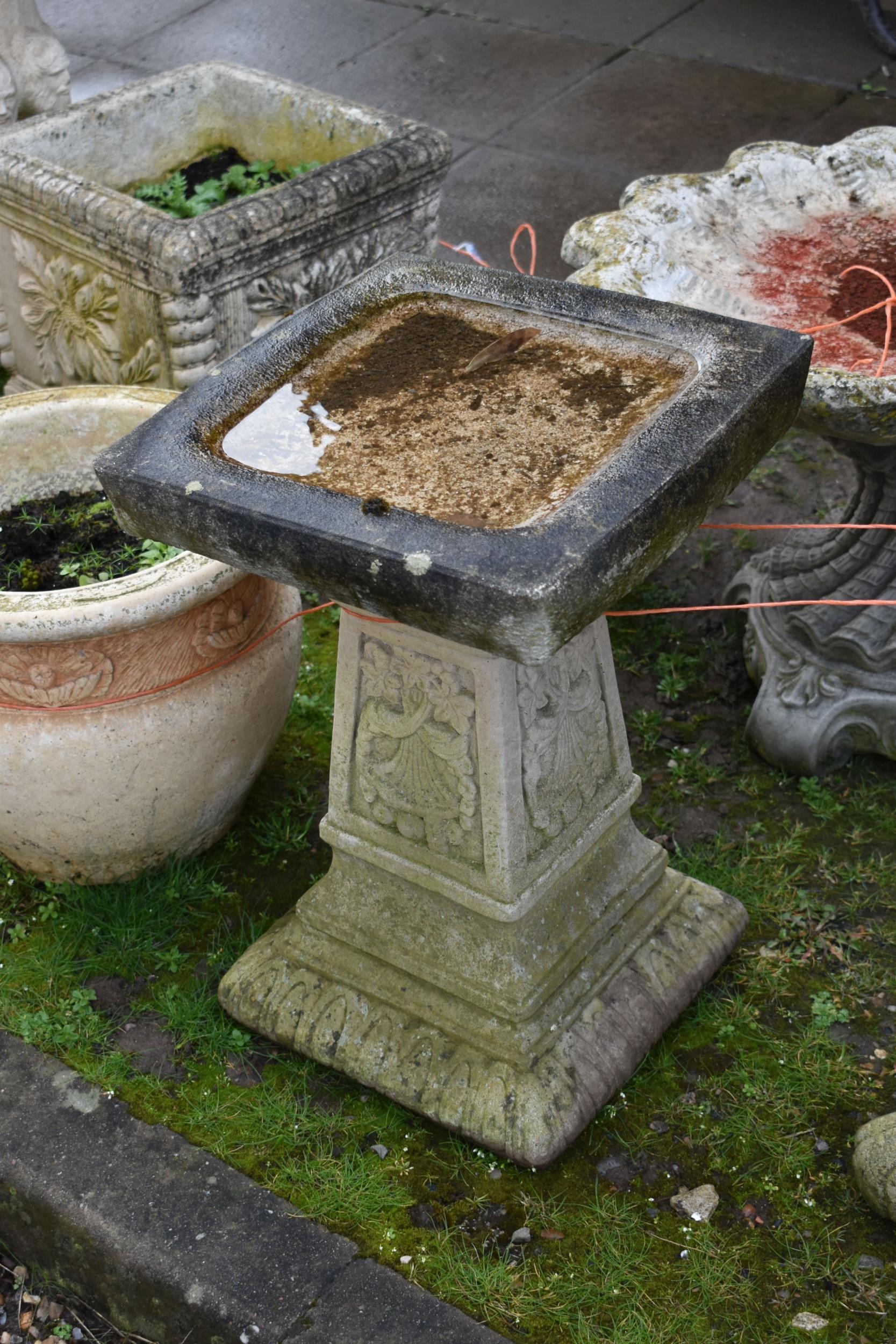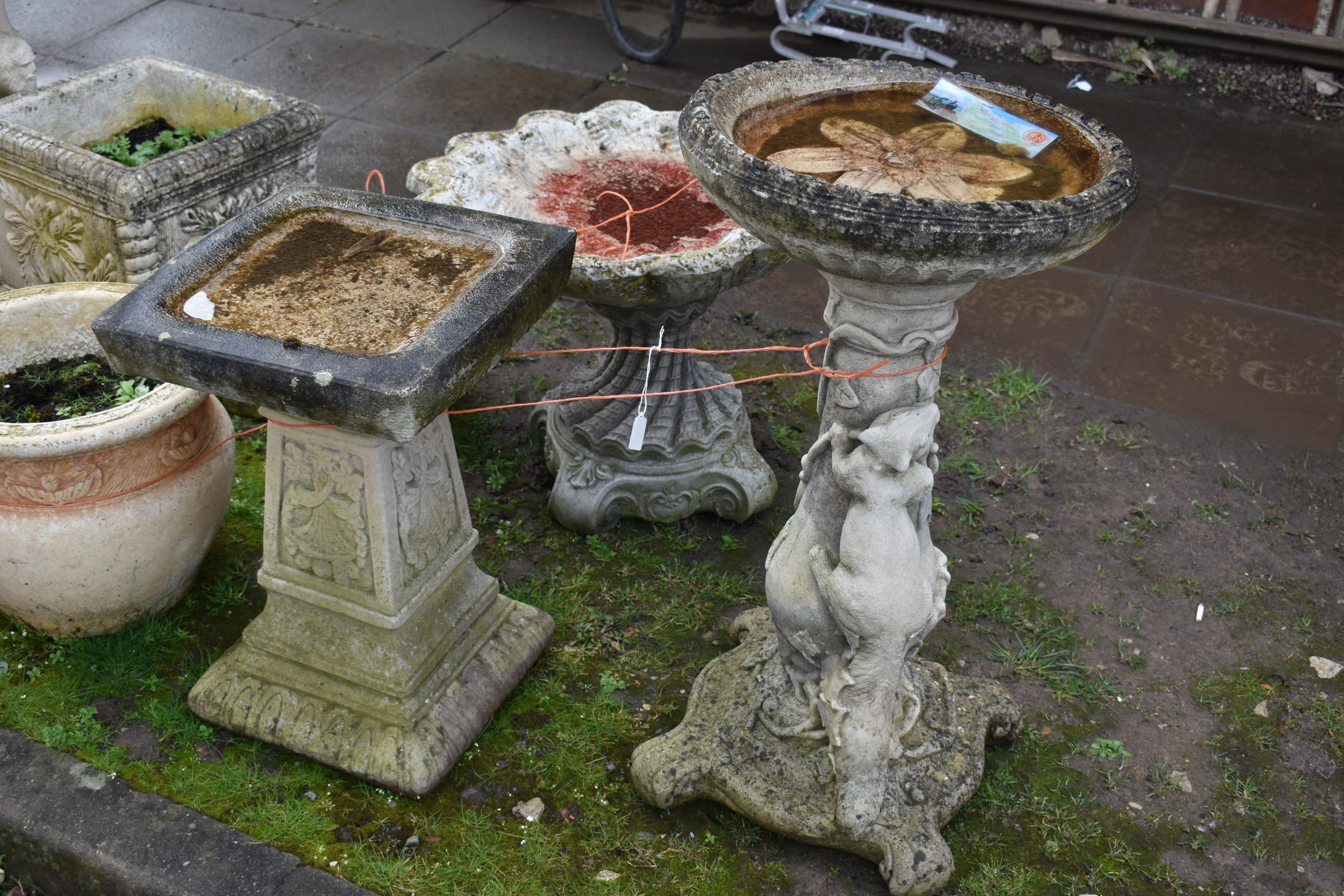 TWO MODERN COMPOSITE BIRD BATHS one with a tree stump style base, squirrel climbing, leaf and vine on a scroll foot base, circular top with a leaf embossed in bowl height 73cm, the other with a square bowl on a tapered base, foliate panels to each face height 54cm (2)