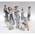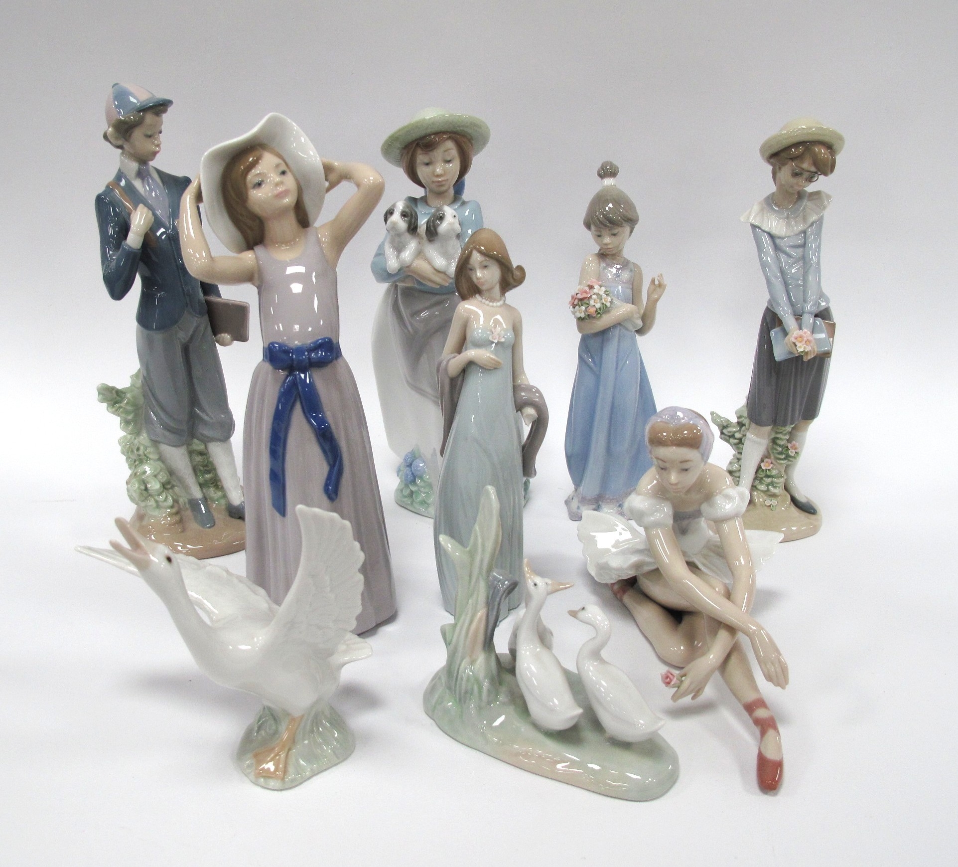 Lladro figurines to include Academy days, Seated Ballerina, geese plus other Nao examples. (9)