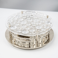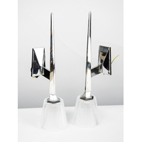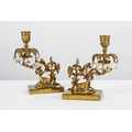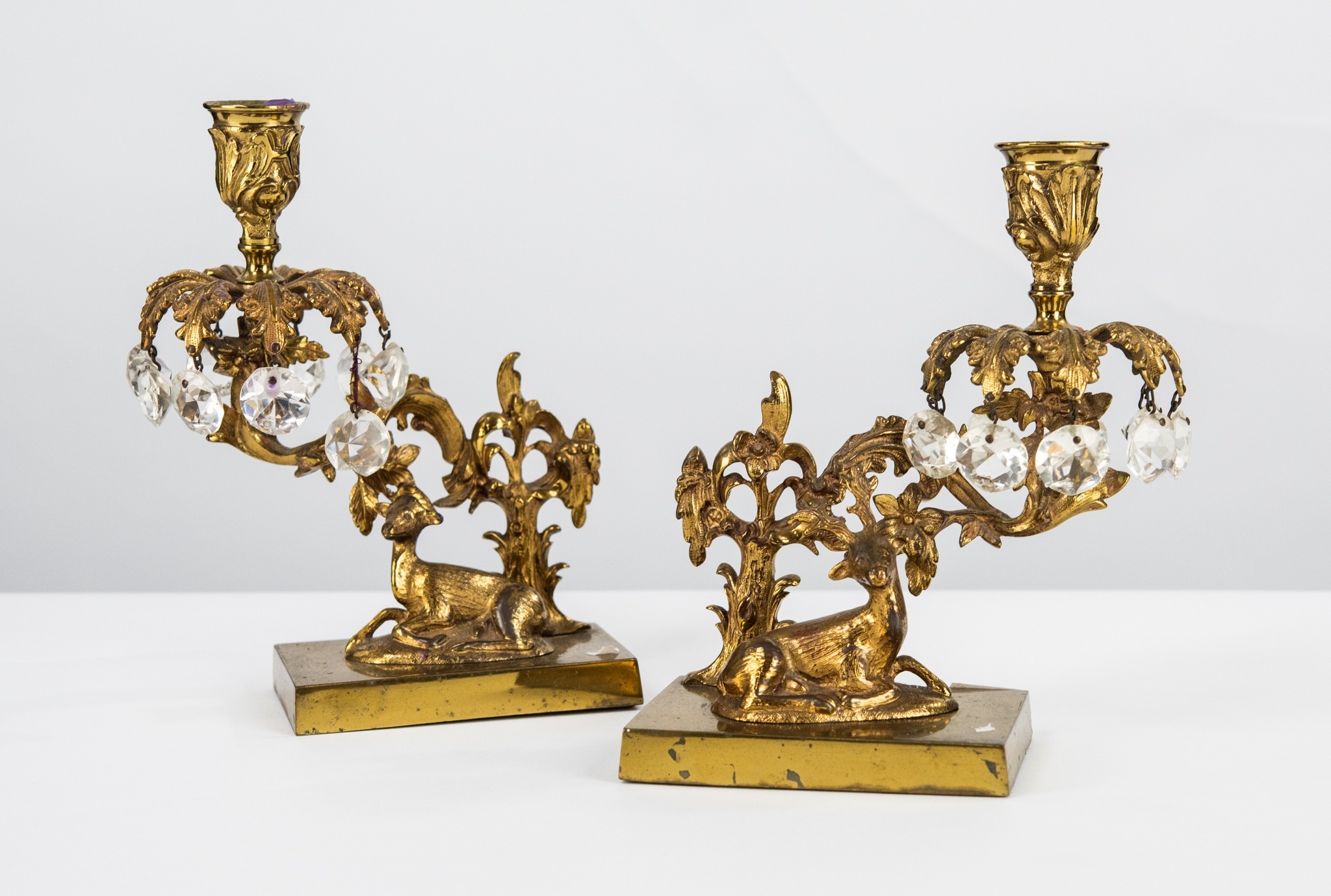 PAIR OF EARLY TWENTIETH CENTURY GILT METAL CANDLESTICKS, each modelled as a recumbent deer beneath a tree, hung with circular cut glass drops, and raised on an oblong base, 8” (20.3cm) and 7 ½” (19cm) high, (2)