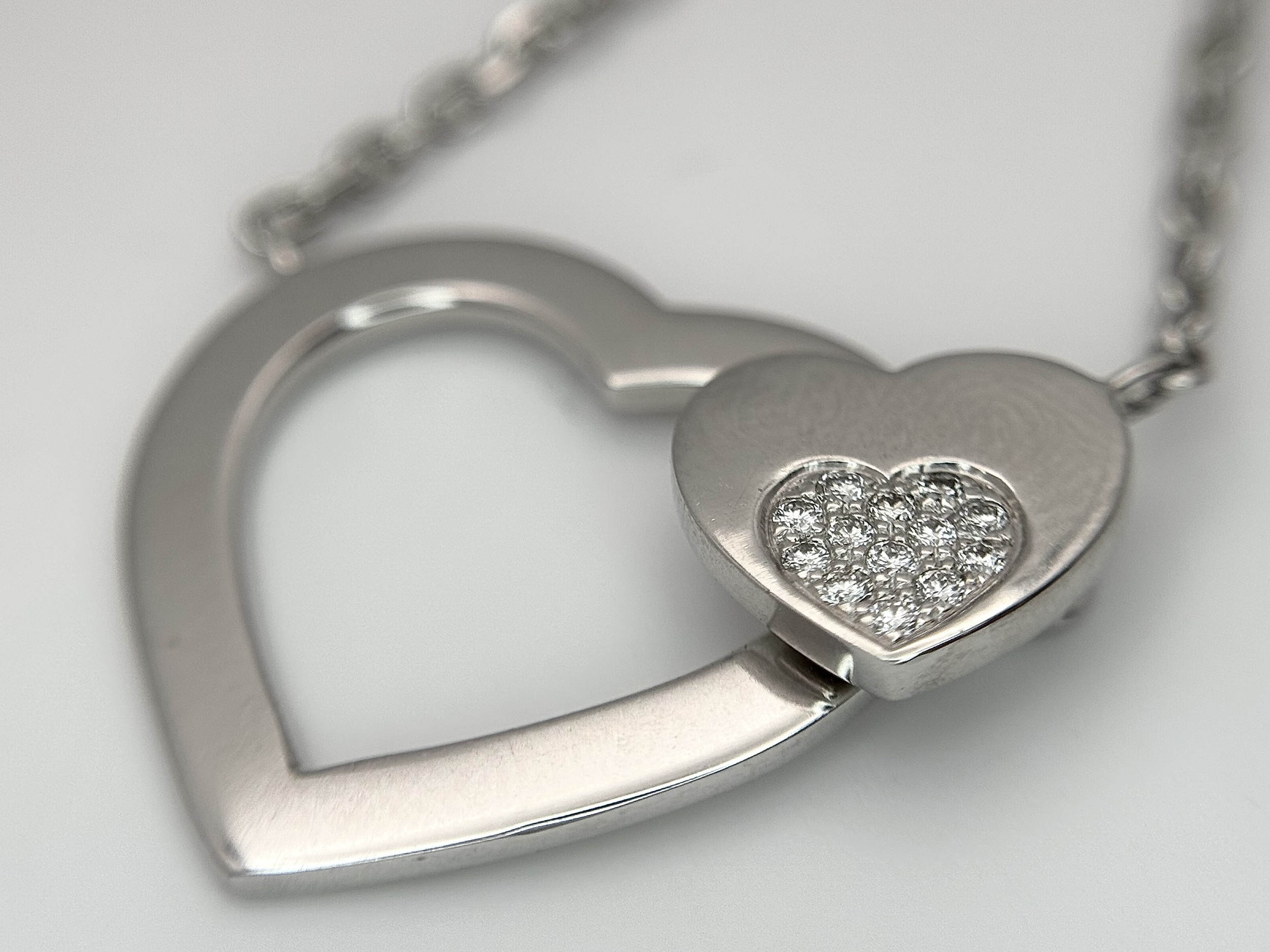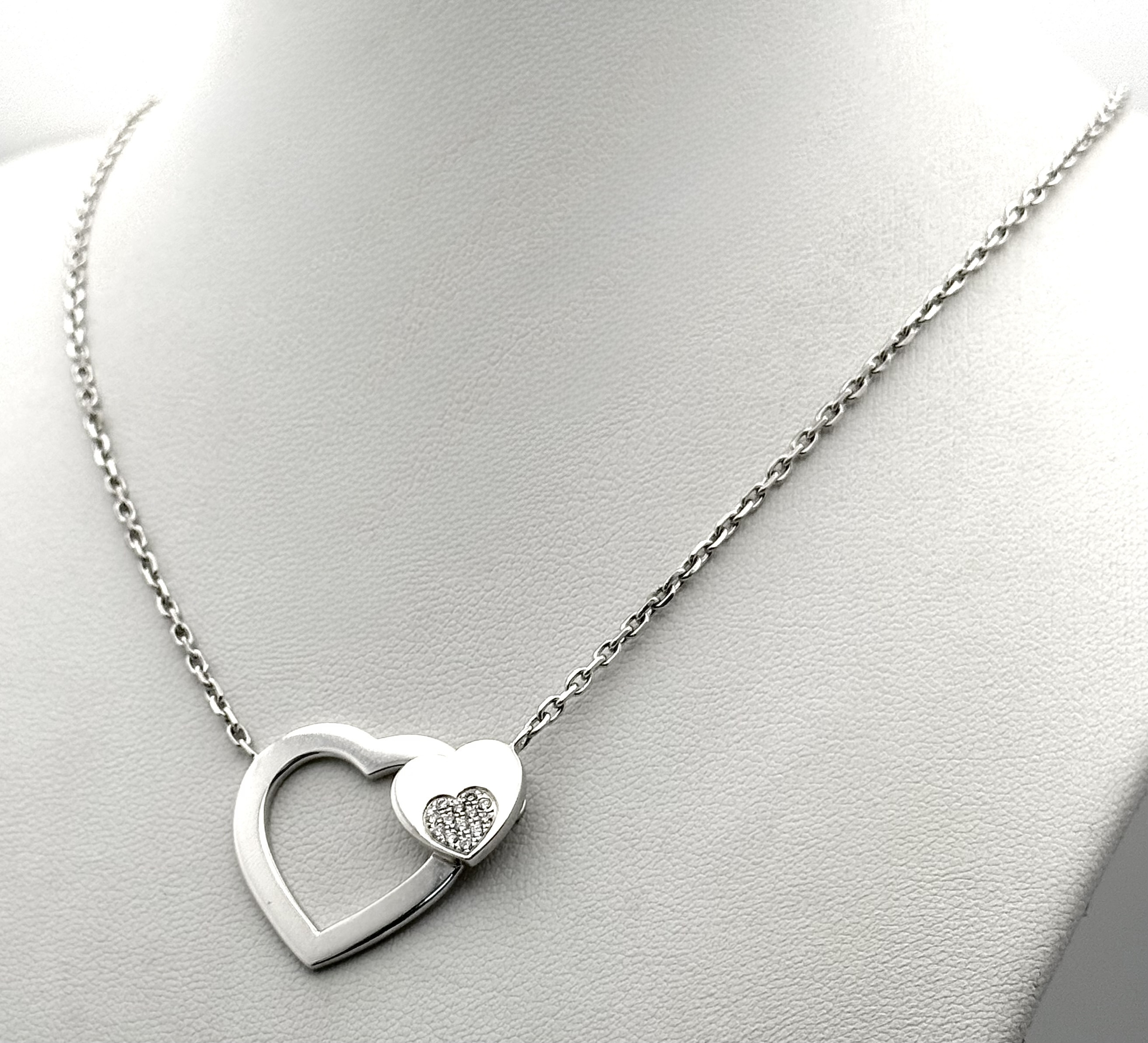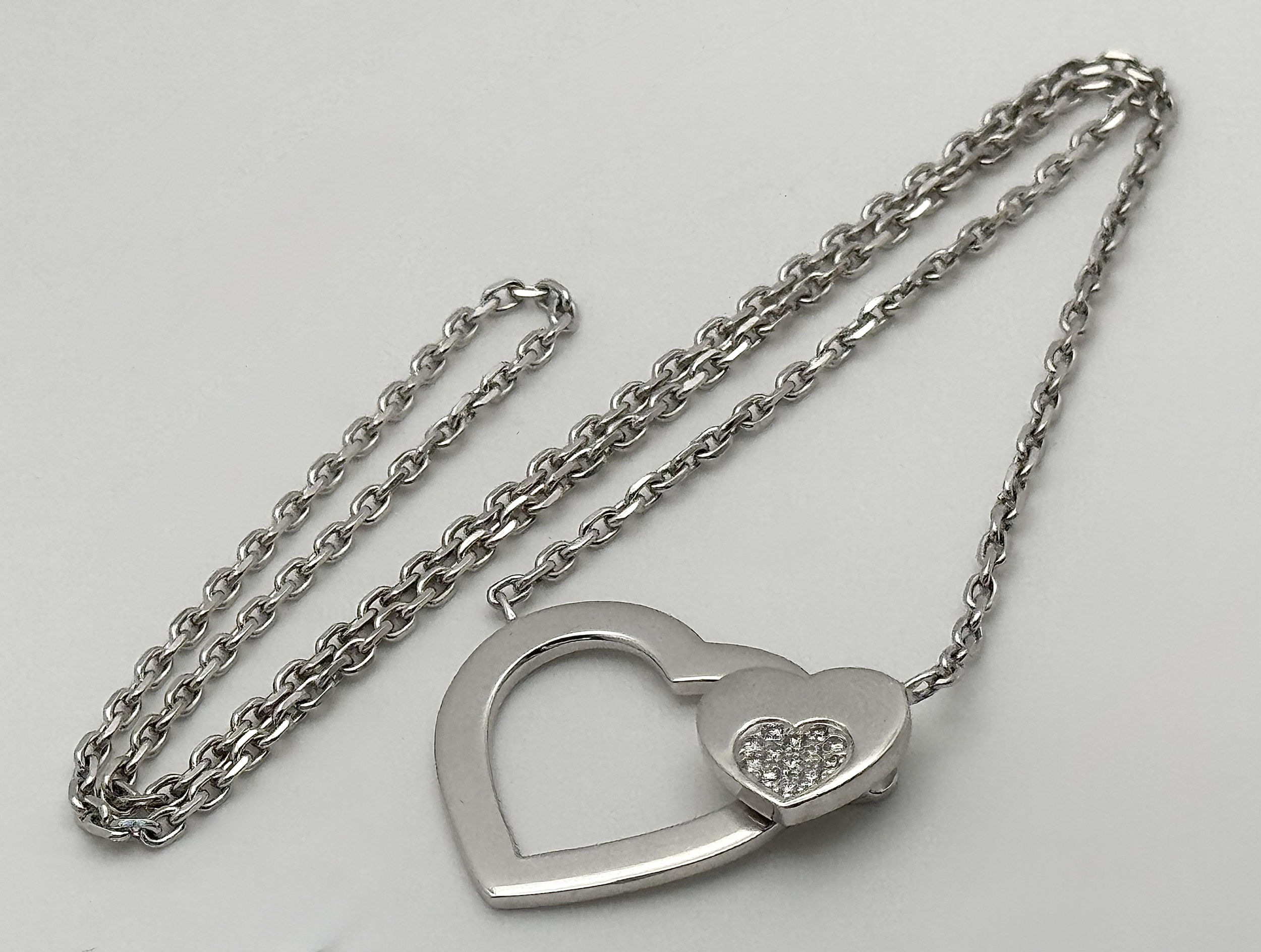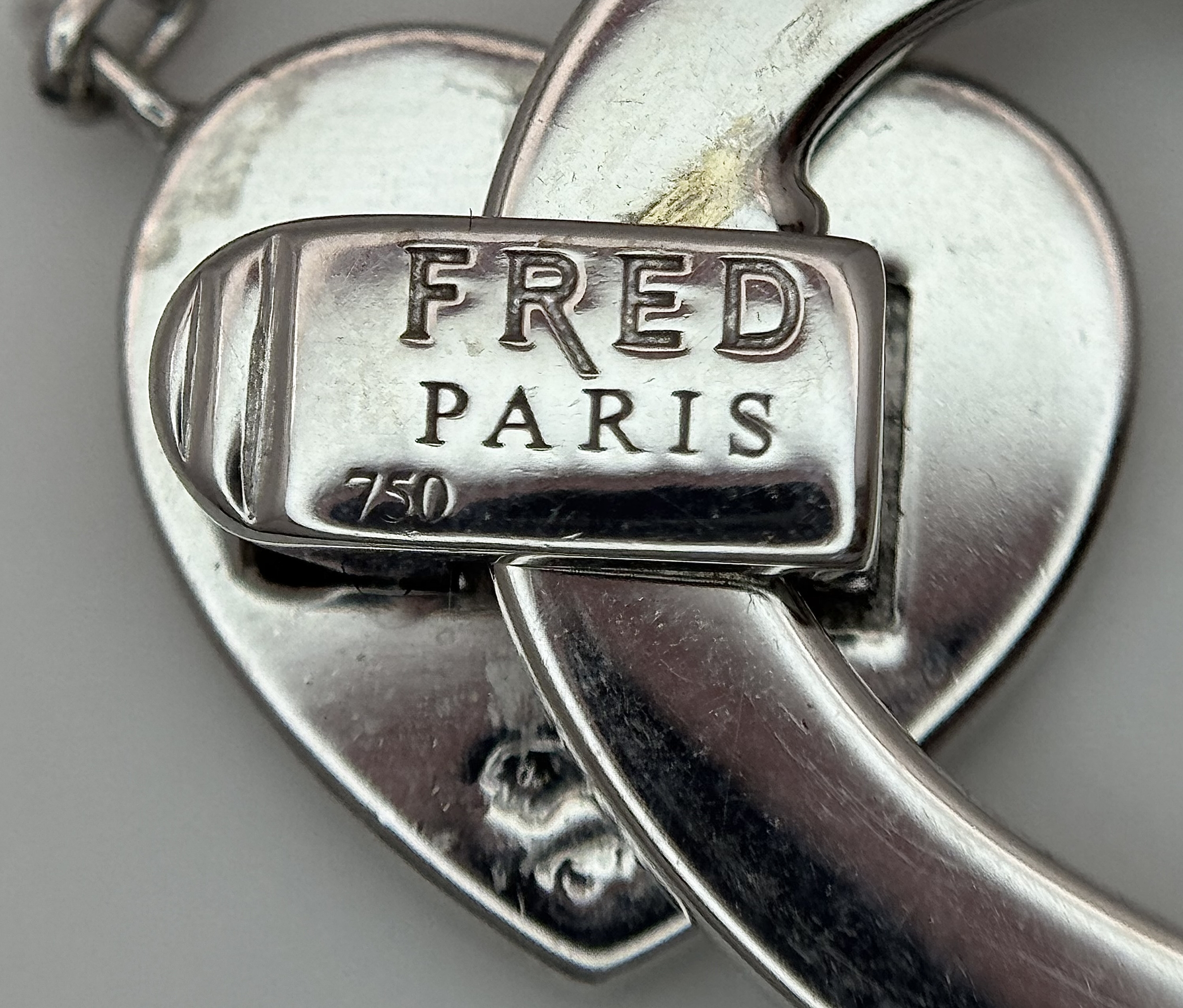 An 18K White Gold and Diamond "Fred of Paris" Designer Necklace with Double Heart Pendant. 3 x 2cm pendant. 40cm necklace. 12.9g. MT78.