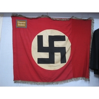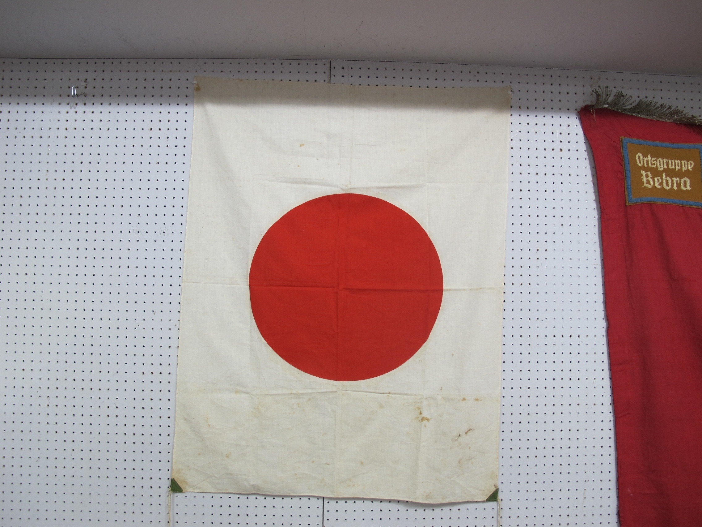 Japanese National Flag, tabs and ties to two corners, some staining, approximately 71 x 90cm