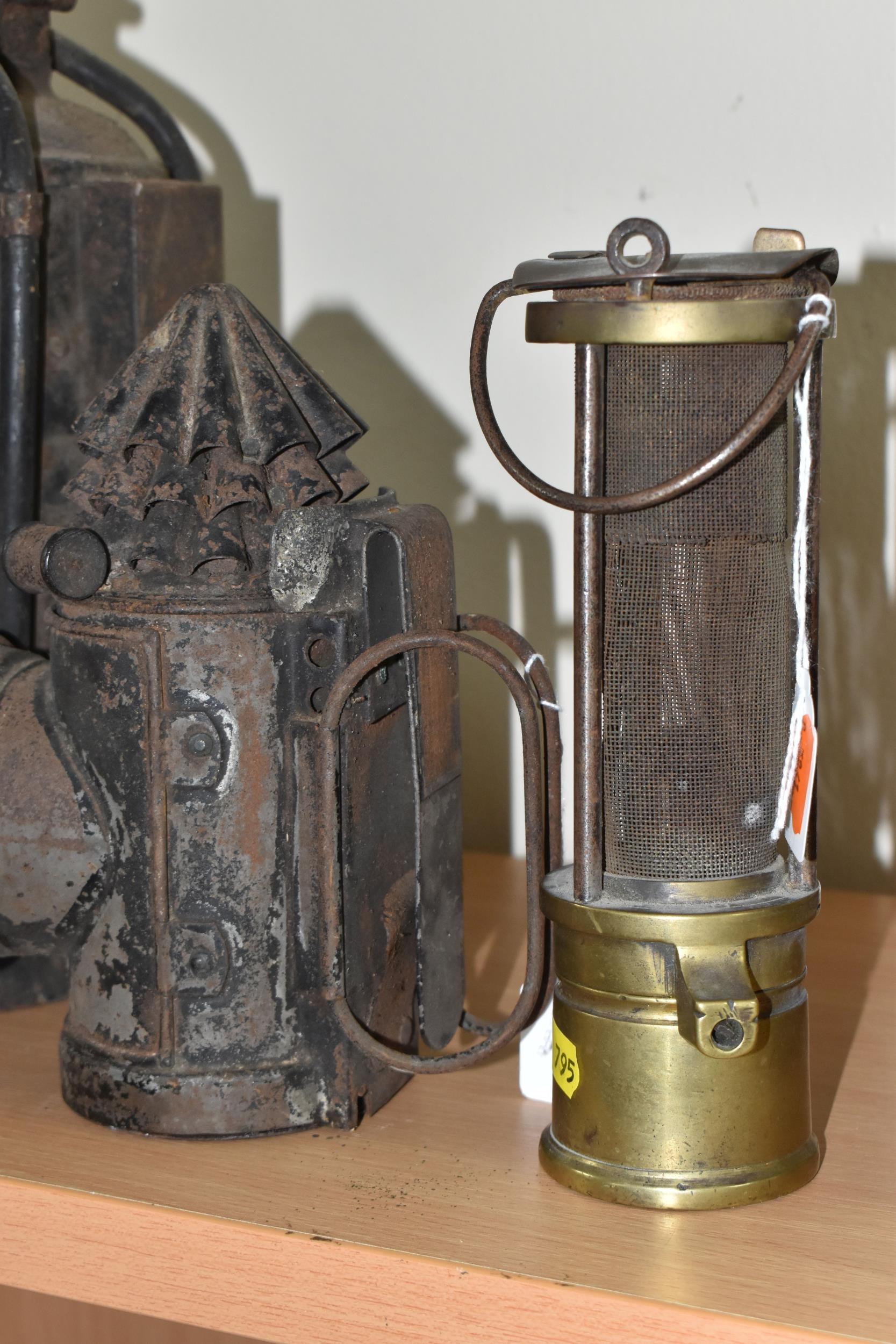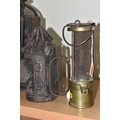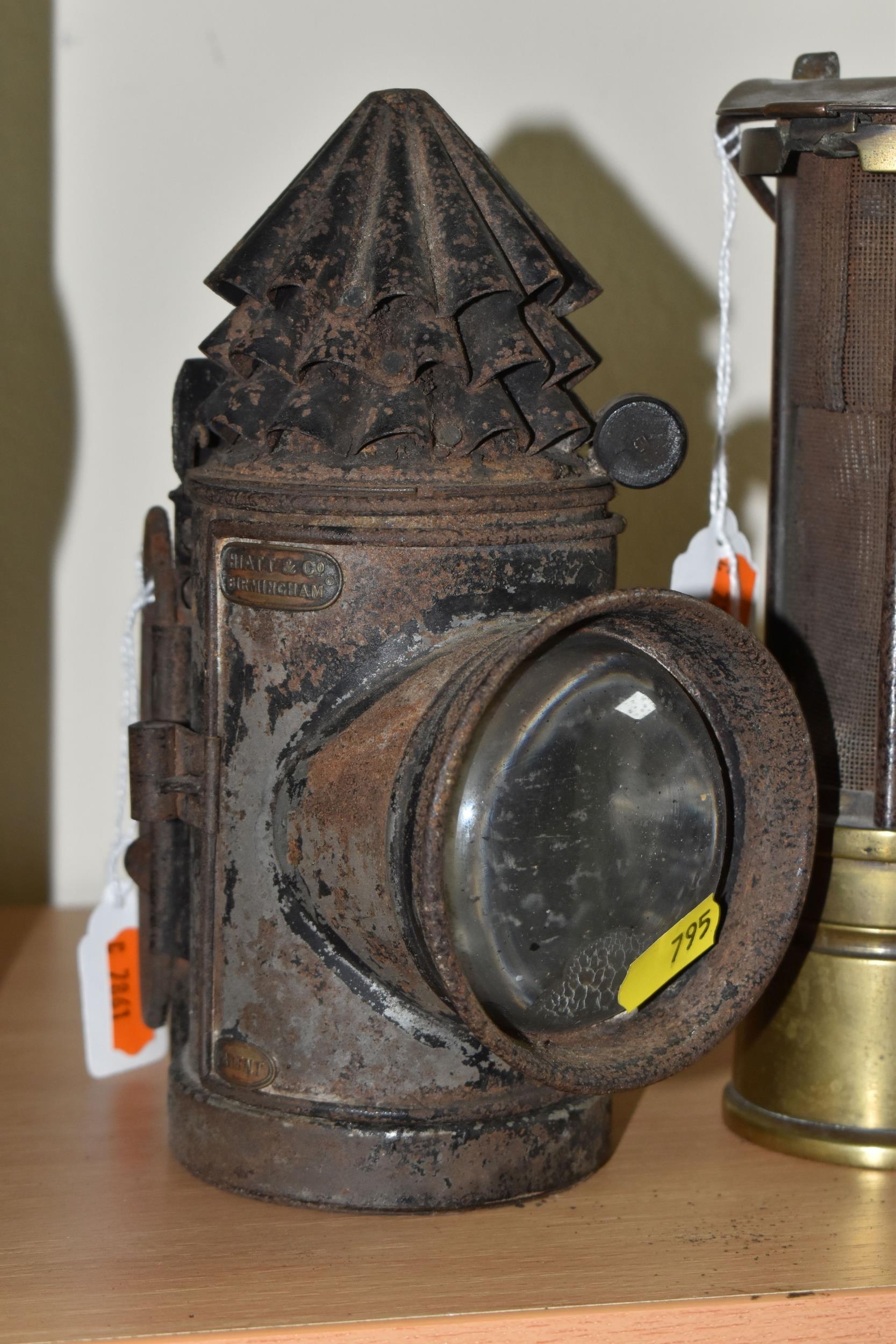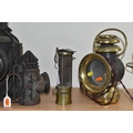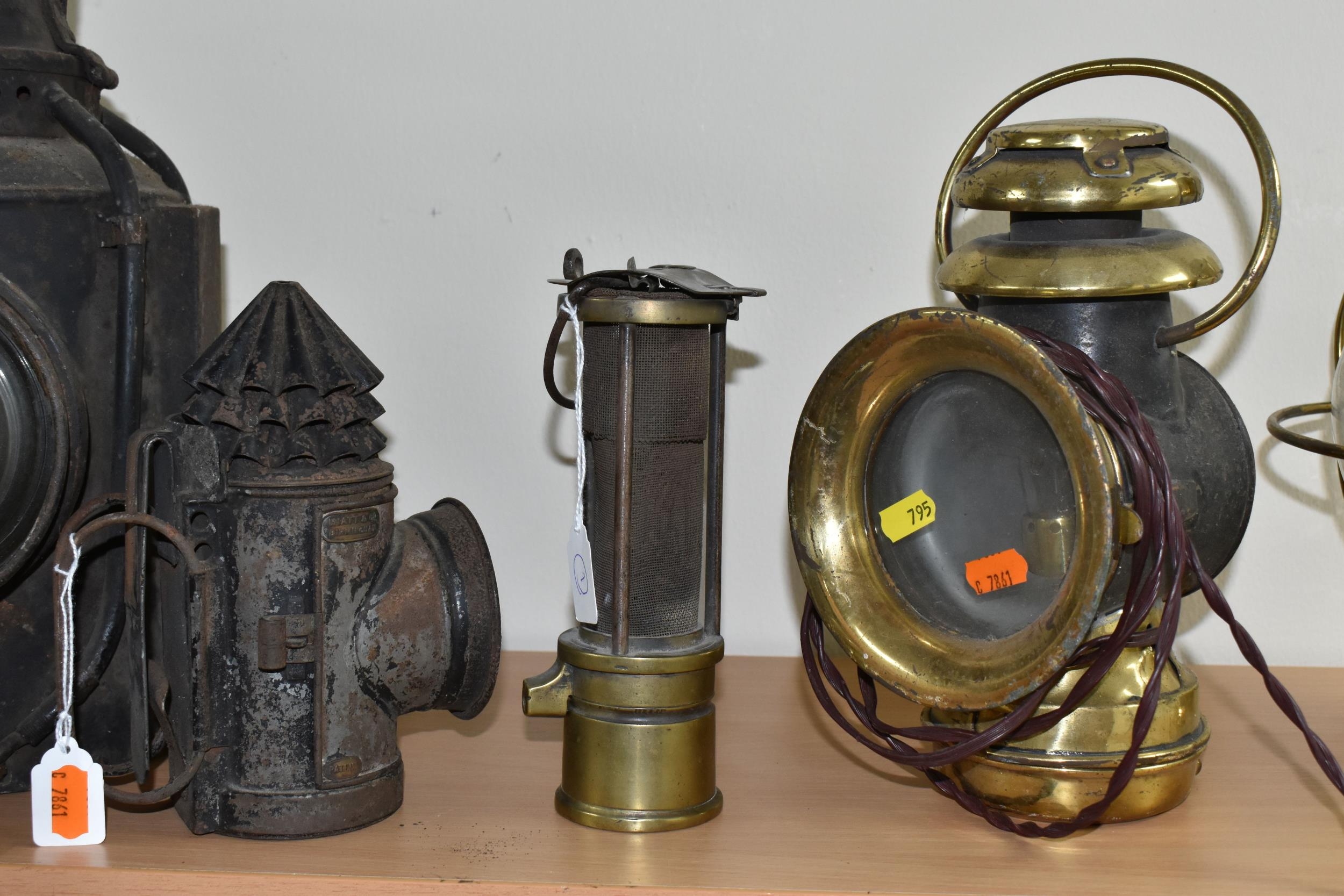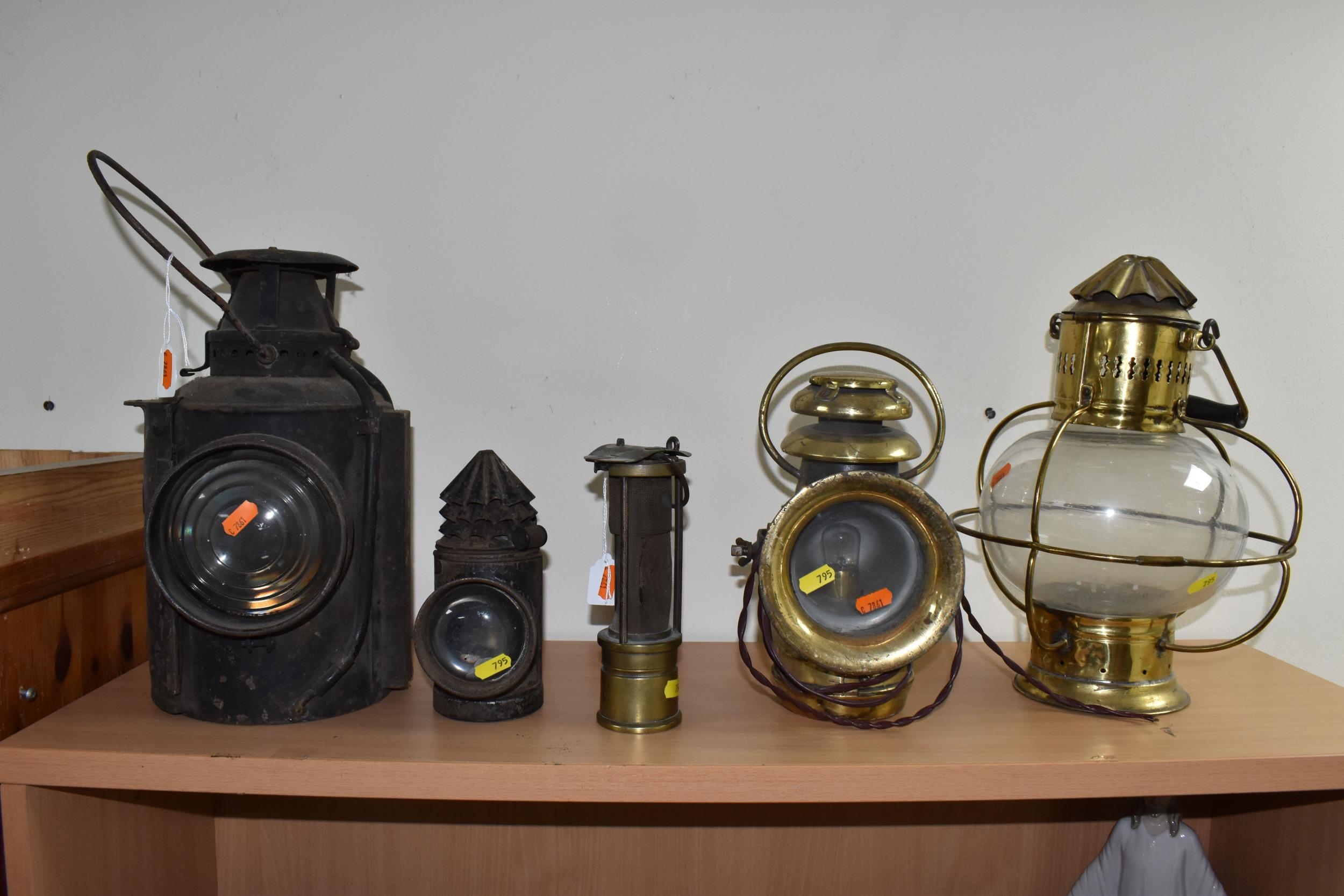 A GROUP OF LAMPS, comprising a Midland Railway Co lamp, height approximately 33cm excluding handle, a brass Davy lamp, a Hiatt & Co, Birmingham lamp, a car electric side lamp (untested), and part of an oil lamp with clear glass shade (5) (Condition Report: all af, sd, wear, etc)