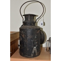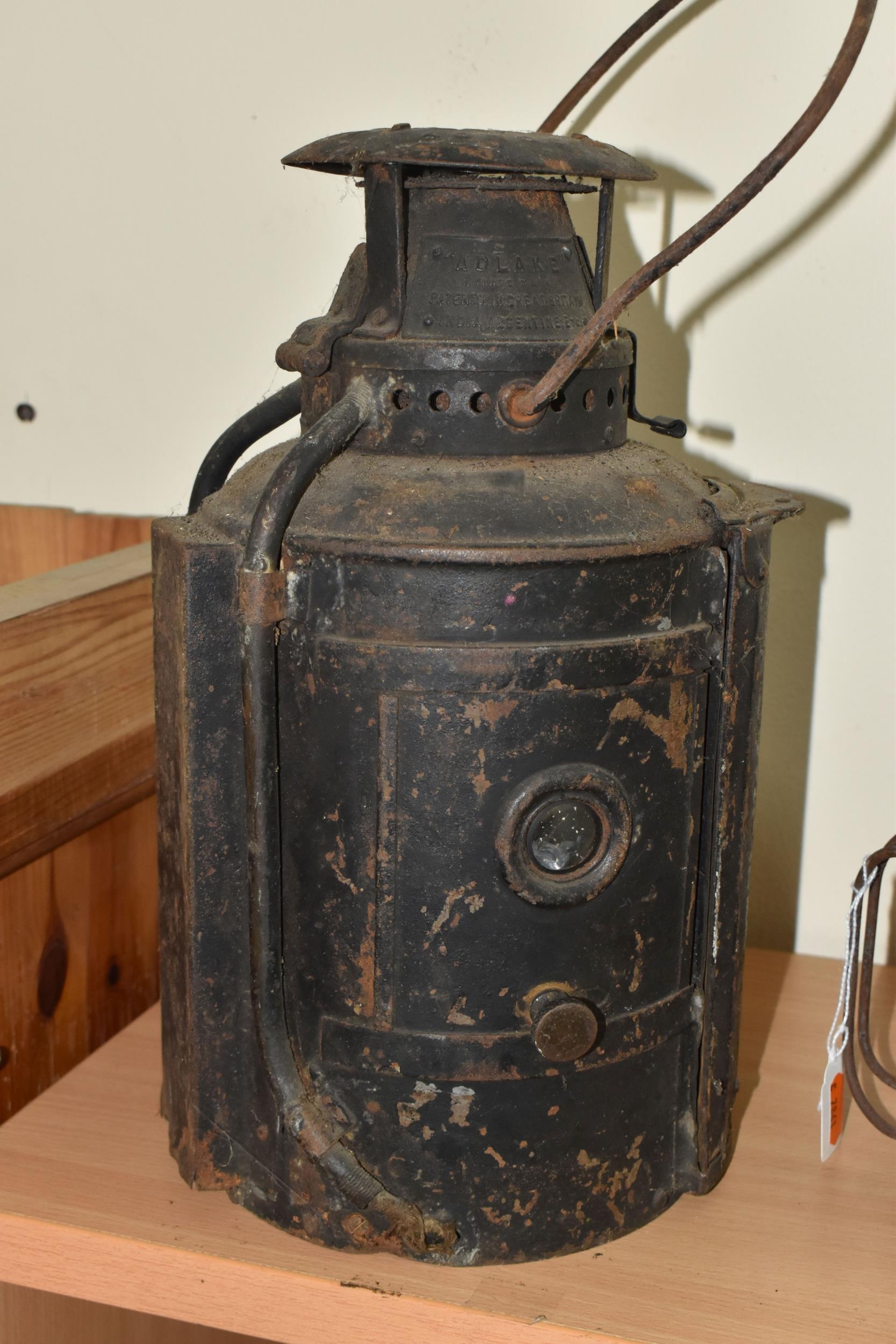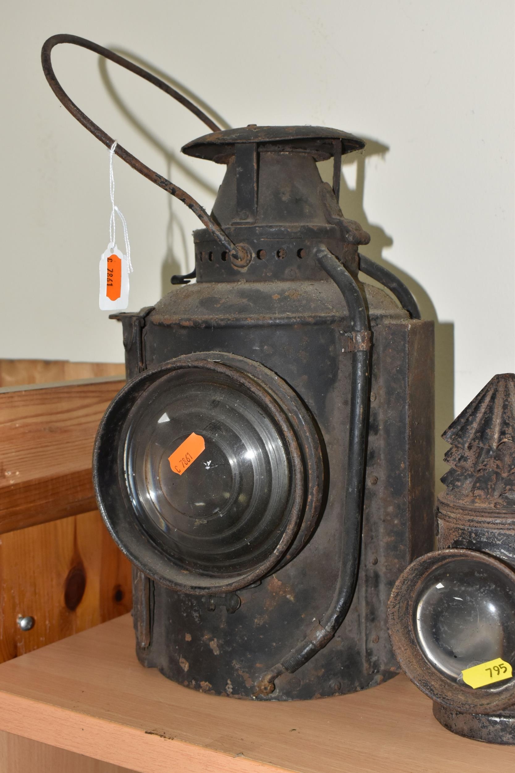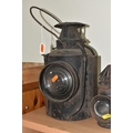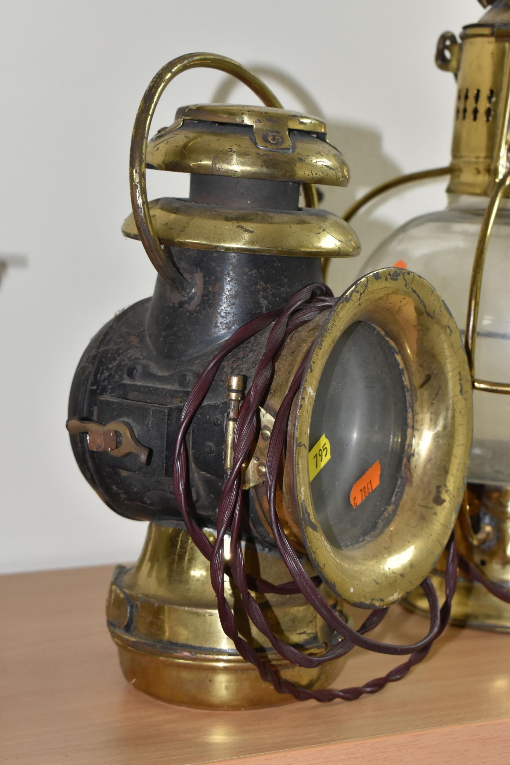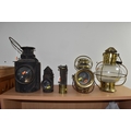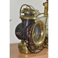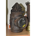 A GROUP OF LAMPS, comprising a Midland Railway Co lamp, height approximately 33cm excluding handle, a brass Davy lamp, a Hiatt & Co, Birmingham lamp, a car electric side lamp (untested), and part of an oil lamp with clear glass shade (5) (Condition Report: all af, sd, wear, etc)