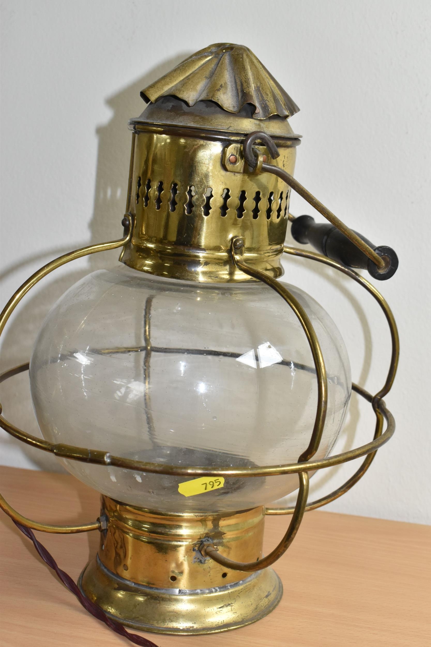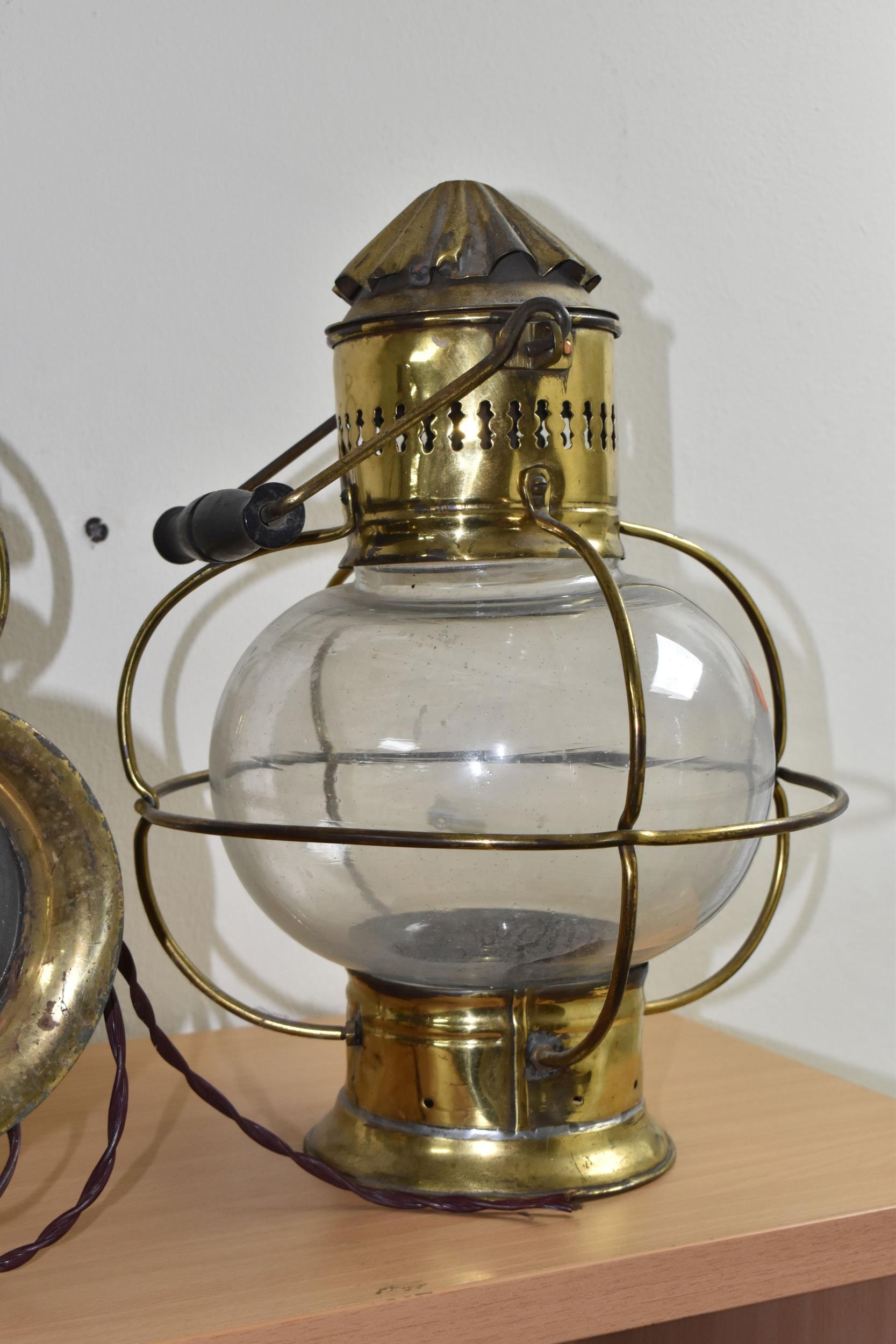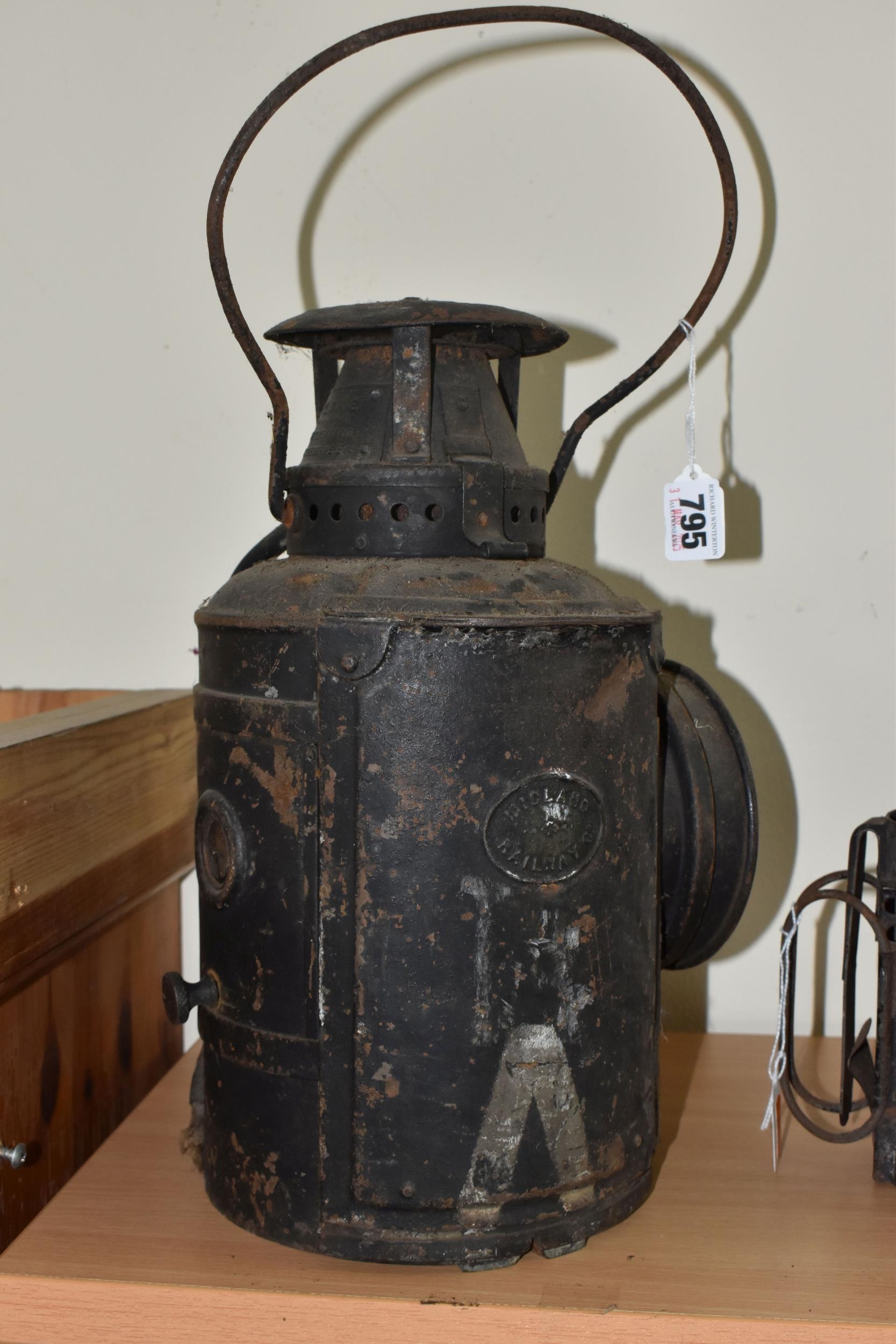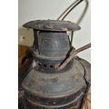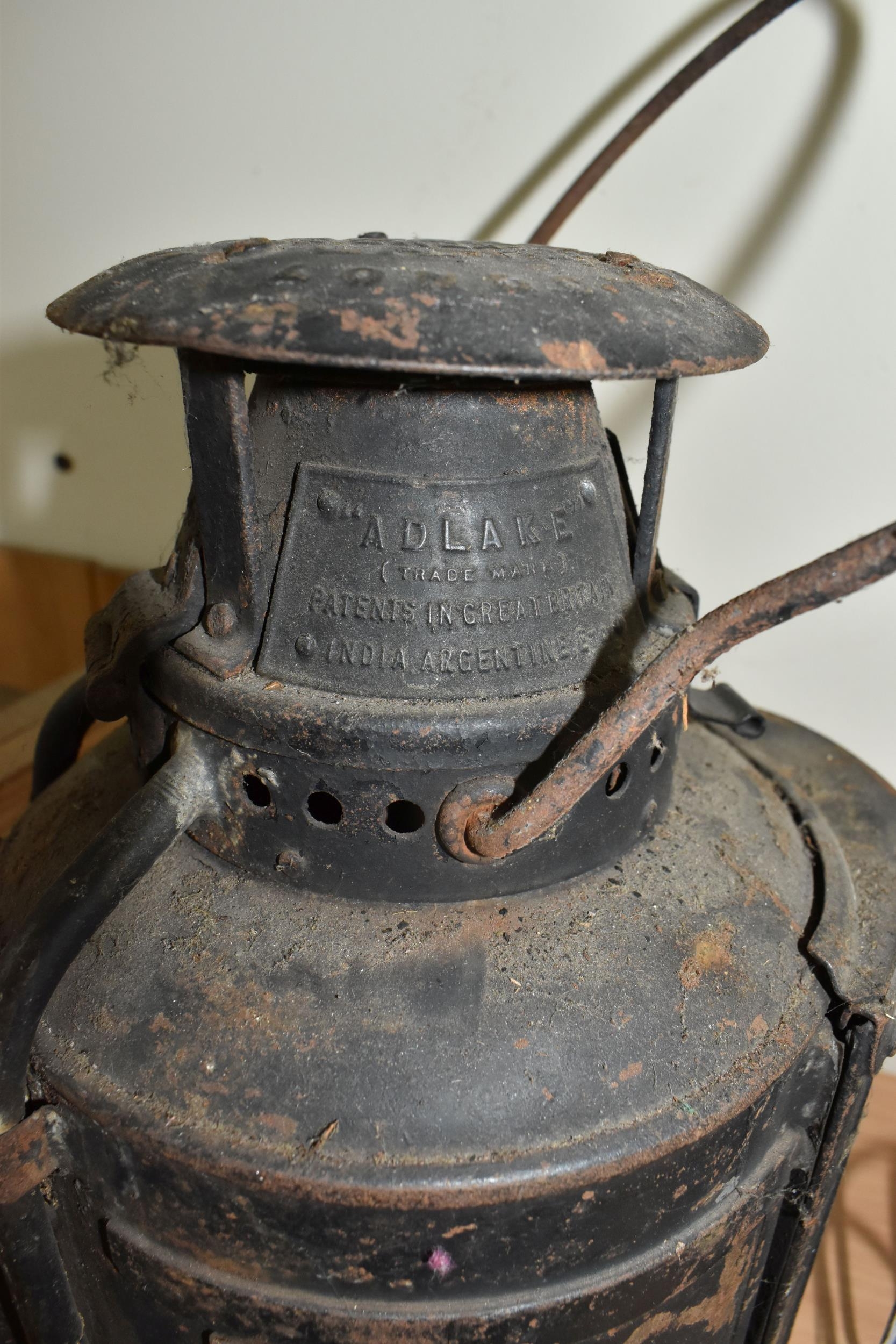 A GROUP OF LAMPS, comprising a Midland Railway Co lamp, height approximately 33cm excluding handle, a brass Davy lamp, a Hiatt & Co, Birmingham lamp, a car electric side lamp (untested), and part of an oil lamp with clear glass shade (5) (Condition Report: all af, sd, wear, etc)