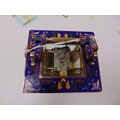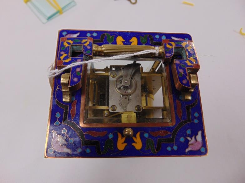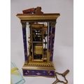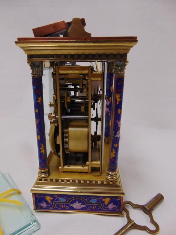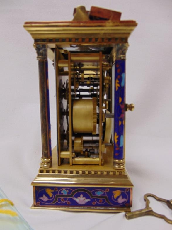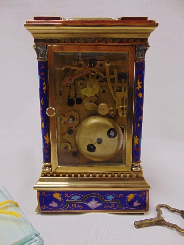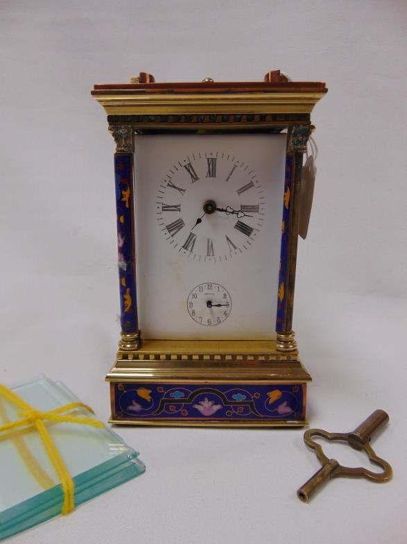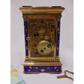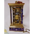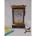 French gilt metal and enamel carriage clock, 8 day movement with alarm 7" high.