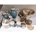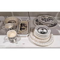 Royal Doulton Desert Star pattern part coffee service, mid-century, printed brown marks B.6430, each printed to the centre with radiating brown stars reserved on a cream and blue ground, comprising a baluster coffee pot and cover, a milk jug, a sugar bowl, a slop bowl, 11 coffee cups and 12 saucers together with five Staffordshire pottery Pratt-type pot lids, variously printed, one with the Master of the Hounds, Uncle Toby, The Times and others and a Doulton Bill Sykes pattern Queensware footed comport