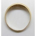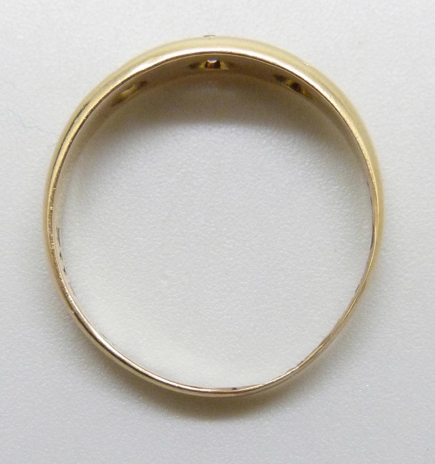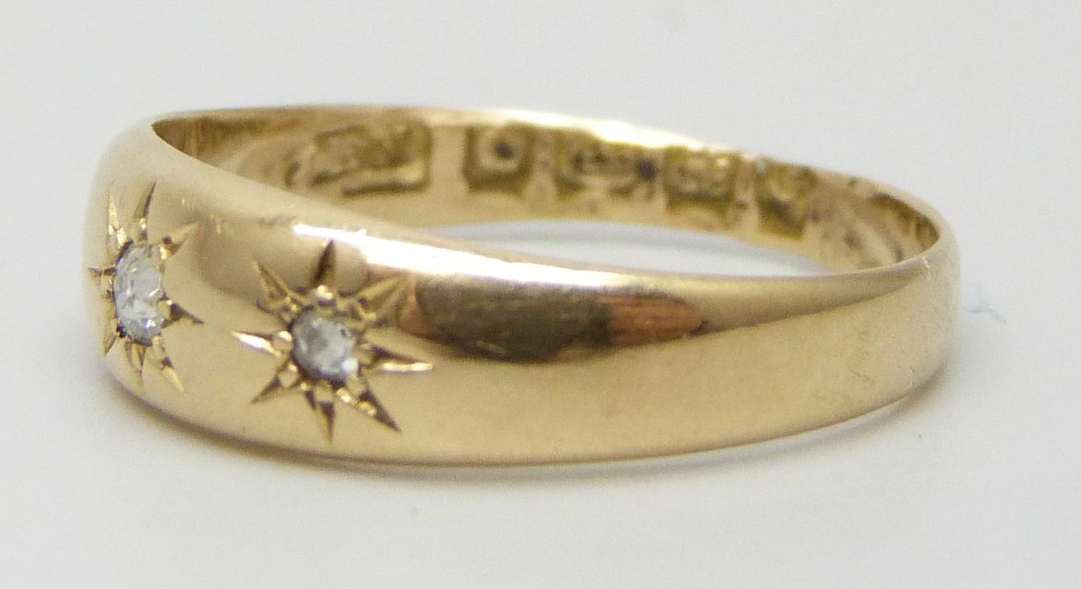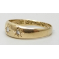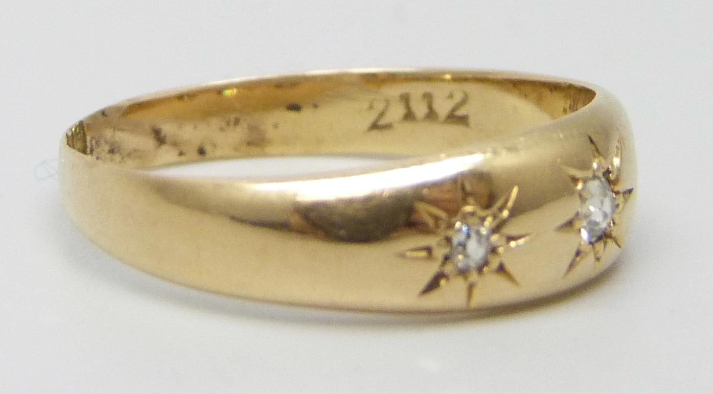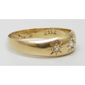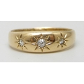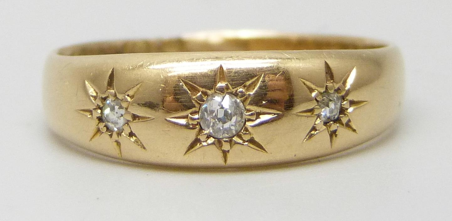 An 18ct gold three stone diamond gypsy ring, shank altered, partial hallmarks, Birmingham, 1902, 2.7g, O