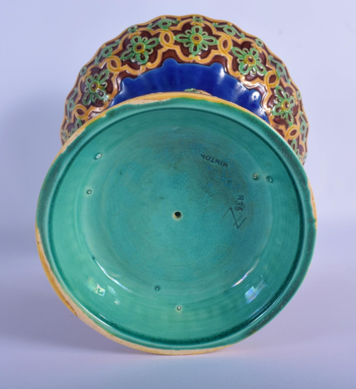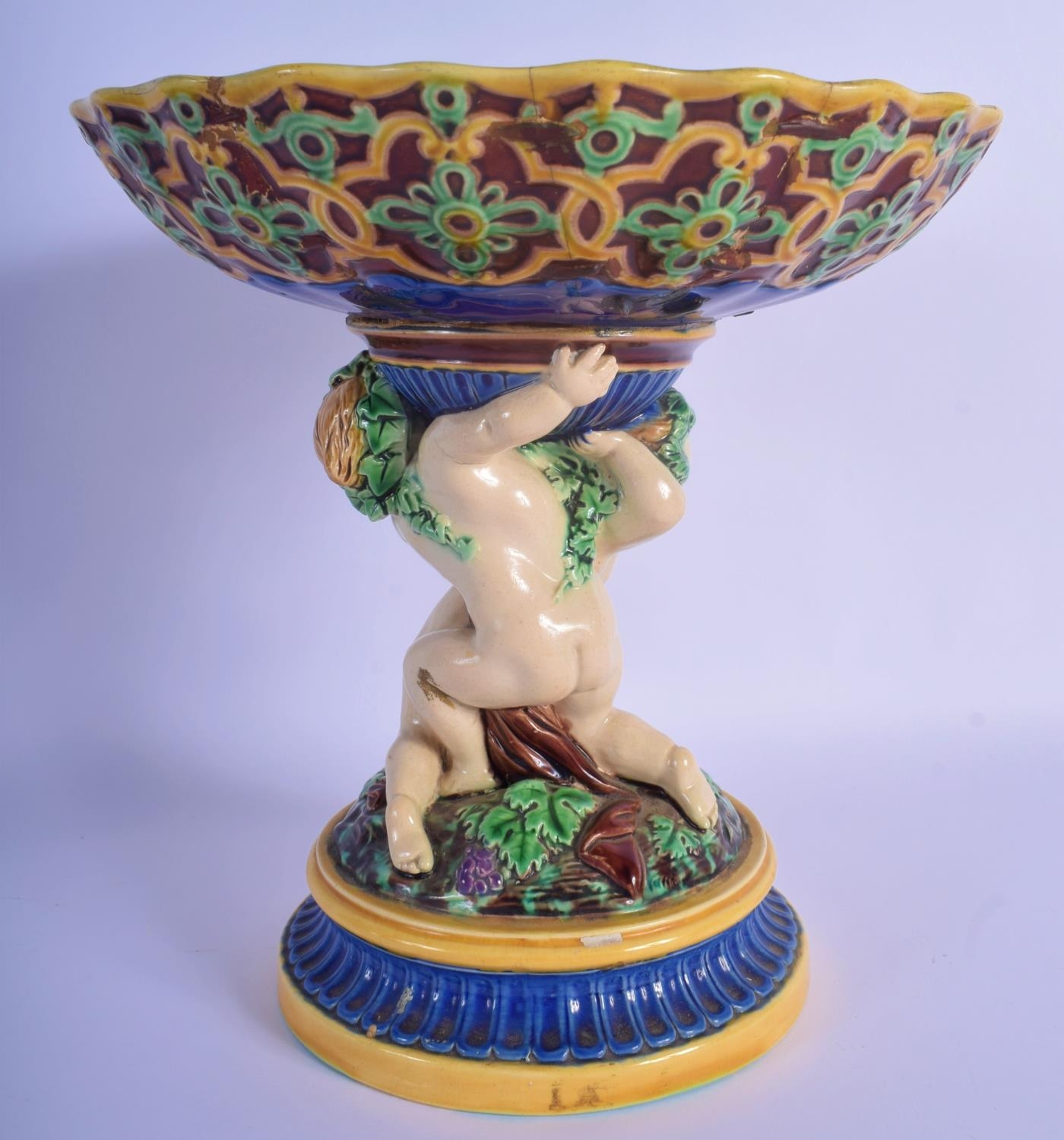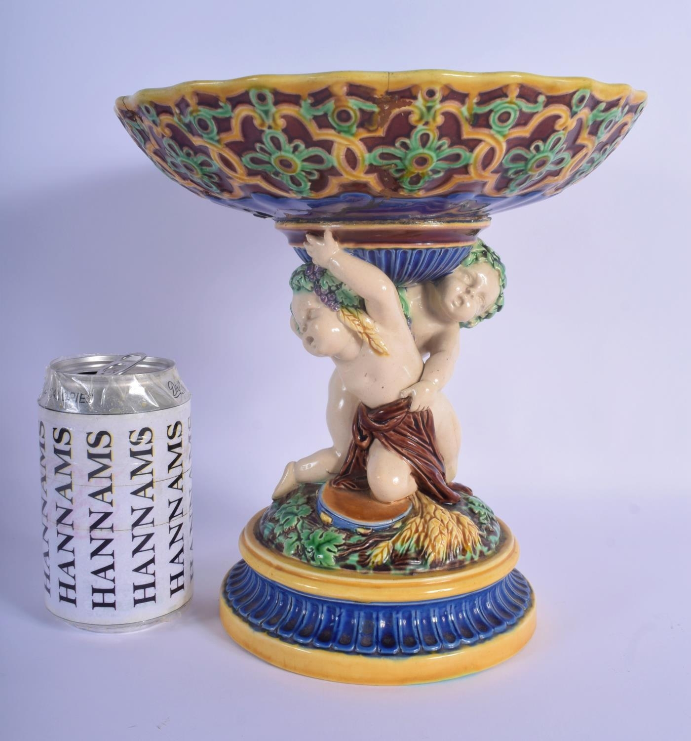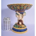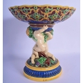 A 19TH MINTON MAJOLICA PEDESTAL DOUPLE PUTTI CENTREPIECE modelled upon a base overlaid with flowers. 23 cm x 21 cm.