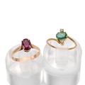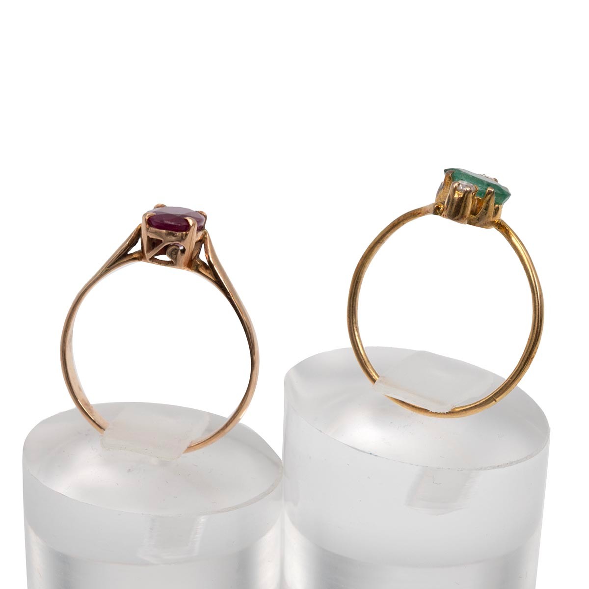 Two 9ct gold rings, one set with a ruby and the other an eme...