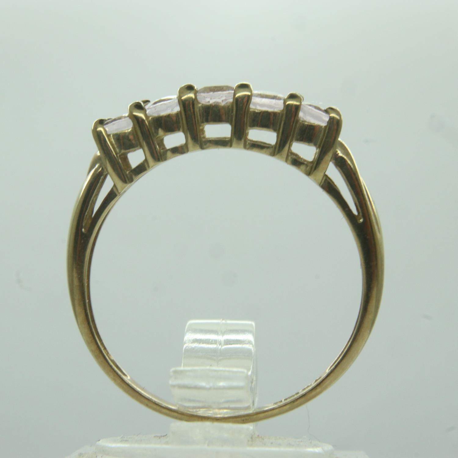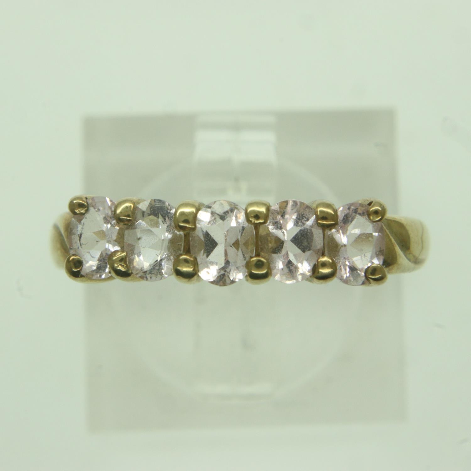 9ct gold five-stone ring set with pink tourmaline, size O, 1.8g. UK P&P Group 0 (£6+VAT for the first lot and £1+VAT for subsequent lots)