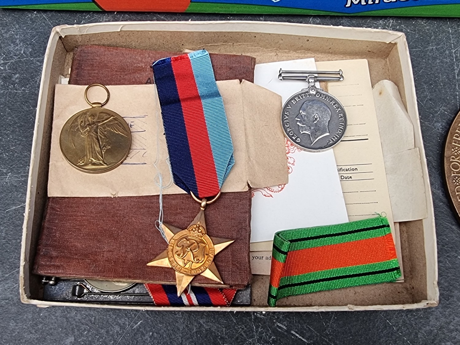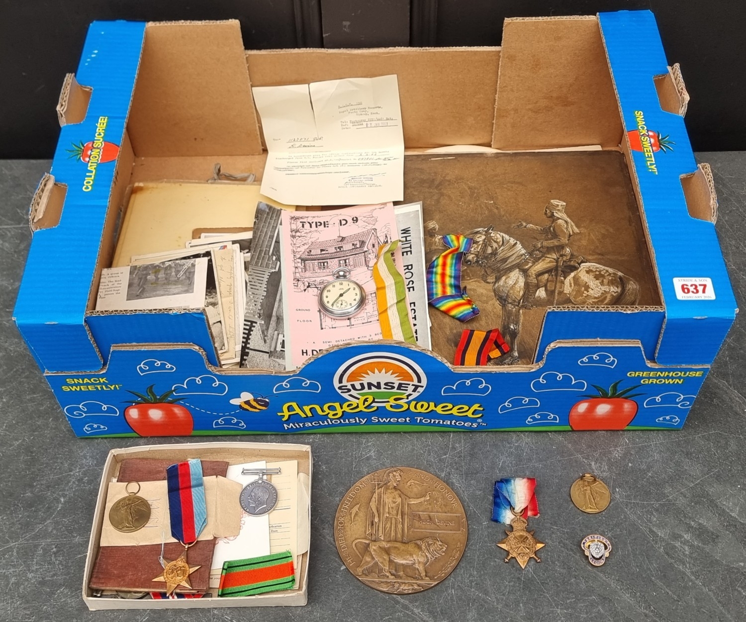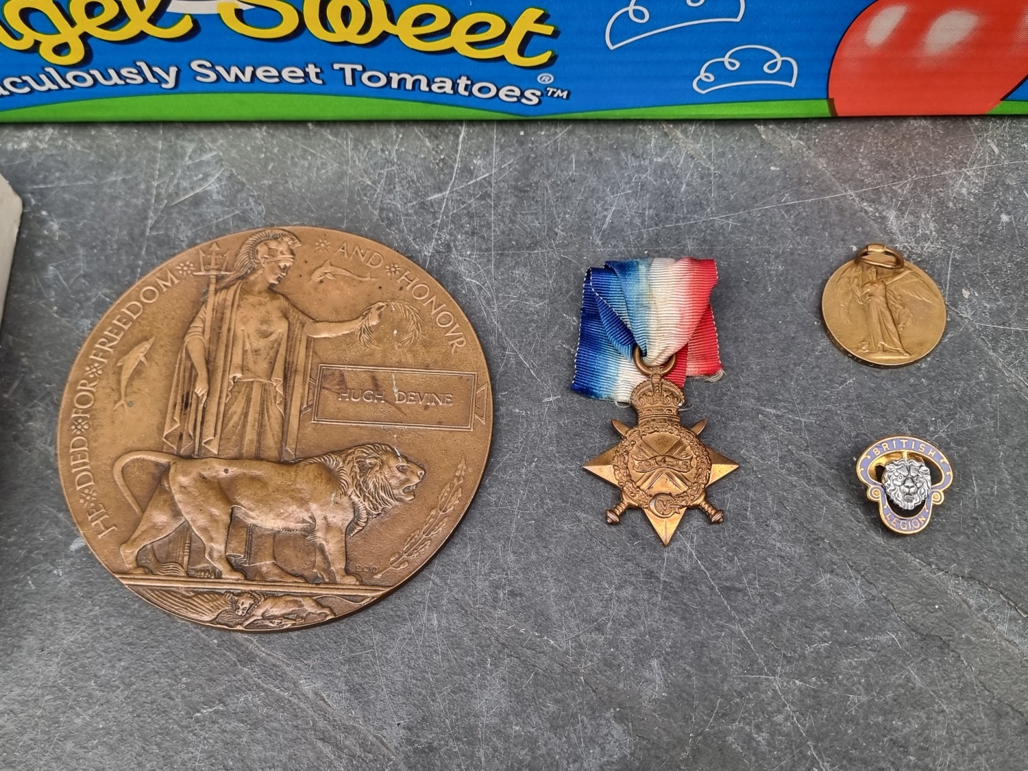 Medals: a WWII group of four, to 1123071 Hugh Devine, 181 Field Regiment R.A; together with associated ephemera, to include his personal diary for 1944; Royal Artillery Christmas cards for 1944 and 1945; various wartime and other photographs; and a WWI Memorial Plaque and Victory Medal, (possibly belonging to his father). (qty)