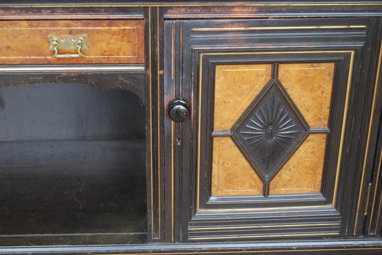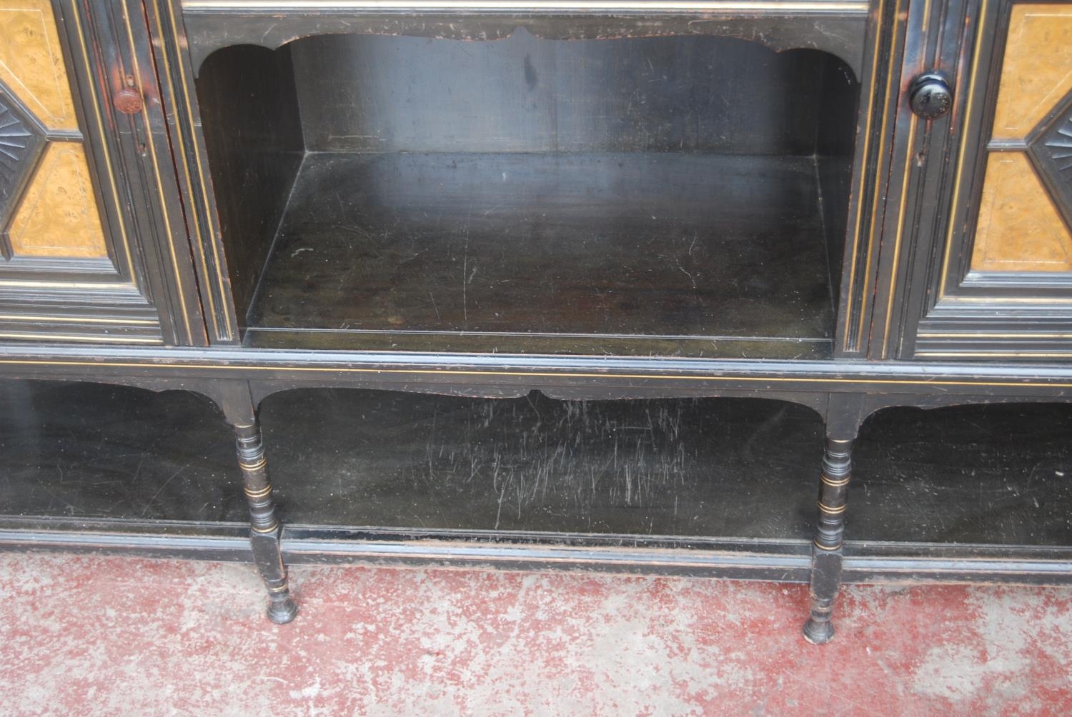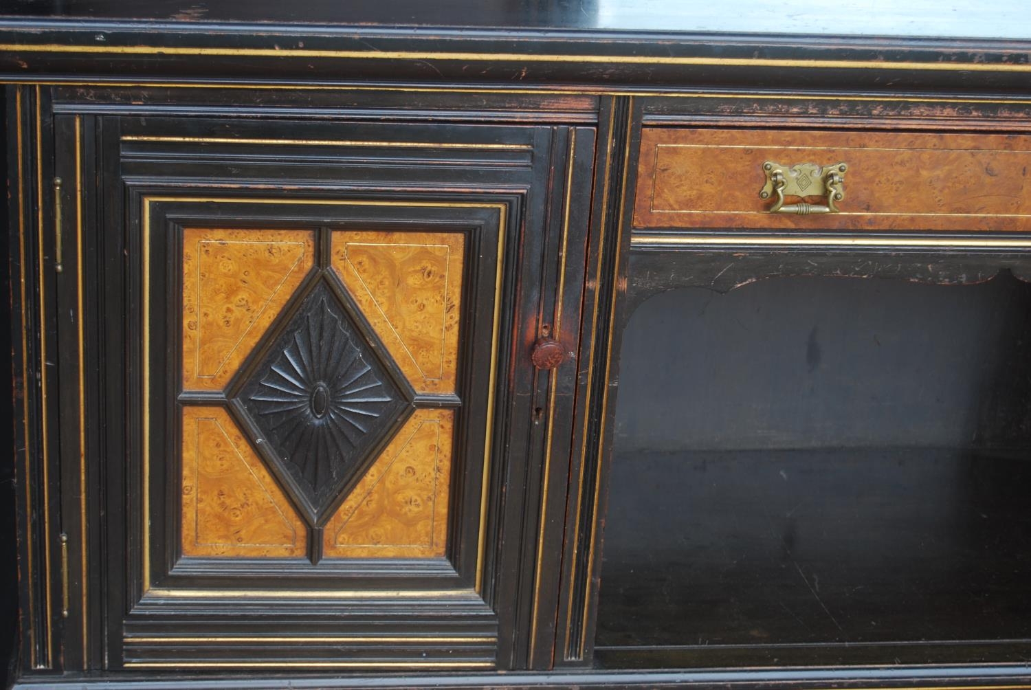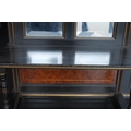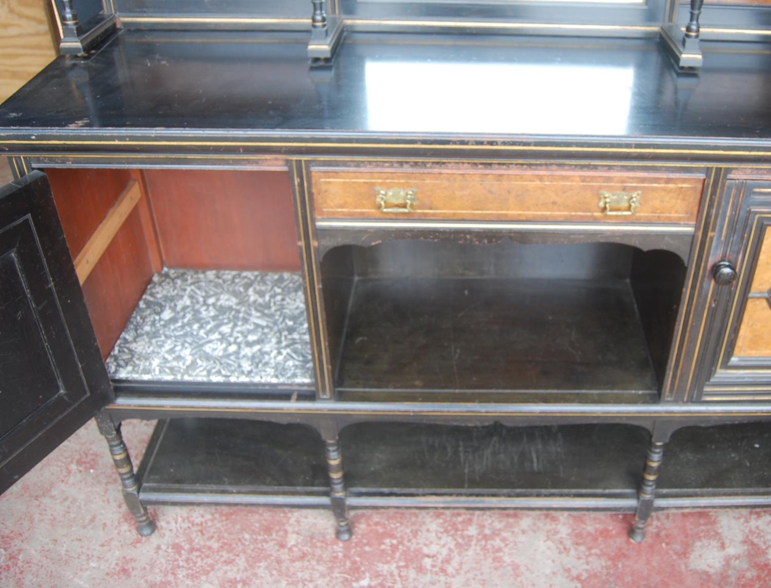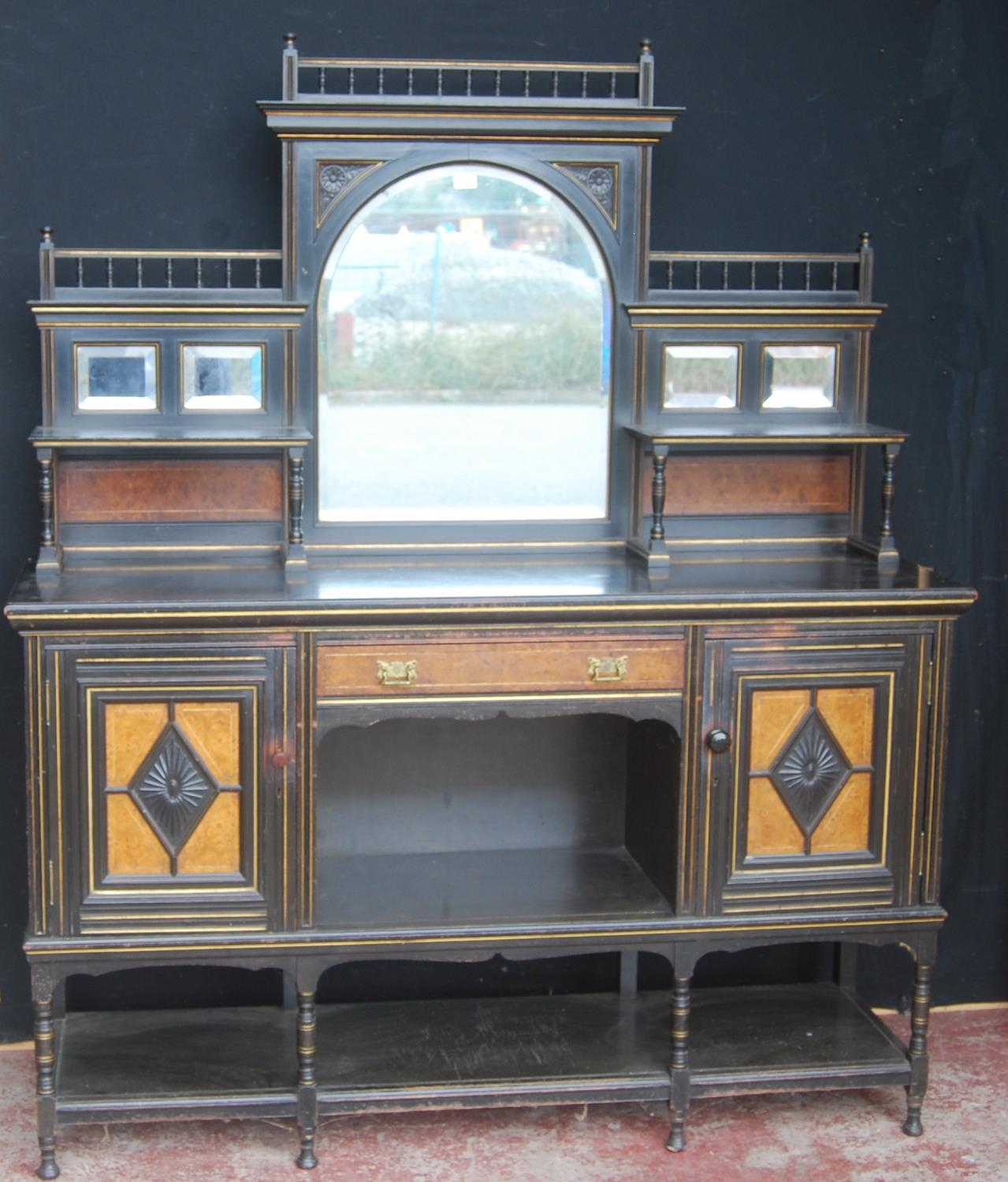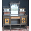 Late 19th century Aesthetic Movement ebonised and walnut drawing room cabinet, the top section with a central arched mirror flanked by two small mirrored panels above an open shelf, decorated with turned balustrade columns, the lower section with a central drawer above an open recess flanked by cupboard doors above an undertier, 196cm high, 153cm wide and 46cm deep.